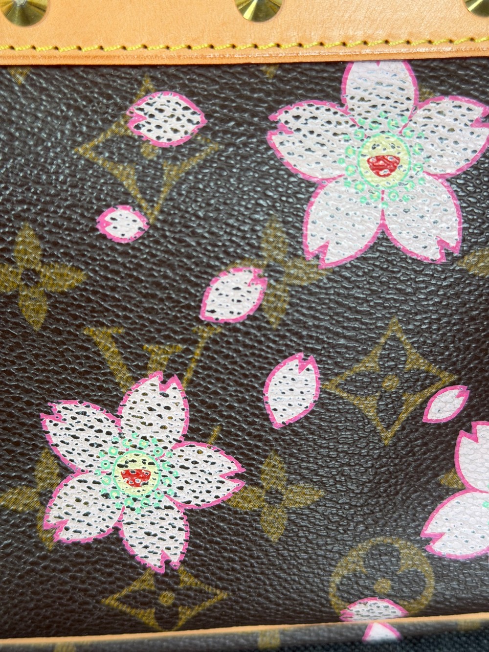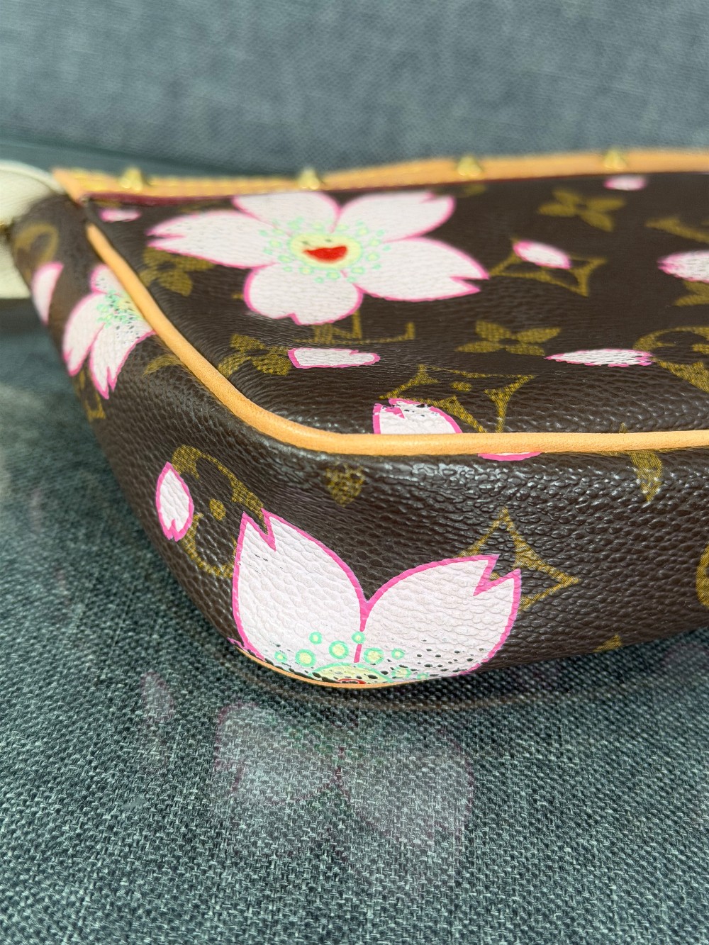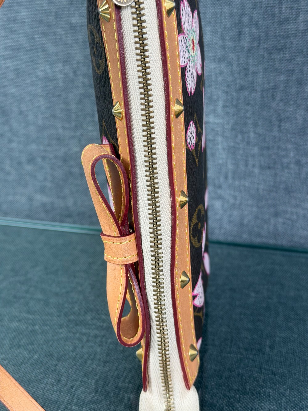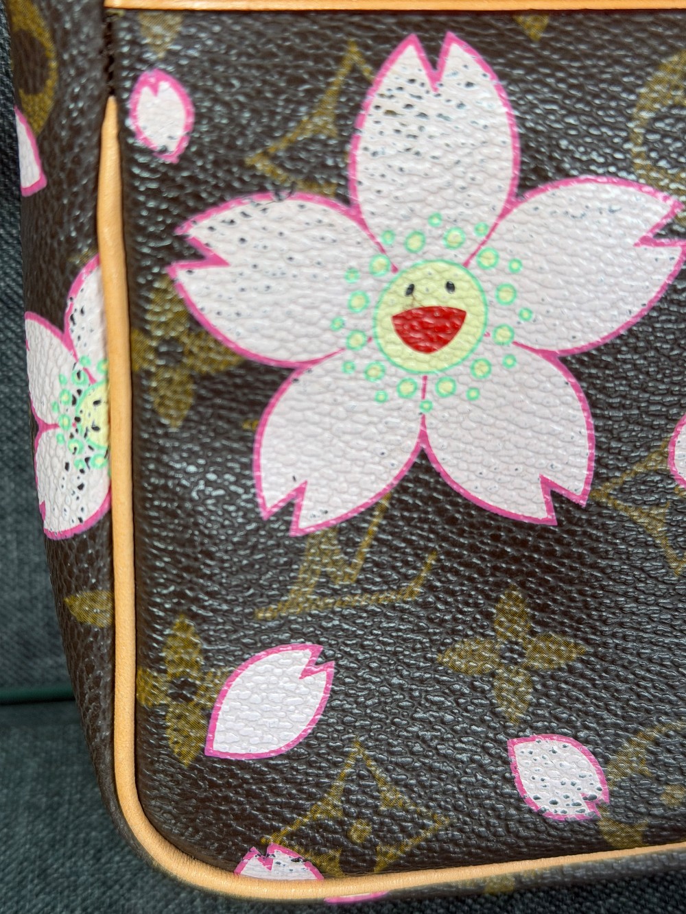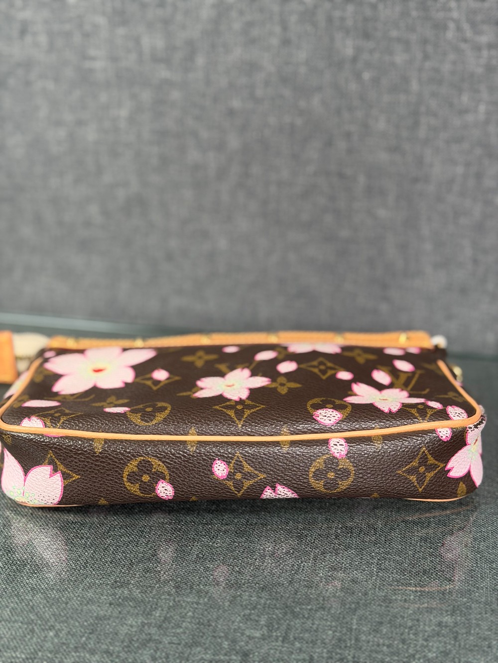 This is an authentic LOUIS VUITTON LV X TM Monogram Cherry Blossom Pochette Accessories in Sakura Brown. In collaboration with artist Takashi Murakami, this chic pochette is crafted of iconic Louis Vuitton monogram-coated canvas with cherry blossom motifs. The pouch features vachetta cowhide leather trim lined, a bow and a vachetta strap. The top zipper opens to a beige microfiber interior.