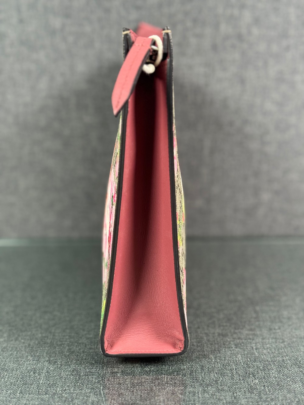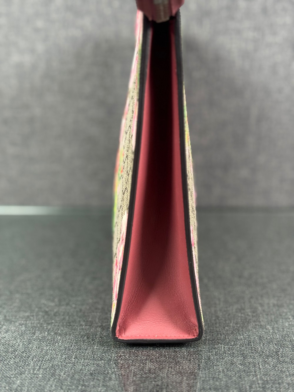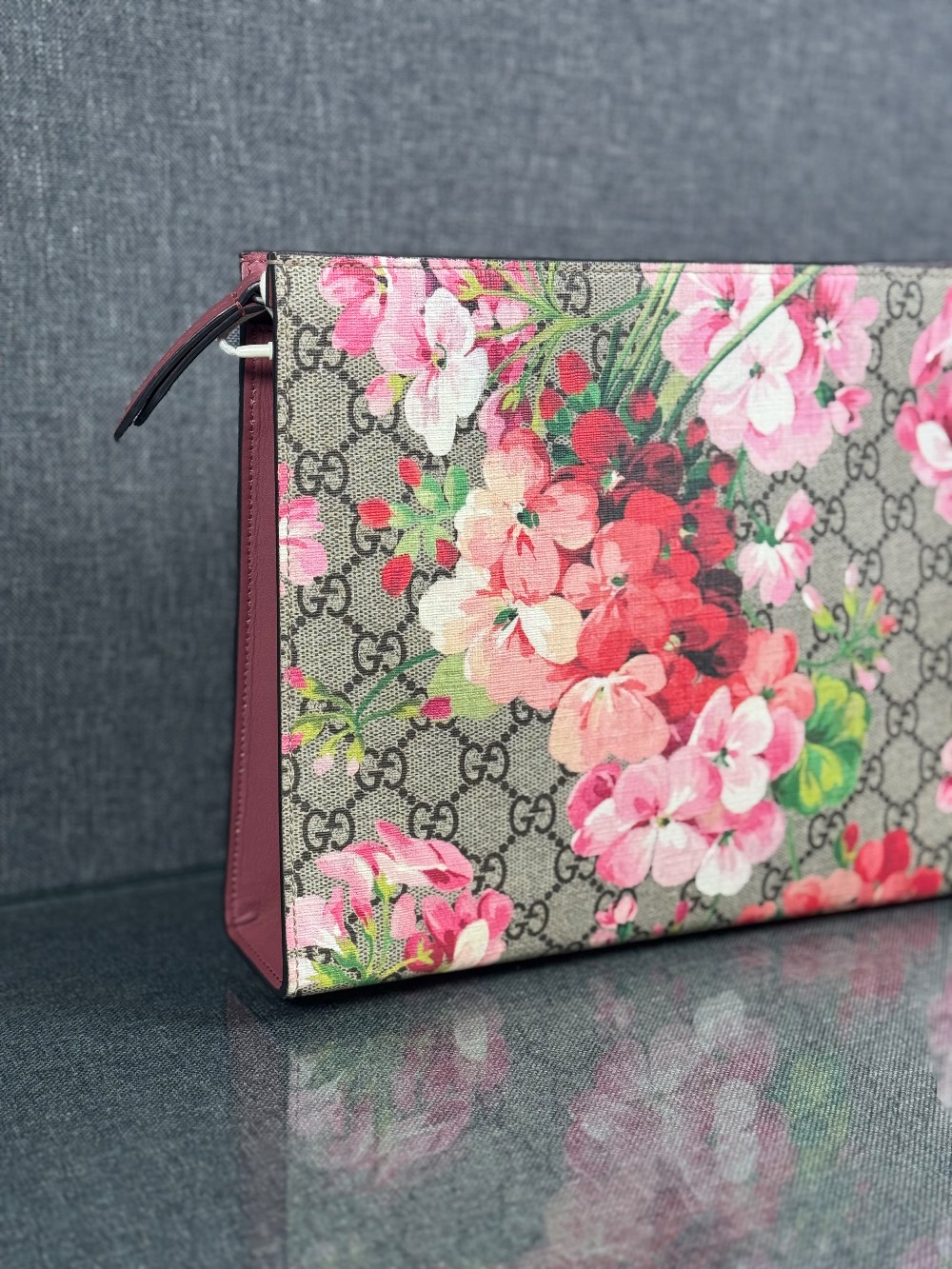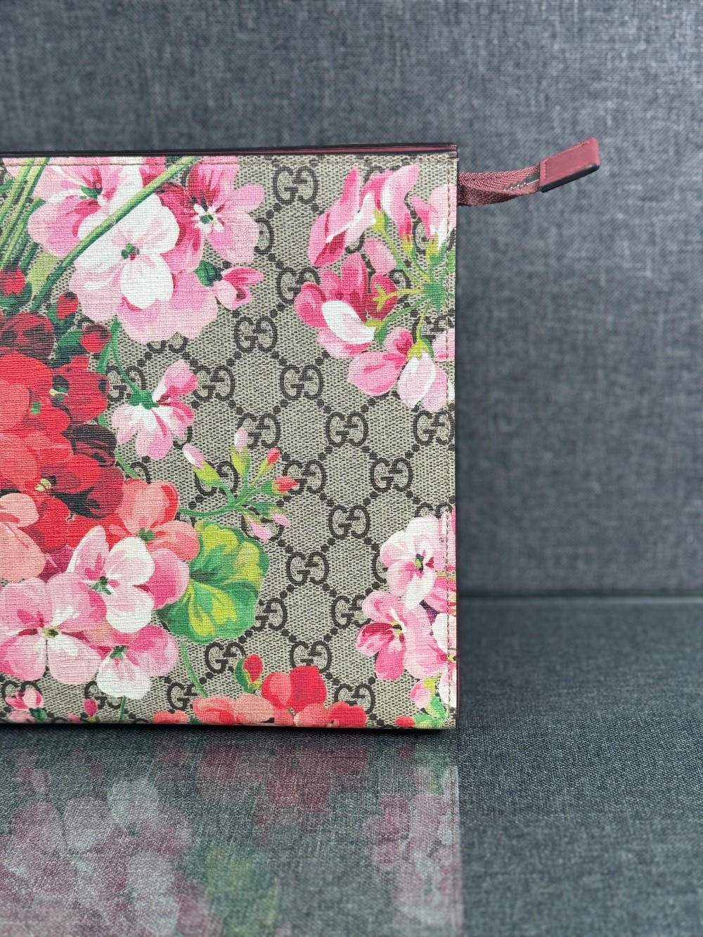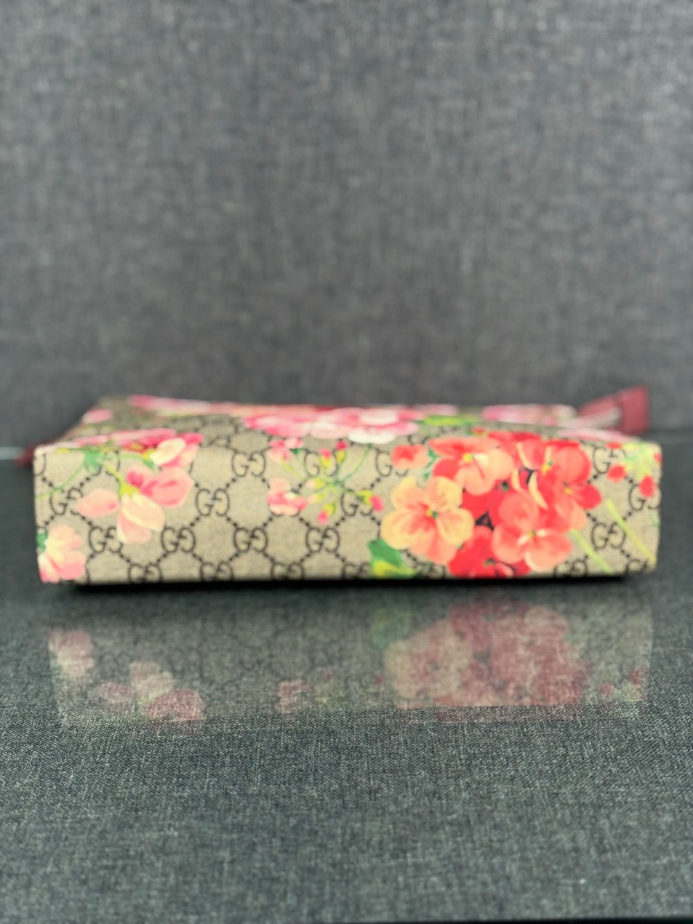 This is an authentic GUCCI GG Supreme Monogram Blooms Print Large Cosmetic Case in Antique Rose. This pouch is crafted of GG monogram coated canvas in brown and beige, with a pink floral overlay. The pouch features smooth rose pink leather sides and trim. The silver top zipper opens to a brown nylon interior with a patch pocket. This is a gorgeous cosmetic pouch, sure to get noticed, from Gucci!