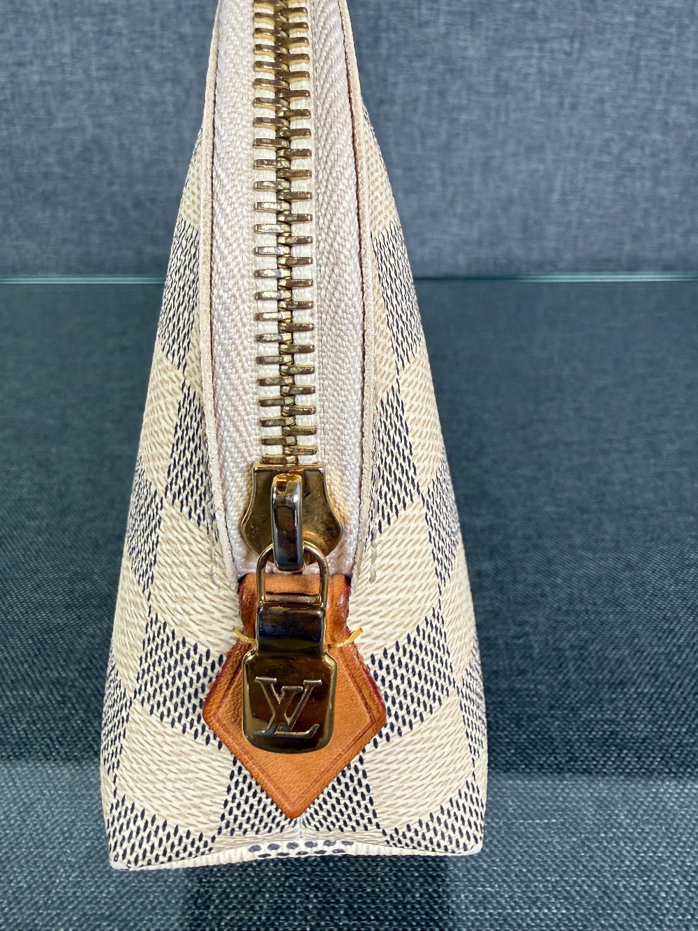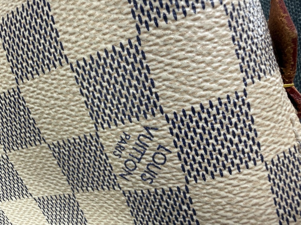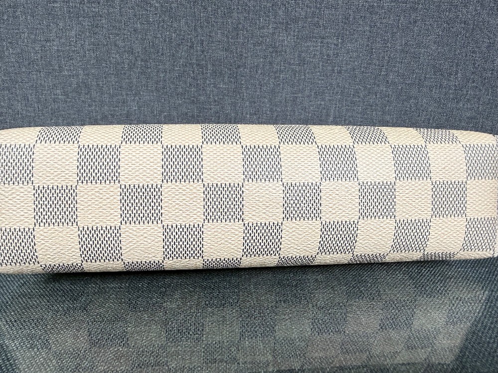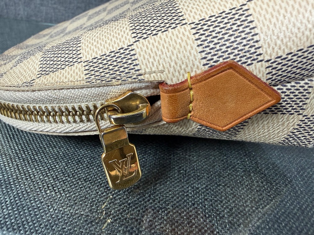 This is an authentic Louis Vuitton pouch. The pouch is crafted from Louis Vuitton's signature Damier Azur coated canvas, featuring a checkered pattern in white and light grey/blue tones.
