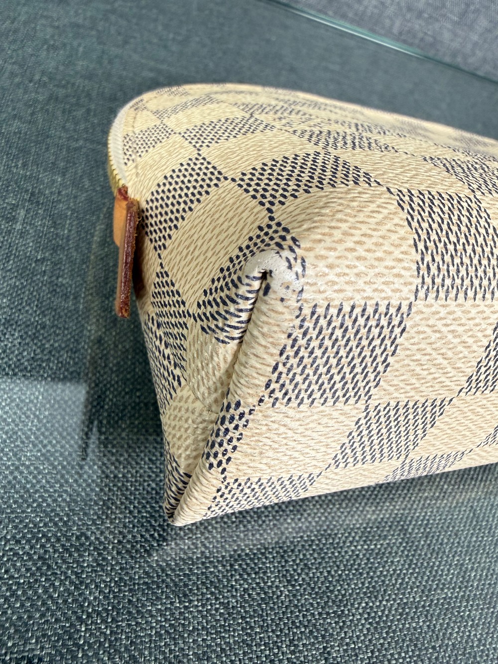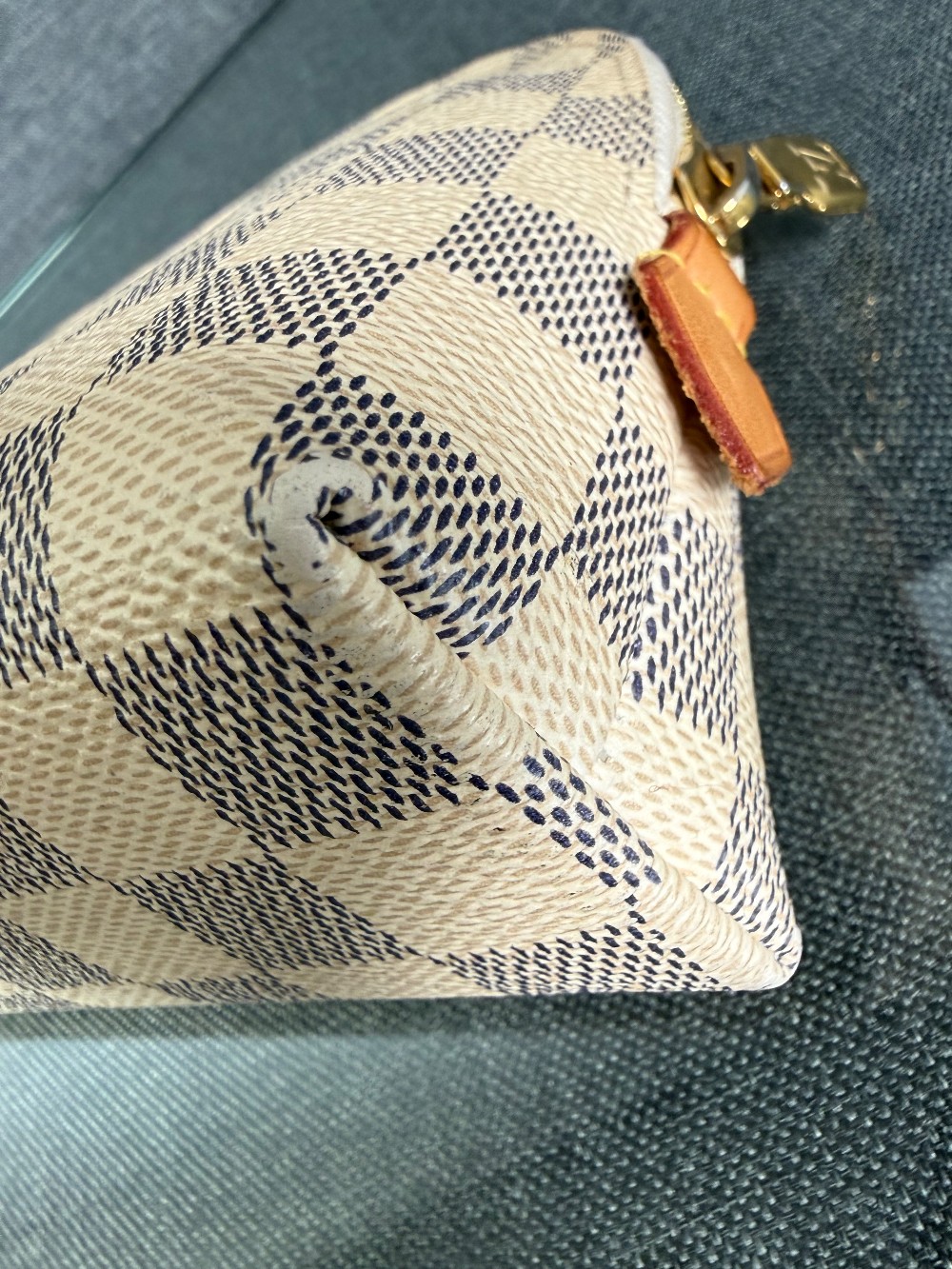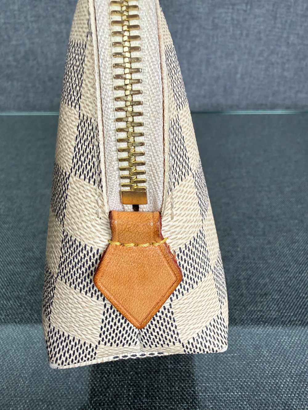 This is an authentic Louis Vuitton pouch. The pouch is crafted from Louis Vuitton's signature Damier Azur coated canvas, featuring a checkered pattern in white and light grey/blue tones.