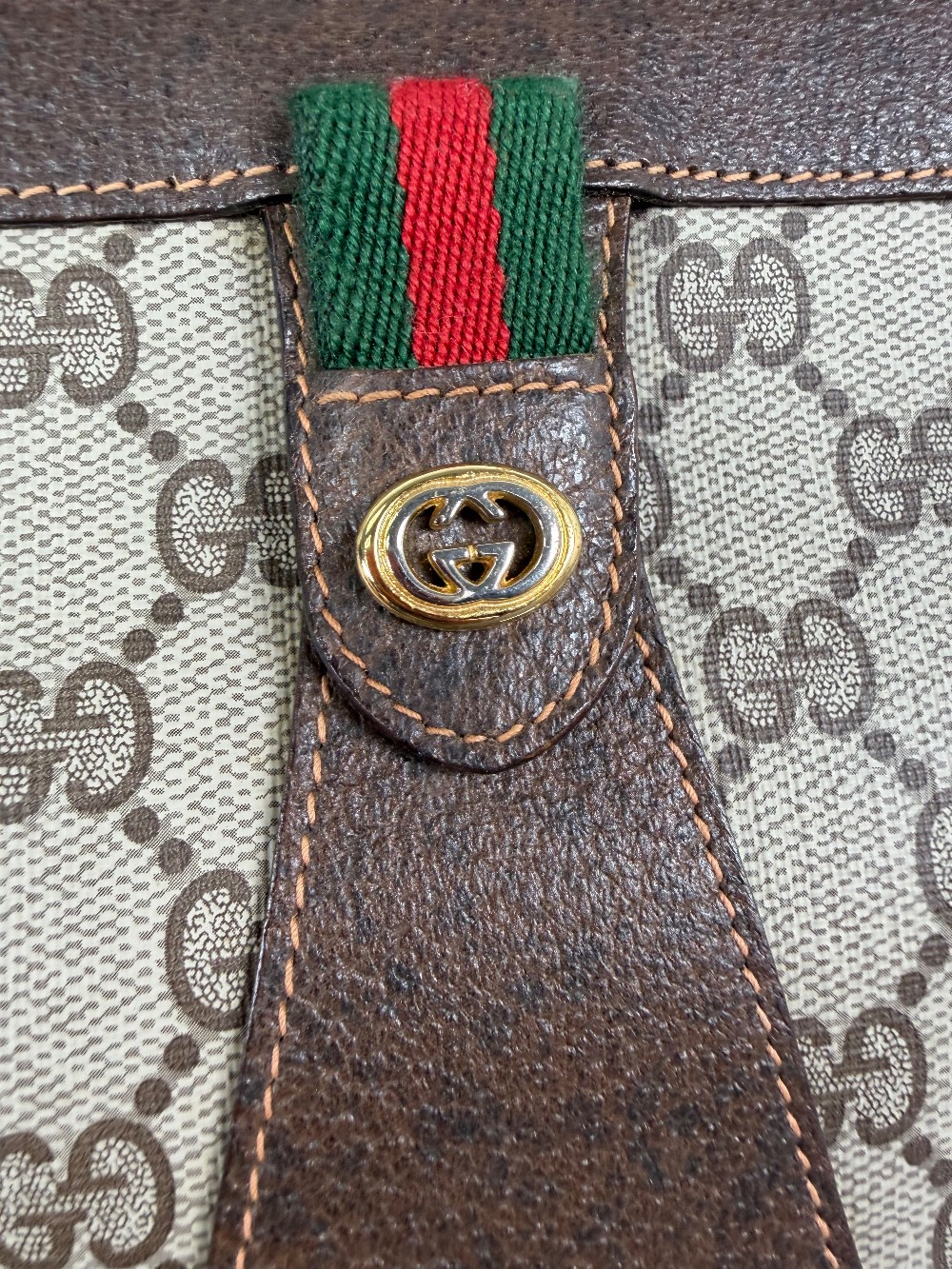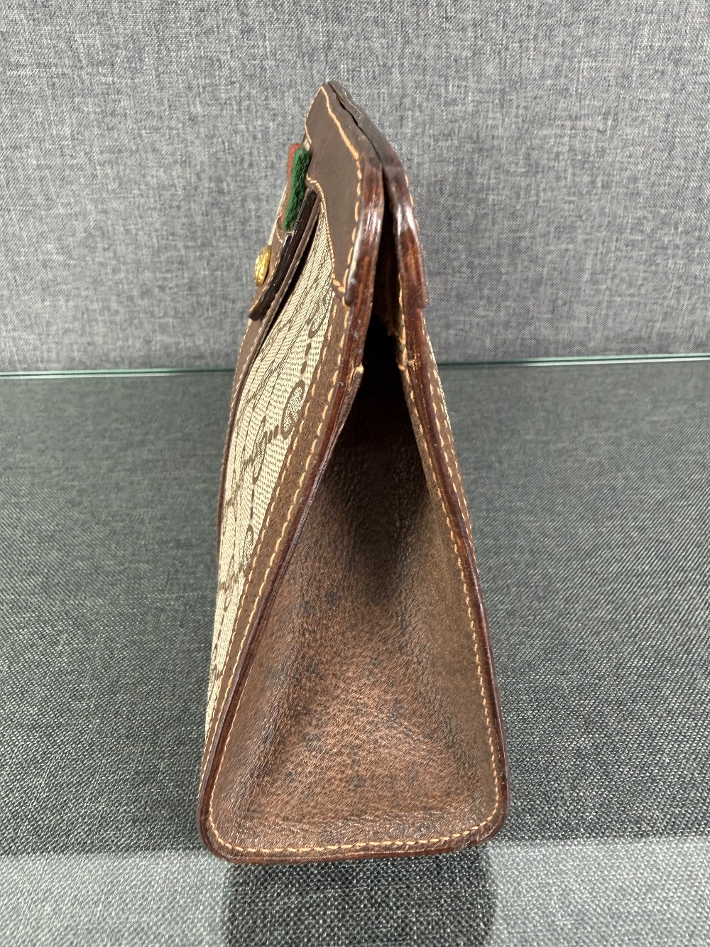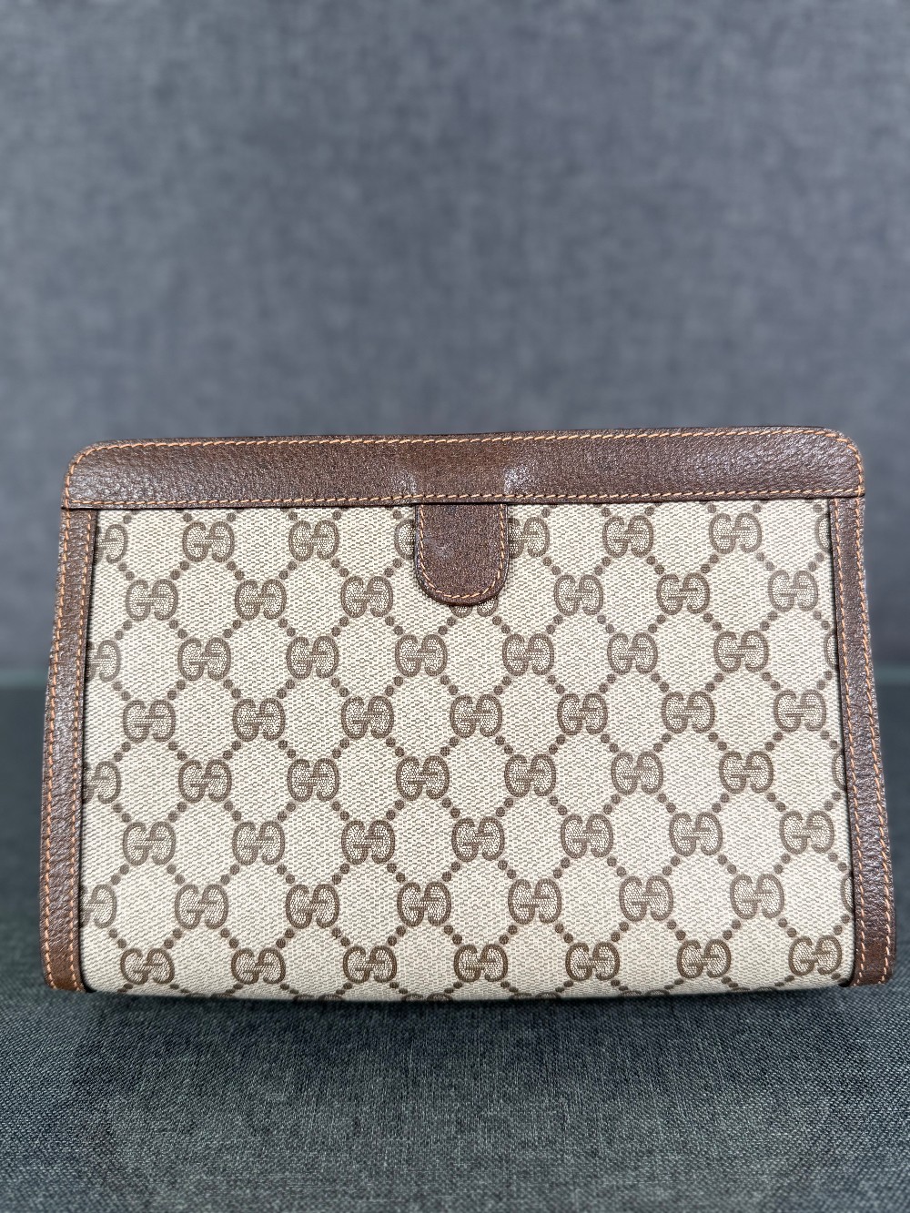It is a clutch bag or pouch.The main body is crafted from Gucci's signature GG Supreme coated canvas, with brown leather trim and accents.It features the iconic red and green "Sherry Line" web stripe detail across a leather strap closure on the front.