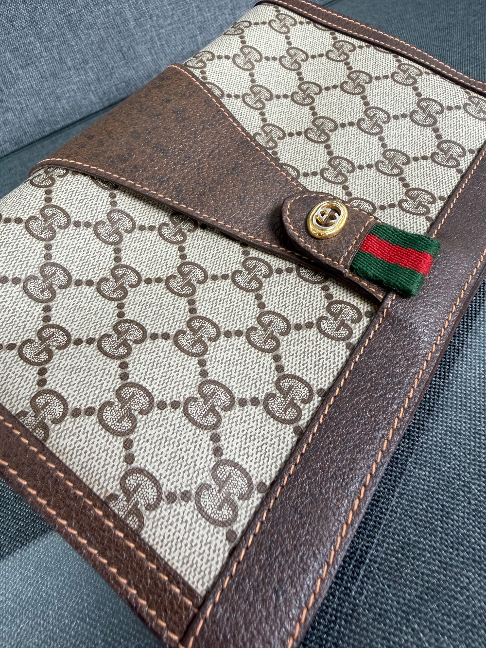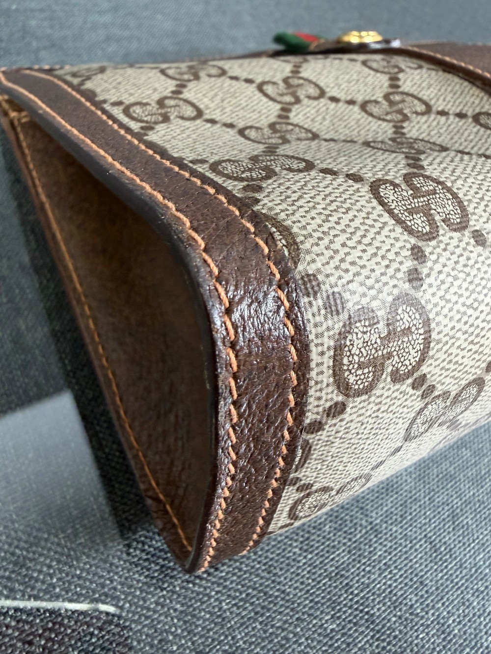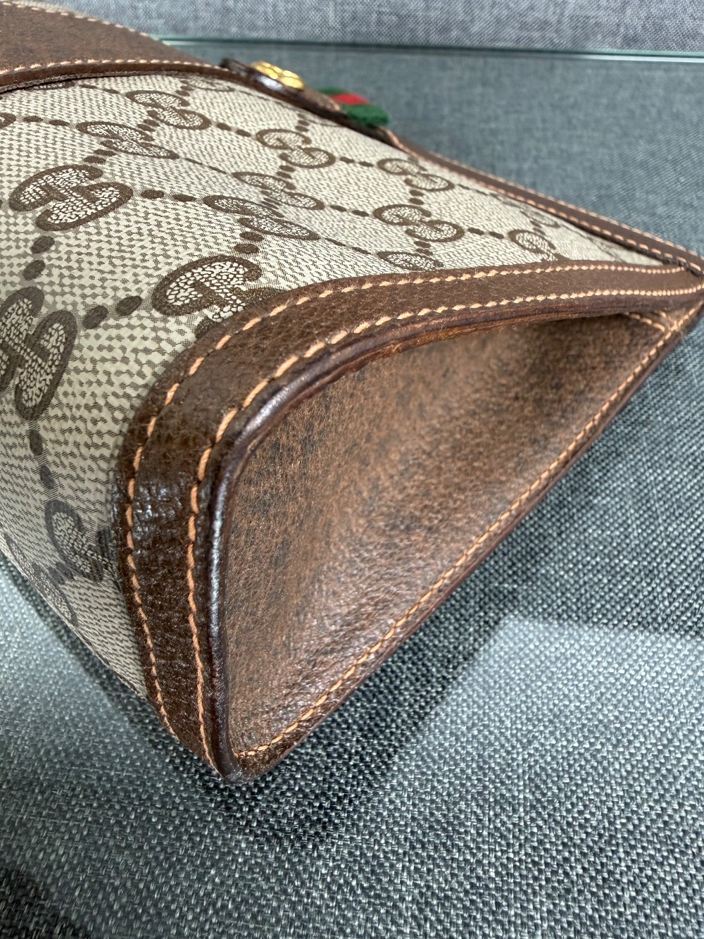 It is a clutch bag or pouch.The main body is crafted from Gucci's signature GG Supreme coated canvas, with brown leather trim and accents.It features the iconic red and green "Sherry Line" web stripe detail across a leather strap closure on the front.