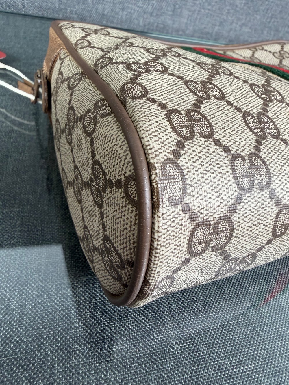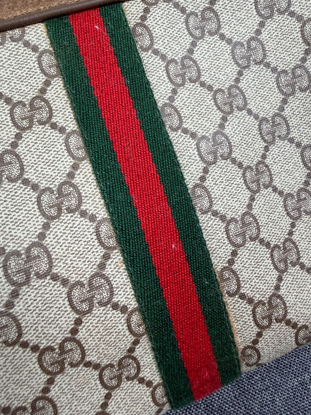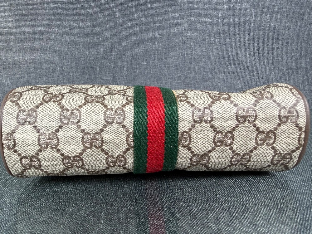 This is a vintage-style clutch bag featuring the iconic Gucci GG pattern in beige and brown (or tan). It is part of the "Sherry Line" collection, distinguished by the signature red and green vertical stripe down the center.The exterior is typically made of durable PVC canvas with leather trim.It is a small, classic accessory often used as a clutch, toiletry bag, or makeup bag.