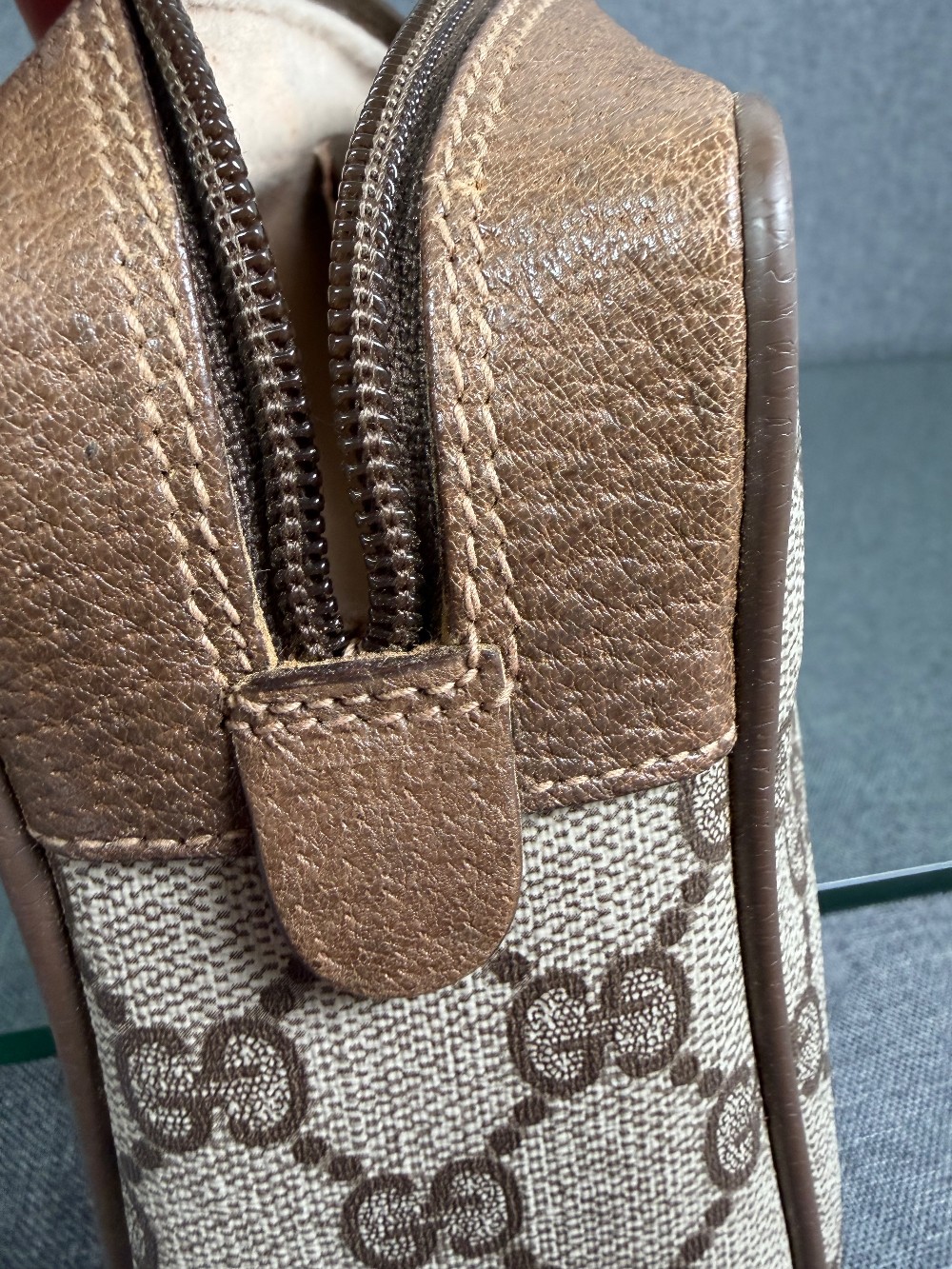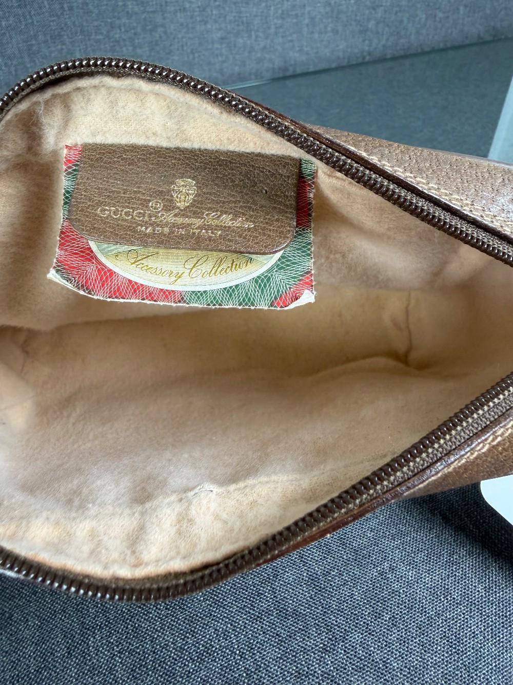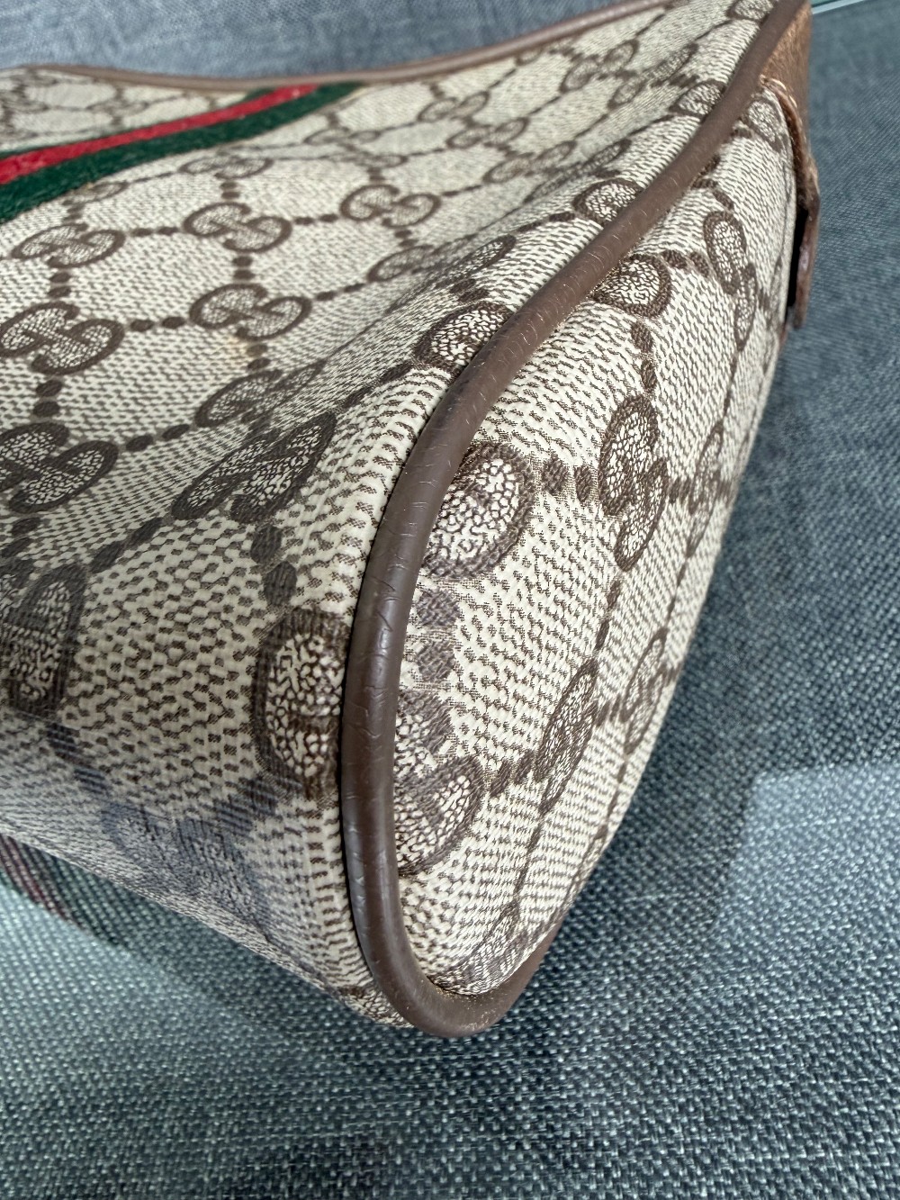 This is a vintage-style clutch bag featuring the iconic Gucci GG pattern in beige and brown (or tan). It is part of the "Sherry Line" collection, distinguished by the signature red and green vertical stripe down the center.The exterior is typically made of durable PVC canvas with leather trim.It is a small, classic accessory often used as a clutch, toiletry bag, or makeup bag.