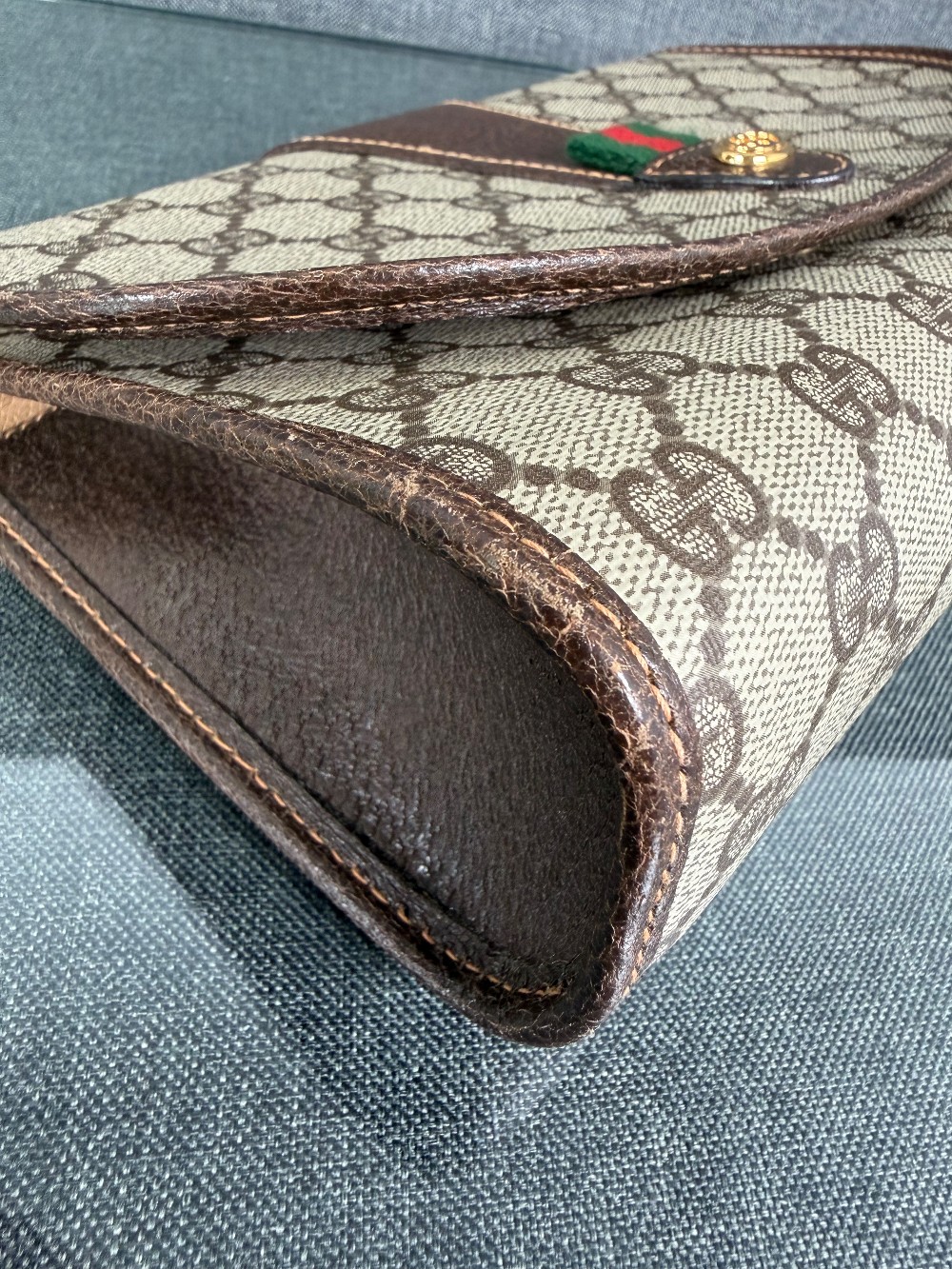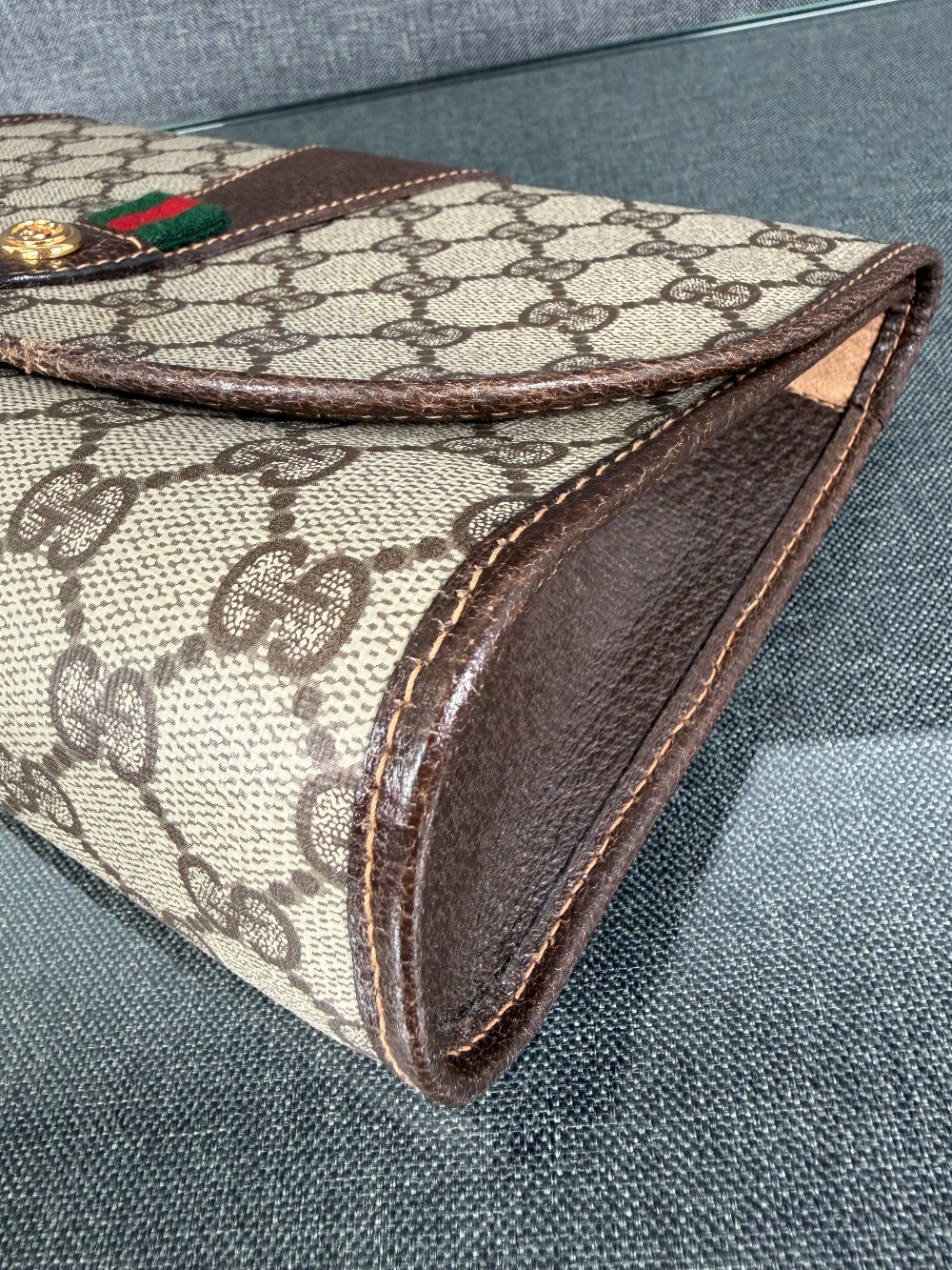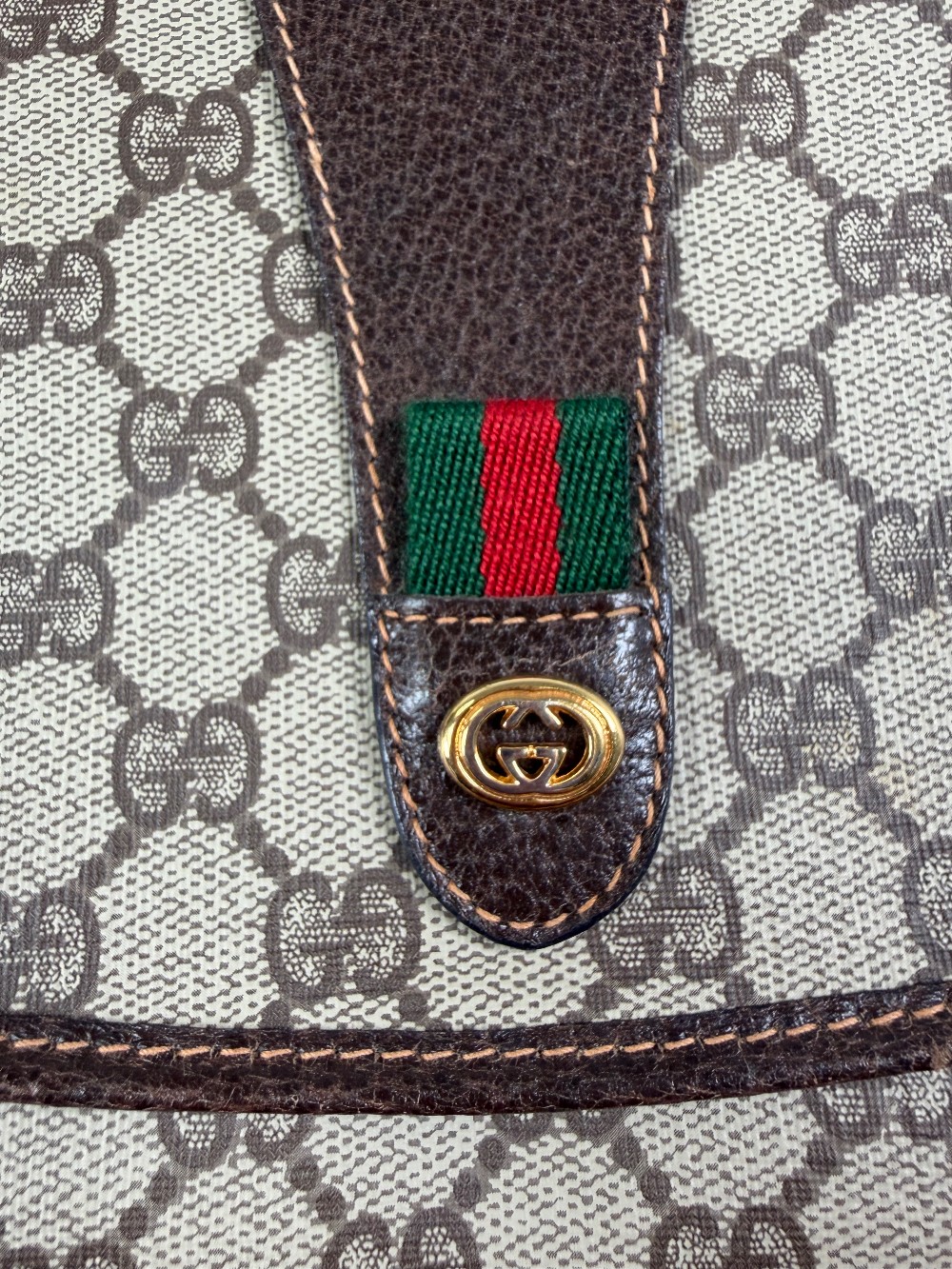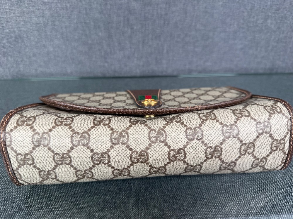 The bag is crafted from durable coated canvas material featuring the iconic interlocking GG monogram pattern, with brown leather trims and accents.It showcases the classic green and red signature web (Sherry Line) stripe detail on the front flap.The clutch features a magnetic snap or button closure.The bag was made in Italy.These are typically vintage pieces, often from the late 1980s or early 1990s. The specific condition varies by item, but they are known for their durability.