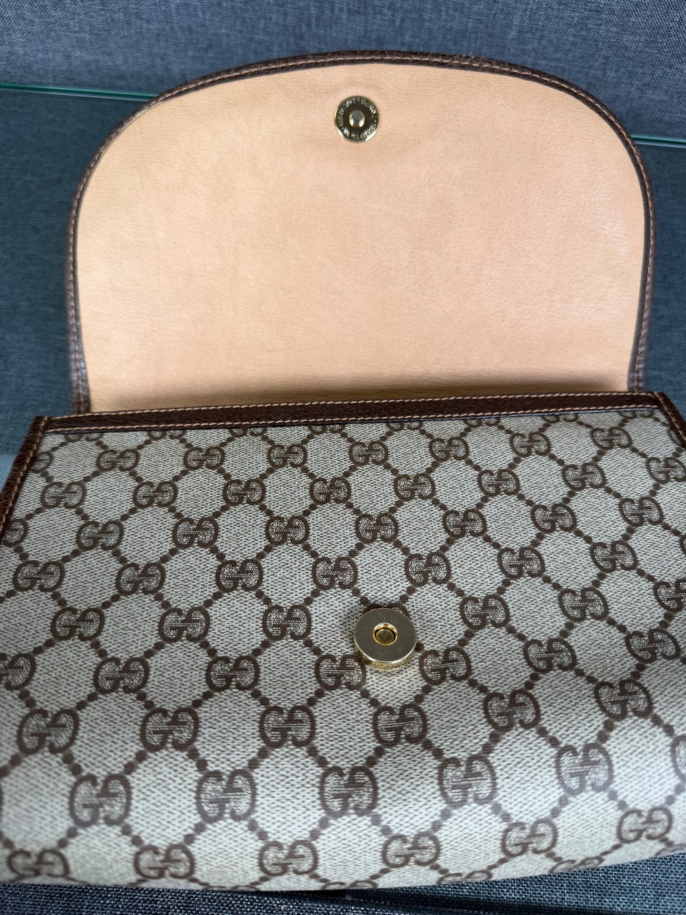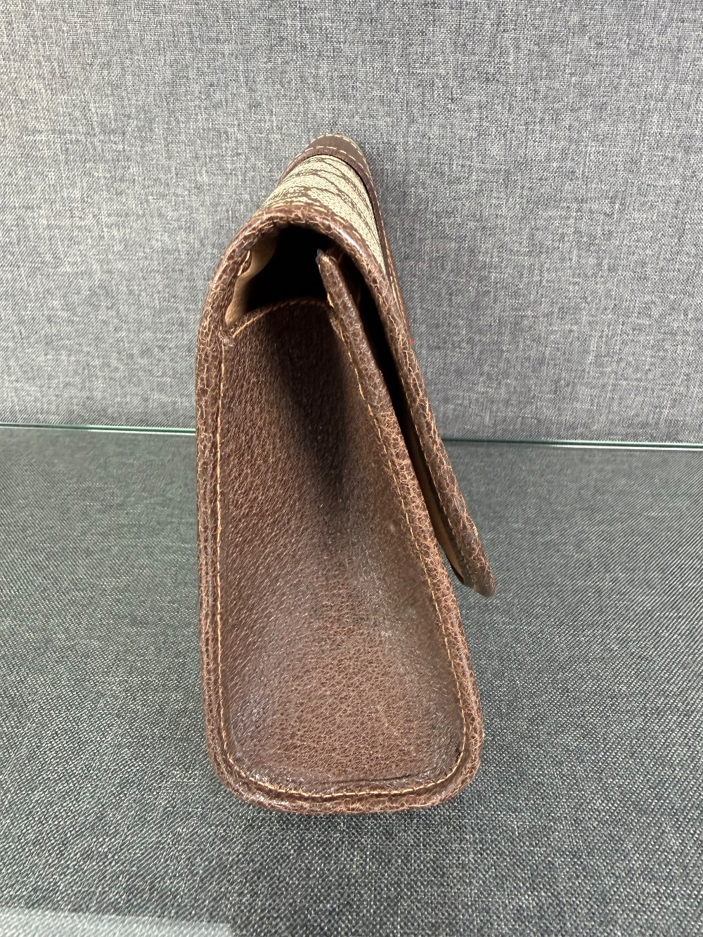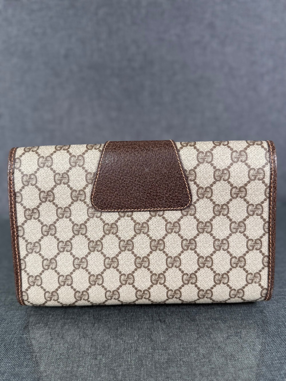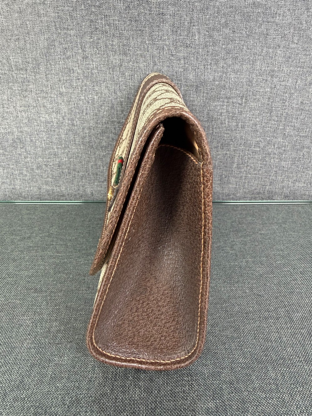 The bag is crafted from durable coated canvas material featuring the iconic interlocking GG monogram pattern, with brown leather trims and accents.It showcases the classic green and red signature web (Sherry Line) stripe detail on the front flap.The clutch features a magnetic snap or button closure.The bag was made in Italy.These are typically vintage pieces, often from the late 1980s or early 1990s. The specific condition varies by item, but they are known for their durability.