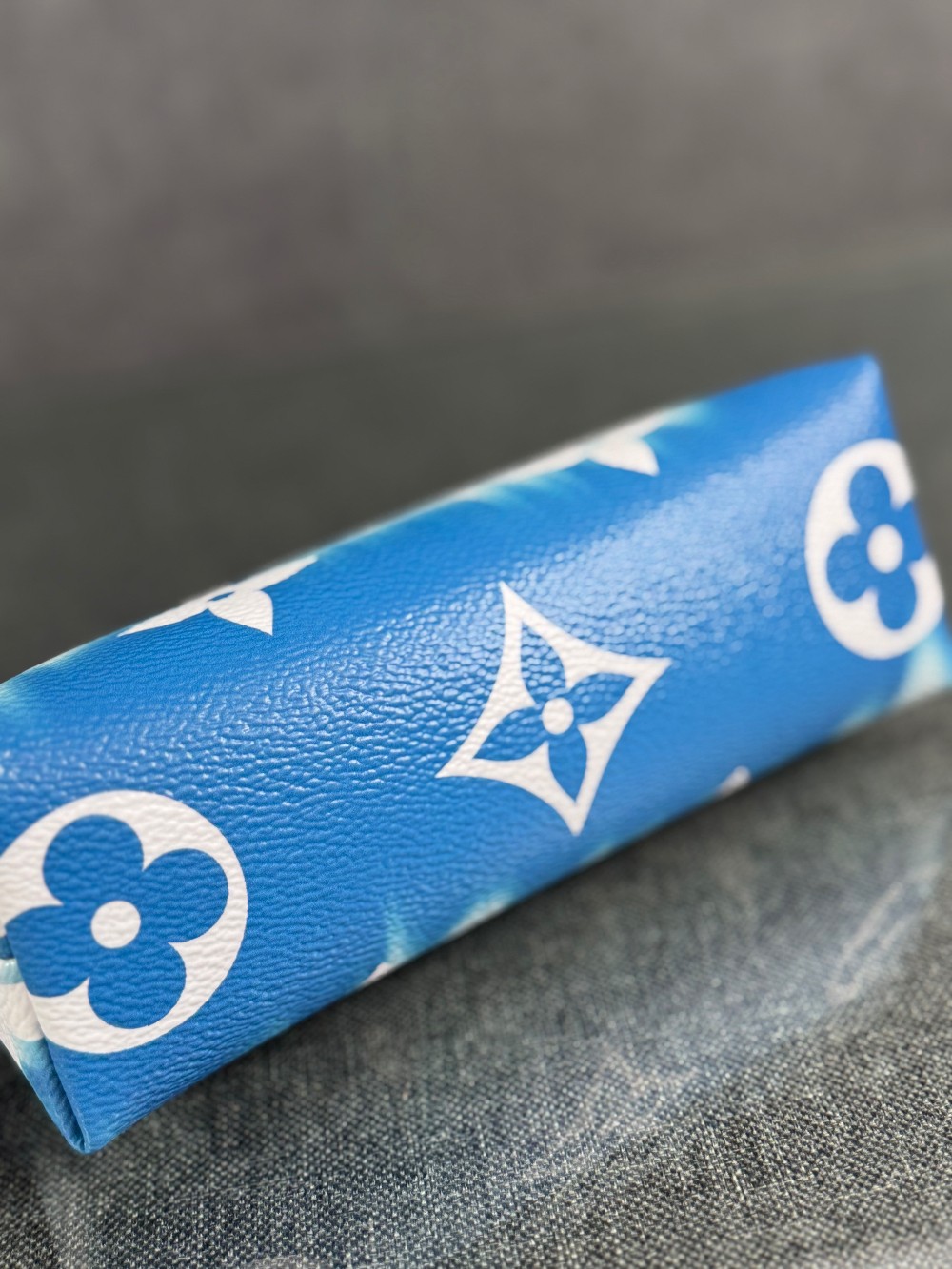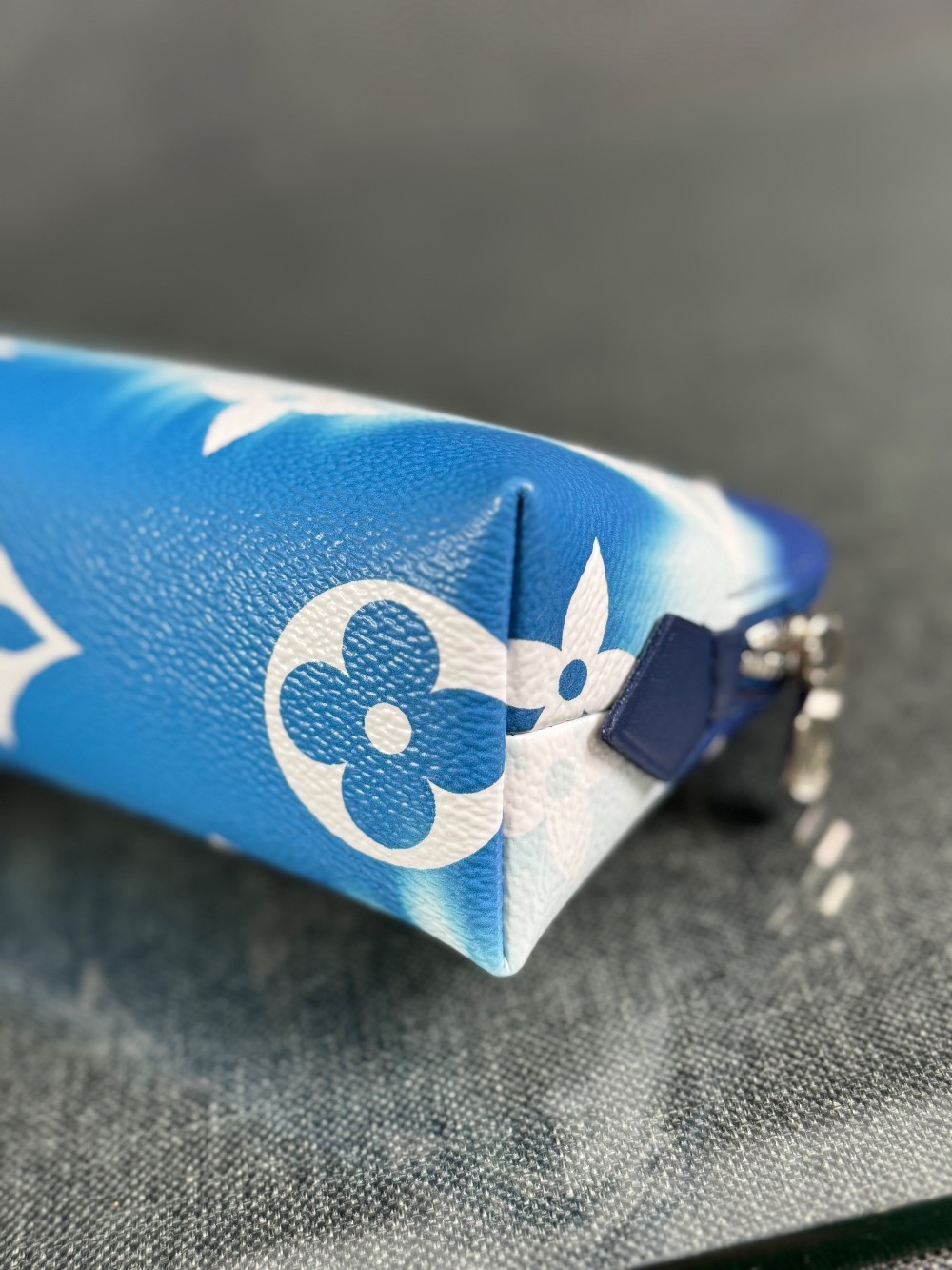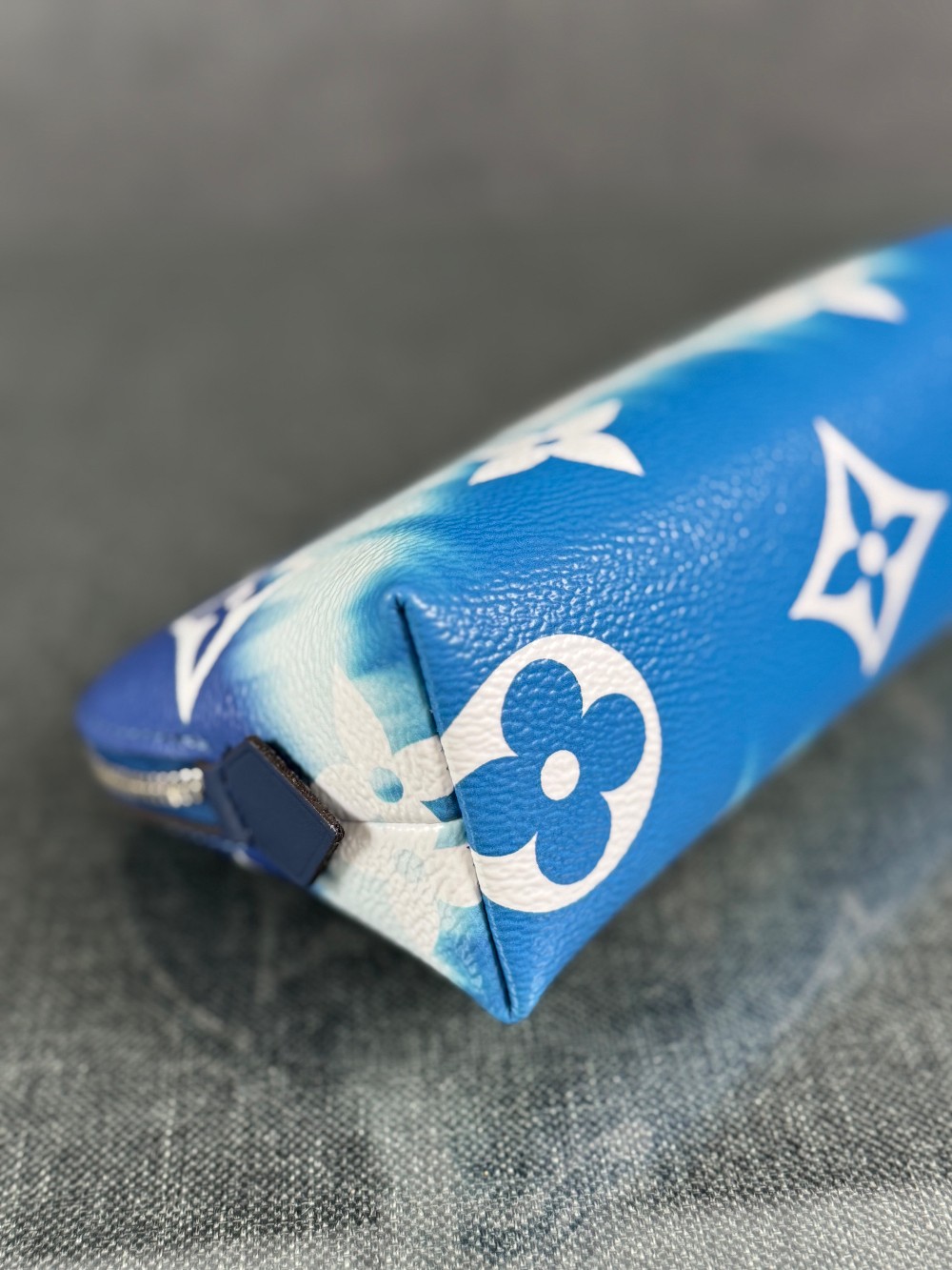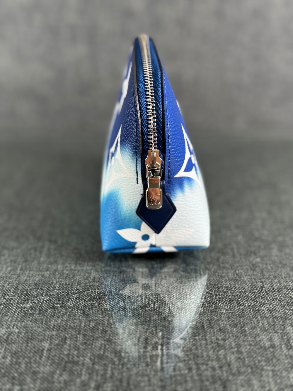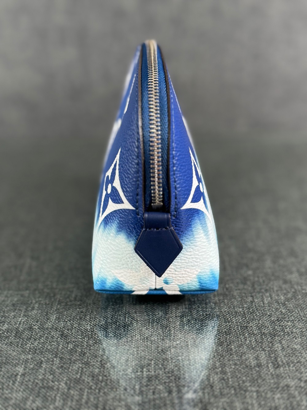 This is an authentic LOUIS VUITTON Monogram Giant Escale Cosmetic Pouch in Bleu. This stylish pouch is crafted of classic Louis Vuitton monogram on toile canvas in blue ombre. The pouch features a top zipper that opens to a blue leather interior with a small patch pocket.