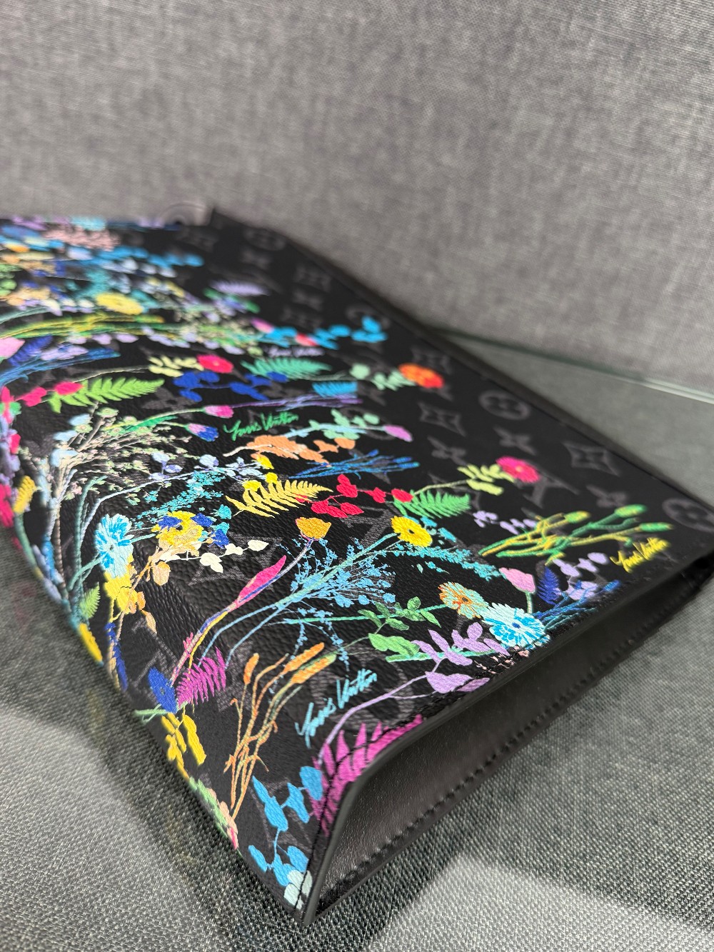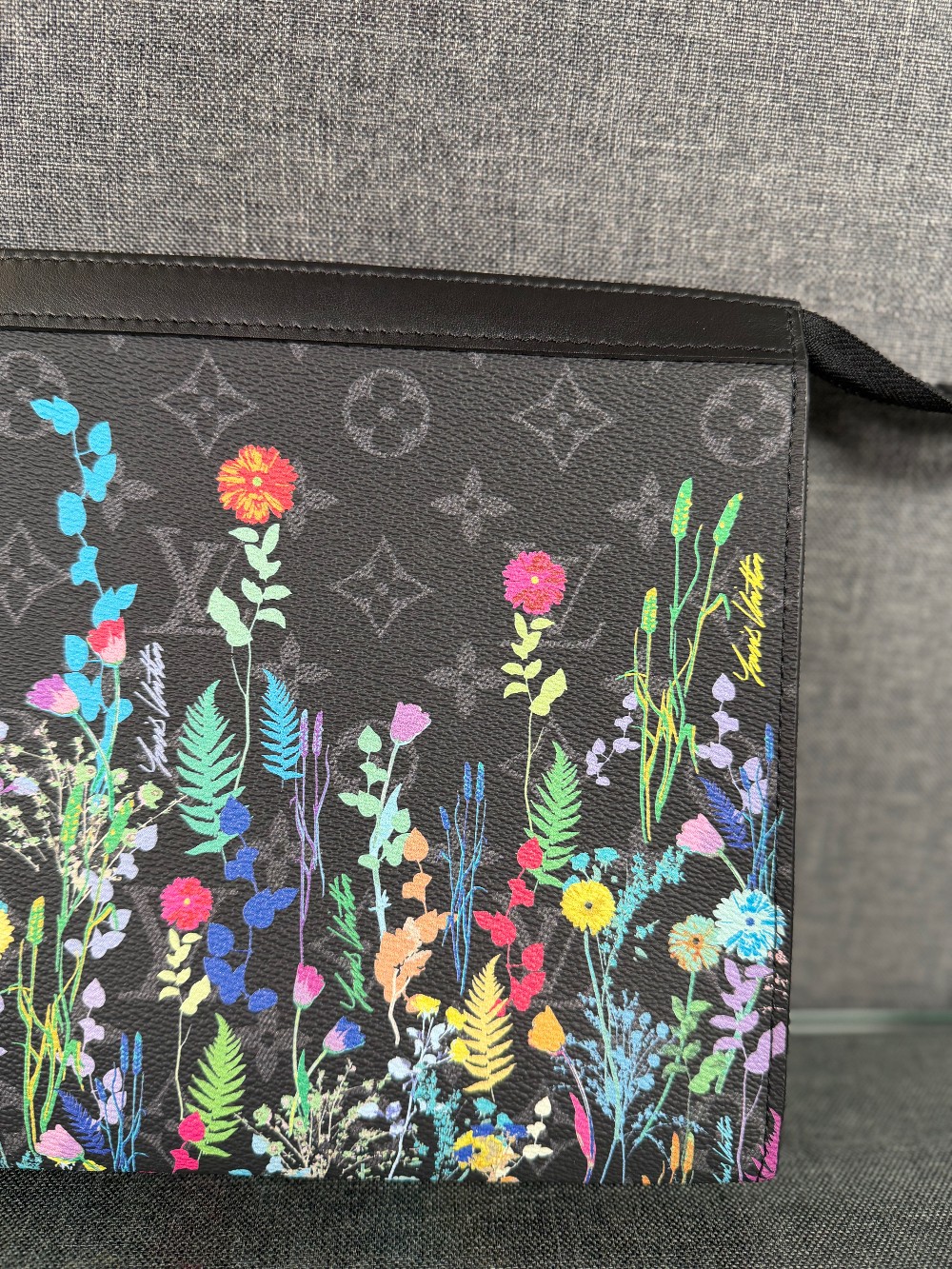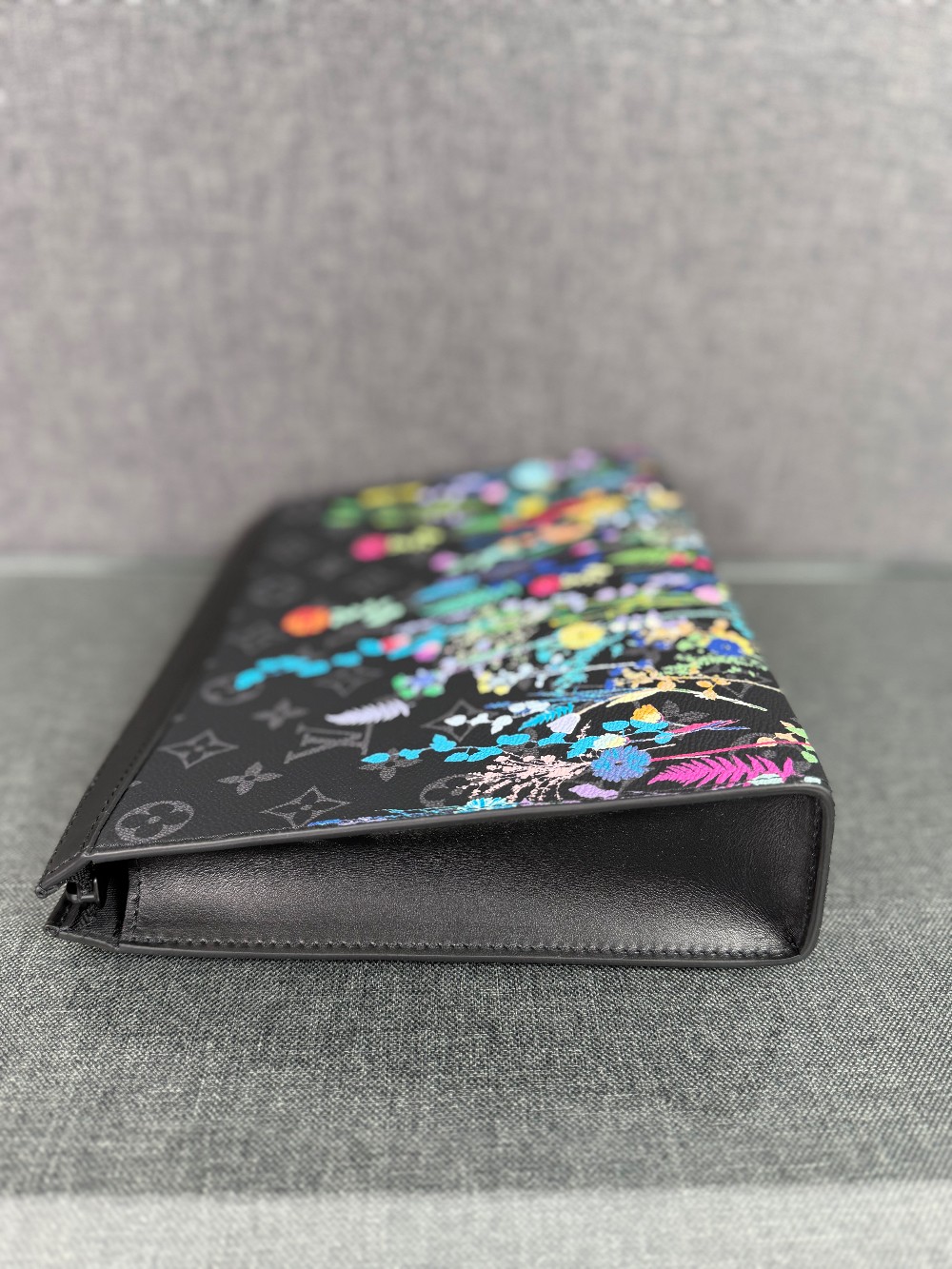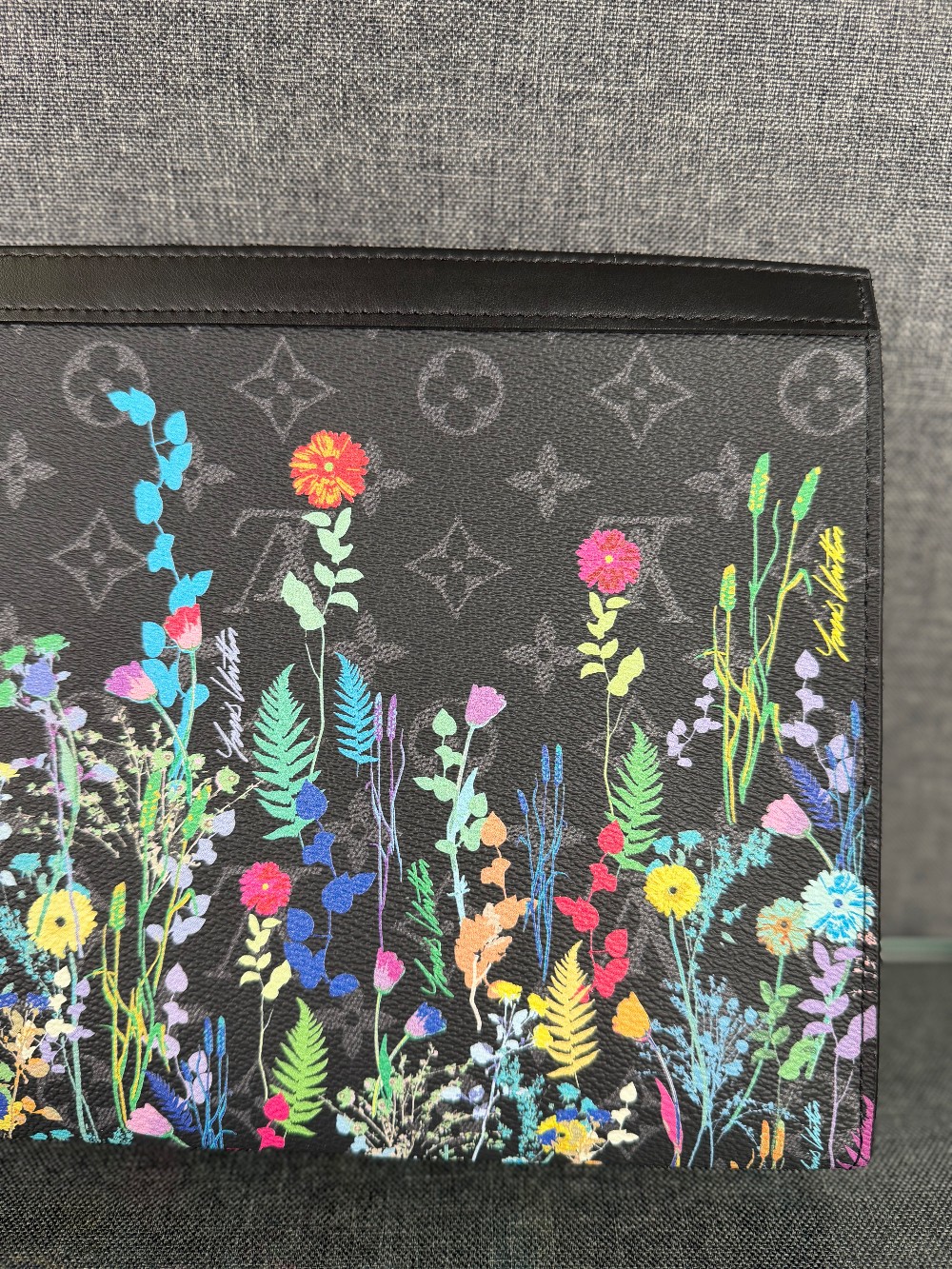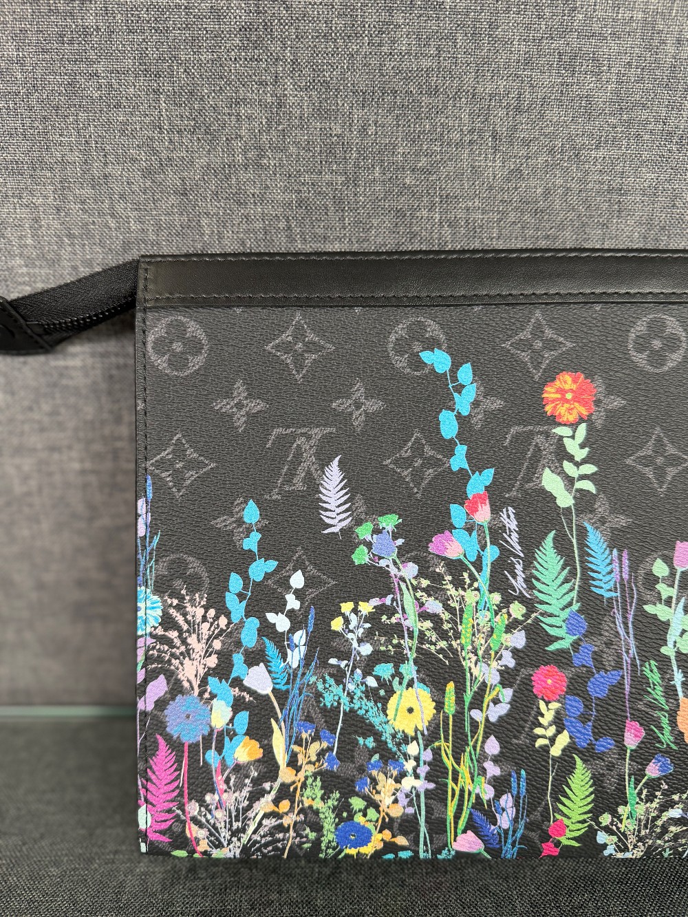 This is an authentic LOUIS VUITTON Monogram Eclipse Folia Pochette Voyage MM. This Mens Spring Summer 2020 pouch is crafted of signature Louis Vuitton monogram-coated canvas in black and grey, with a vibrantly colored floral overlay. The black top zipper opens to a black fabric interior with a large leather patch pocket and a credit card slot panel with room for six cards.