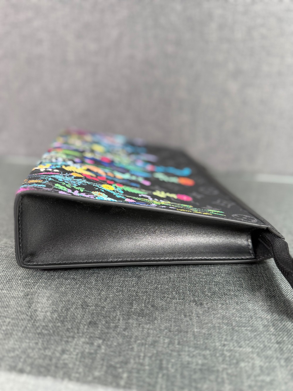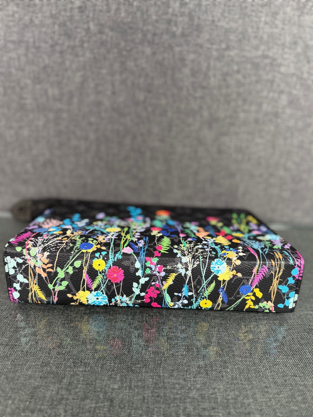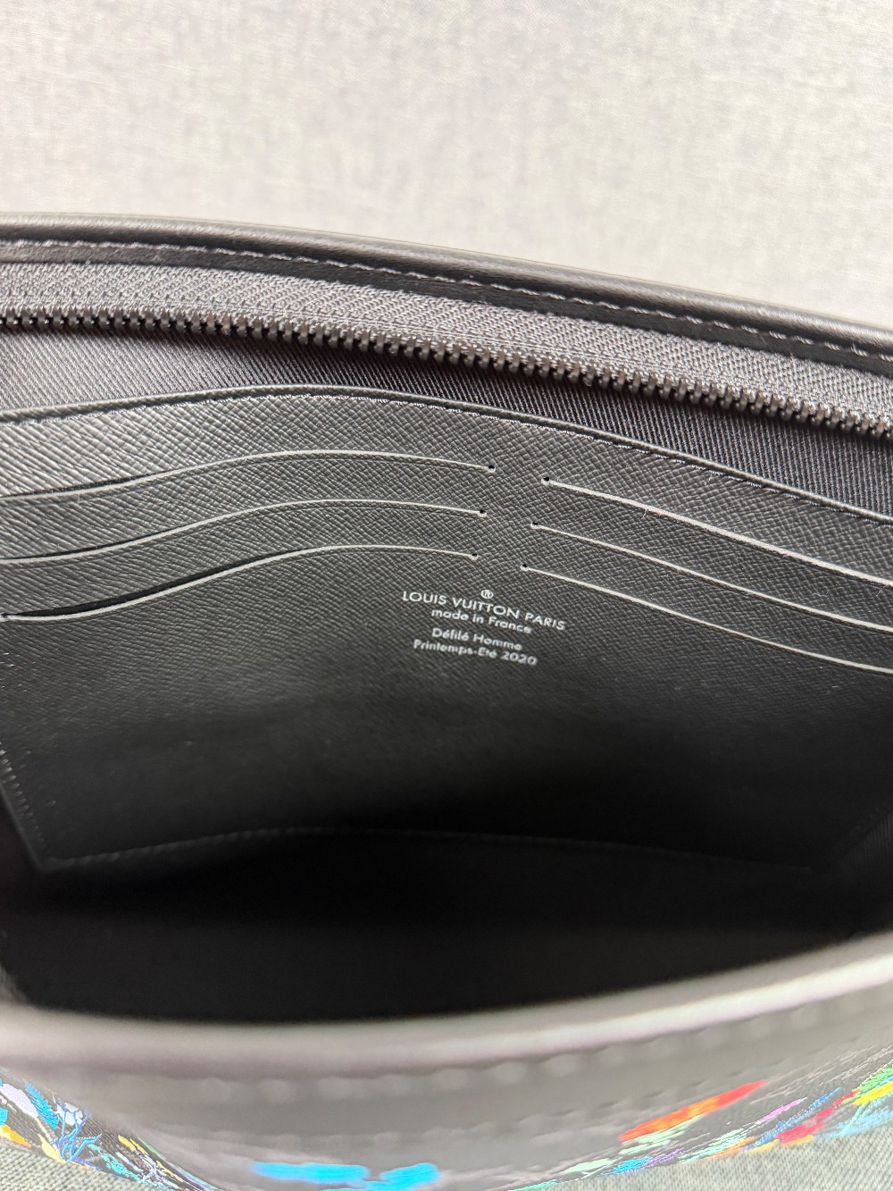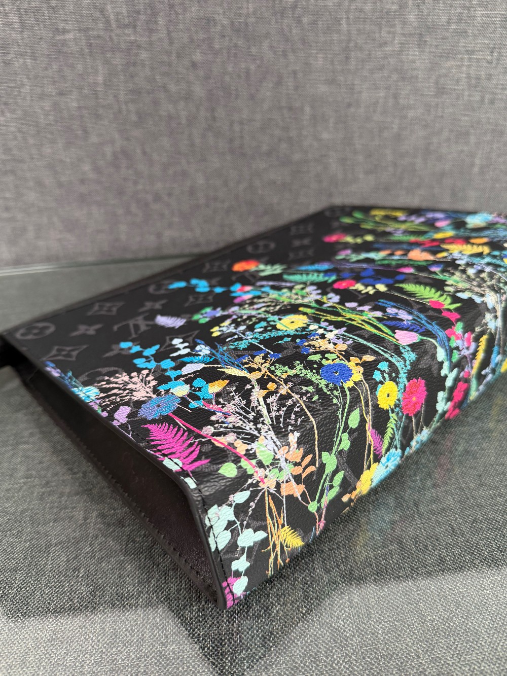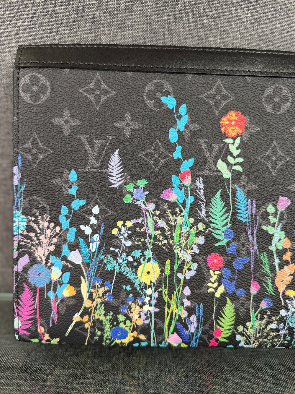 This is an authentic LOUIS VUITTON Monogram Eclipse Folia Pochette Voyage MM. This Mens Spring Summer 2020 pouch is crafted of signature Louis Vuitton monogram-coated canvas in black and grey, with a vibrantly colored floral overlay. The black top zipper opens to a black fabric interior with a large leather patch pocket and a credit card slot panel with room for six cards.