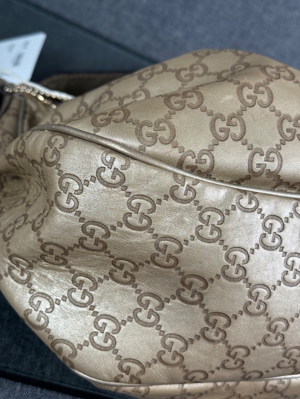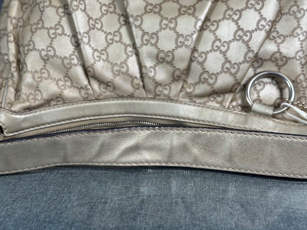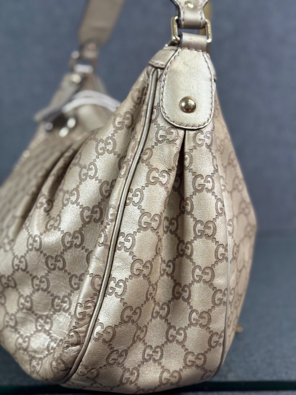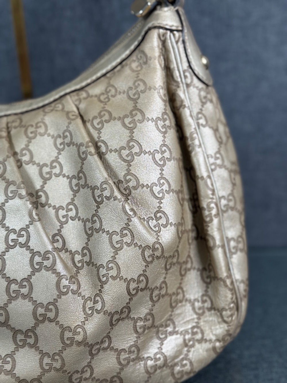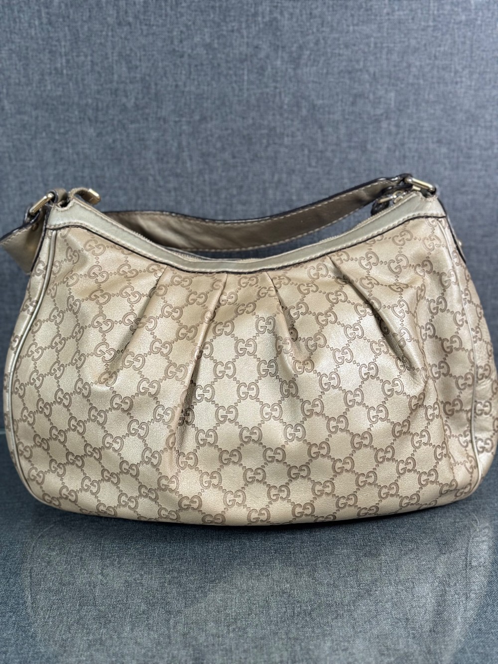 This is an authentic GUCCI Guccissima Medium Sukey Hobo in GOLD. This chic hobo is crafted of pleated and gathered Gucci GG embossed leather in GOLD. The bag features a looping flat leather shoulder strap with light brass hardware links, and a brass ring. The top unzips to a dark brown jacquard fabric interior with zipper and patch pockets.