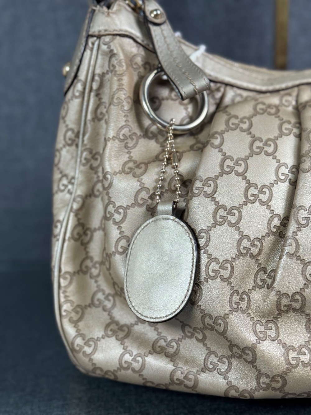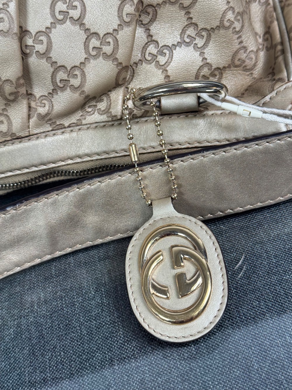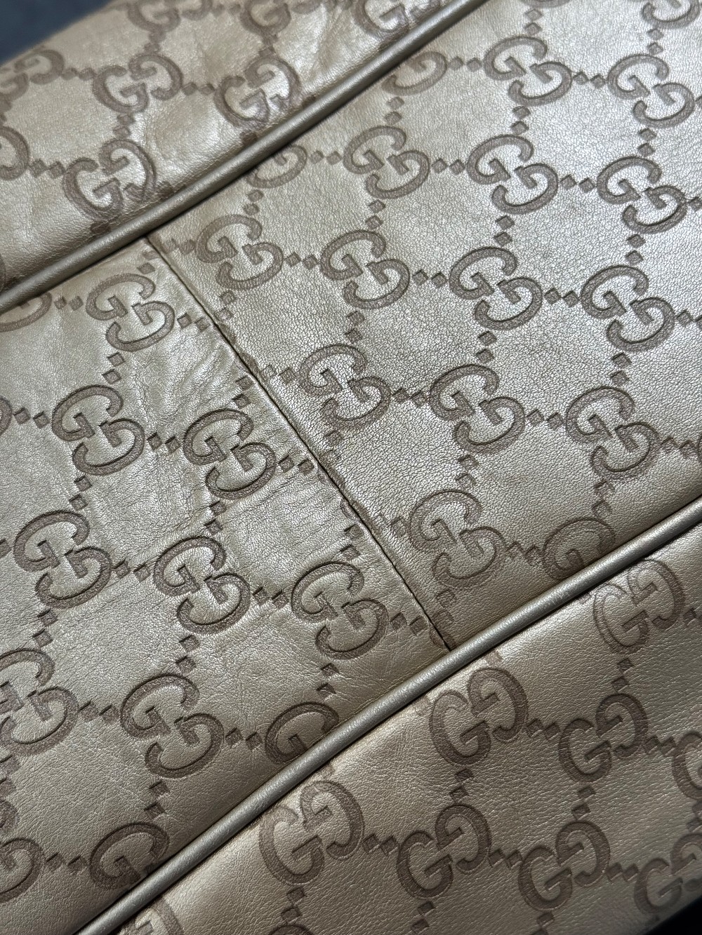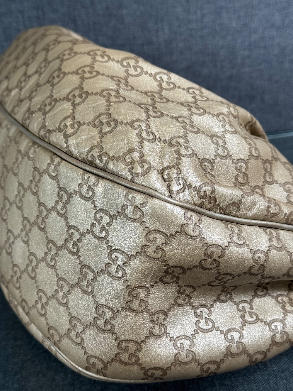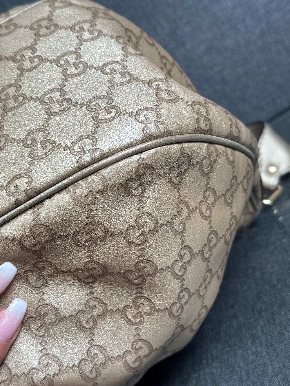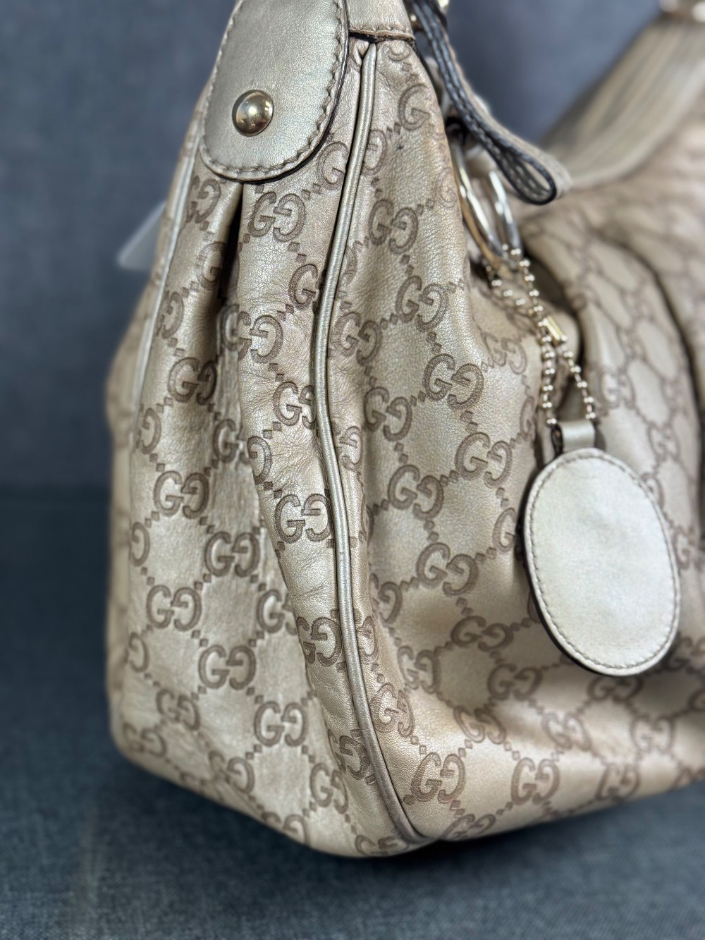 This is an authentic GUCCI Guccissima Medium Sukey Hobo in GOLD. This chic hobo is crafted of pleated and gathered Gucci GG embossed leather in GOLD. The bag features a looping flat leather shoulder strap with light brass hardware links, and a brass ring. The top unzips to a dark brown jacquard fabric interior with zipper and patch pockets.