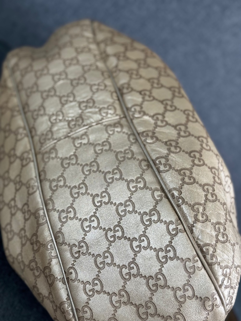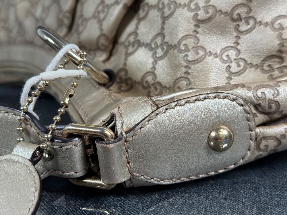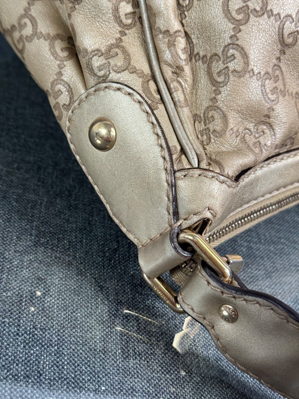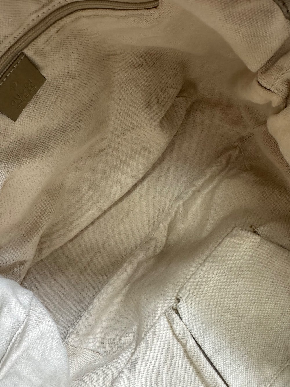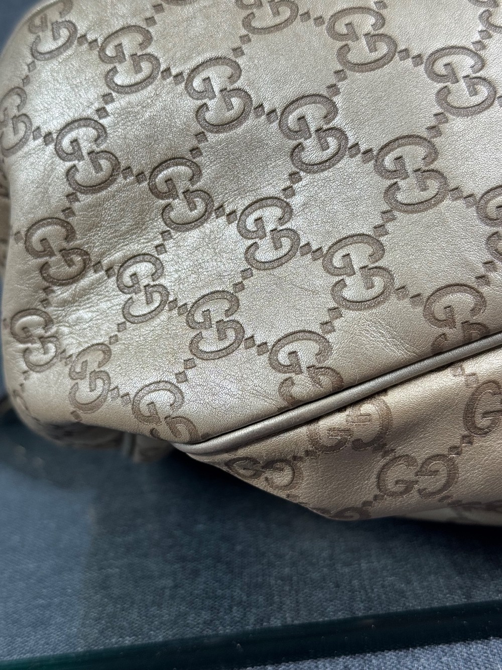 This is an authentic GUCCI Guccissima Medium Sukey Hobo in GOLD. This chic hobo is crafted of pleated and gathered Gucci GG embossed leather in GOLD. The bag features a looping flat leather shoulder strap with light brass hardware links, and a brass ring. The top unzips to a dark brown jacquard fabric interior with zipper and patch pockets.