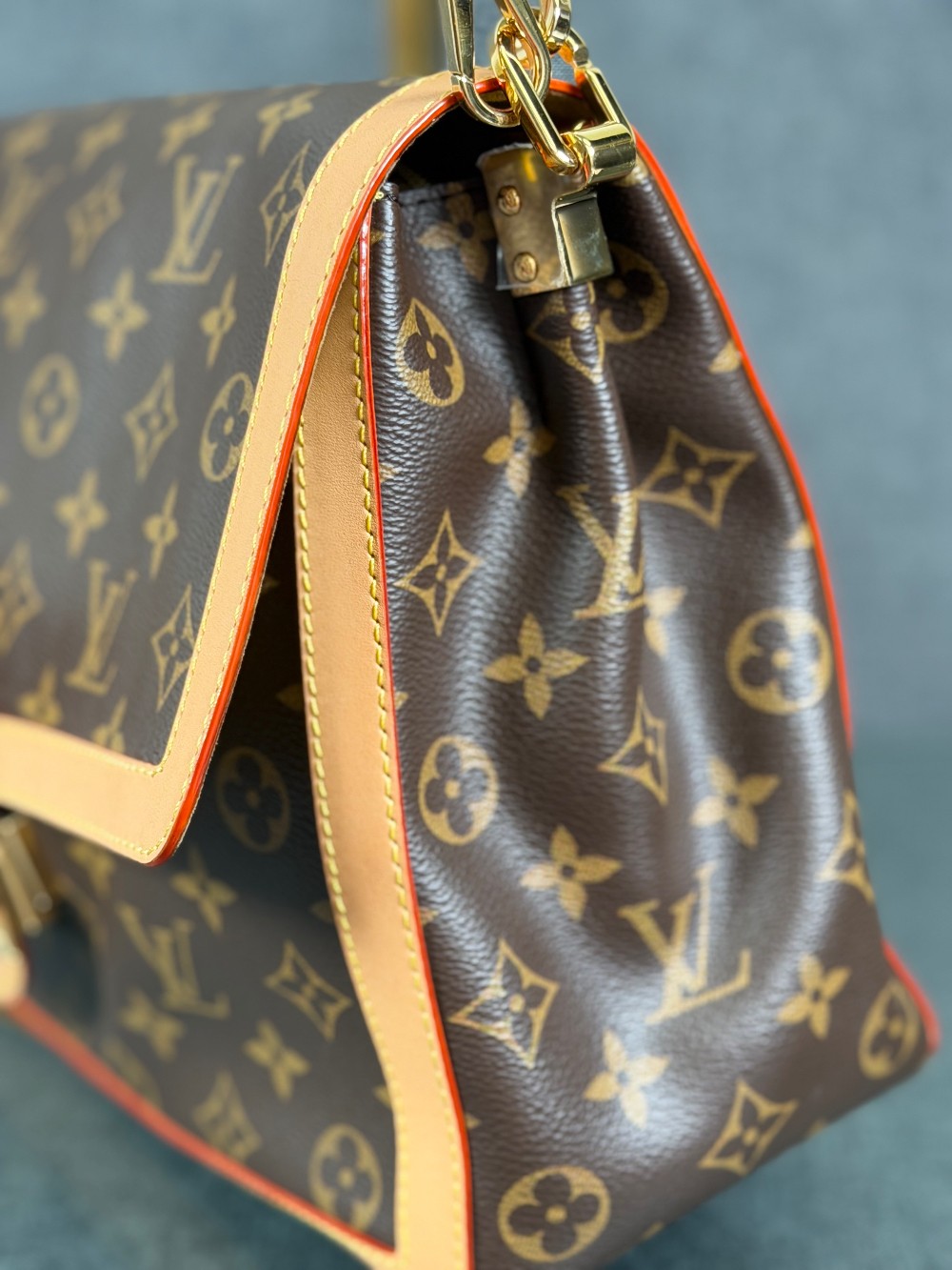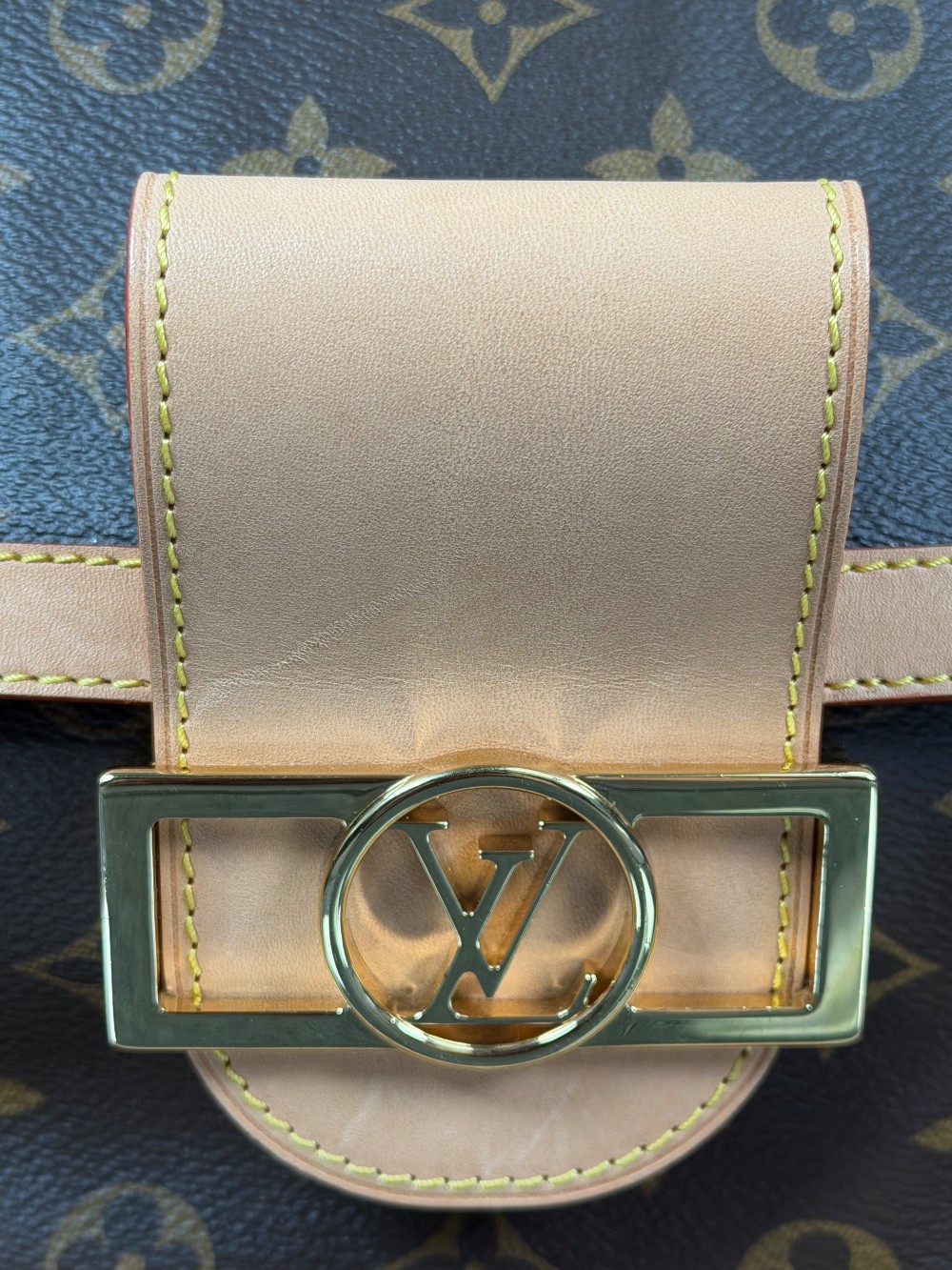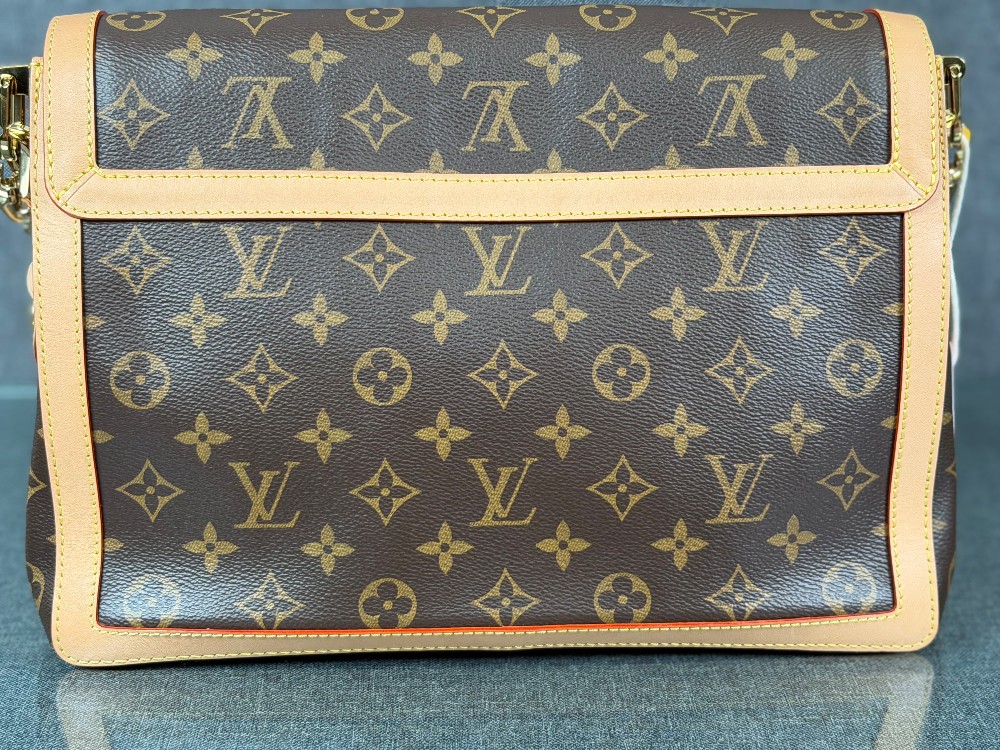 This is an authentic LOUIS VUITTON Monogram Dauphine Soft GM. This stylish shoulder bag is crafted of Louis Vuitton monogram on toile canvas. The bag features a vachetta shoulder strap, a gold chain strap, and a front facing flap with a vachetta trim, and a decorative brass Louis Vuitton logo clasp. This opens to a partitioned brown microfiber interior with zipper and patch pockets.