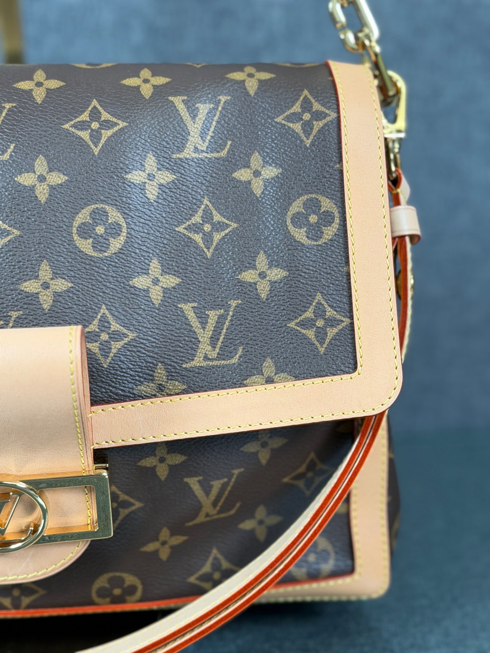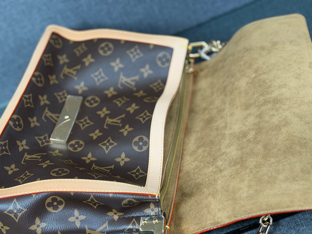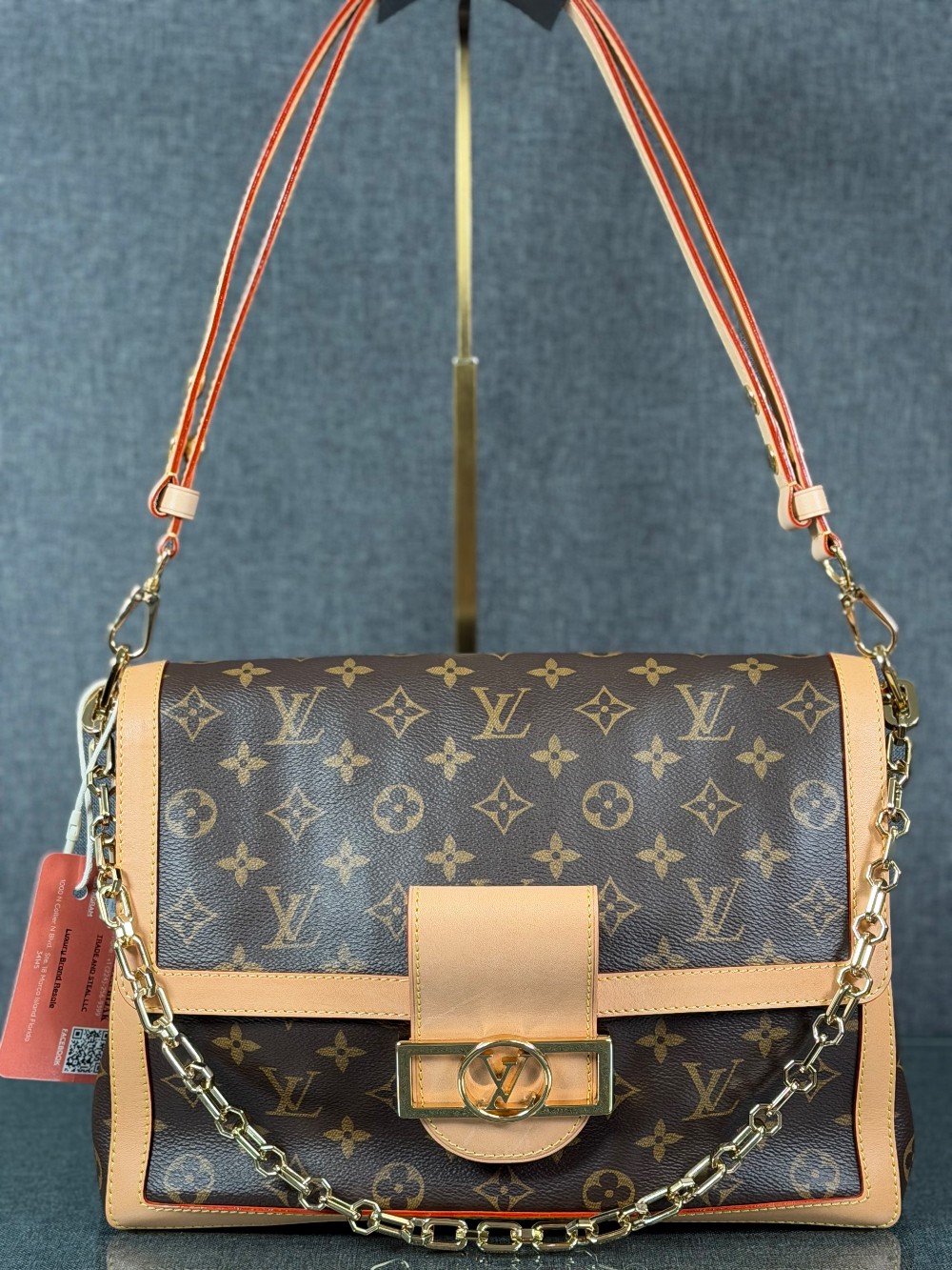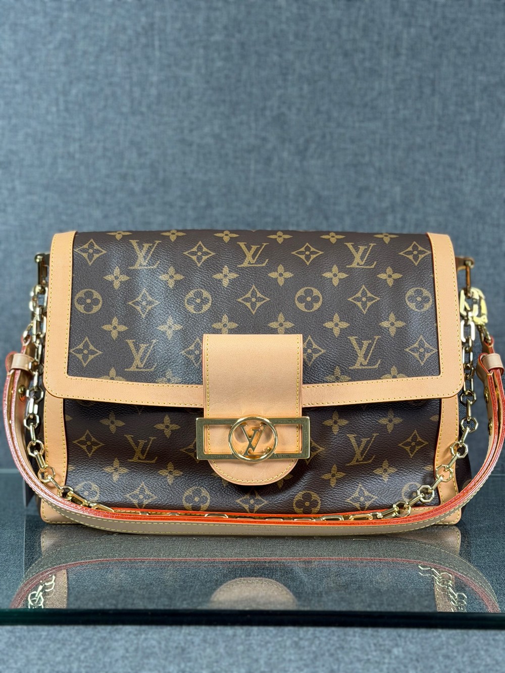 This is an authentic LOUIS VUITTON Monogram Dauphine Soft GM. This stylish shoulder bag is crafted of Louis Vuitton monogram on toile canvas. The bag features a vachetta shoulder strap, a gold chain strap, and a front facing flap with a vachetta trim, and a decorative brass Louis Vuitton logo clasp. This opens to a partitioned brown microfiber interior with zipper and patch pockets.