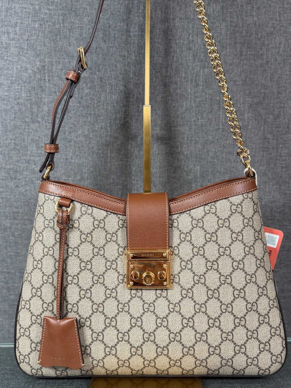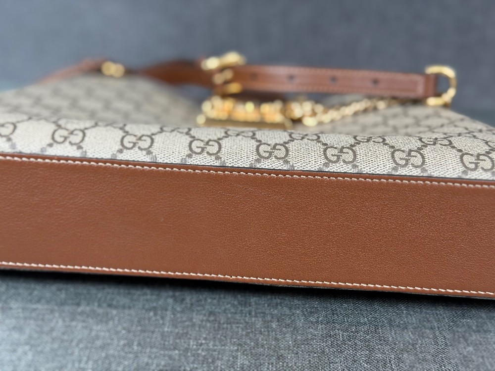 This is an authentic GUCCI GG Supreme Monogram Medium Padlock Shoulder Bag in Beige Ebony and Brown Sugar. This stylish shoulder bag is crafted of a GG Supreme Monogram canvas with brown leather trim. The bag features a gold chain and leather shoulder straps and opens to a beige microfiber interior with a zipper pocket.