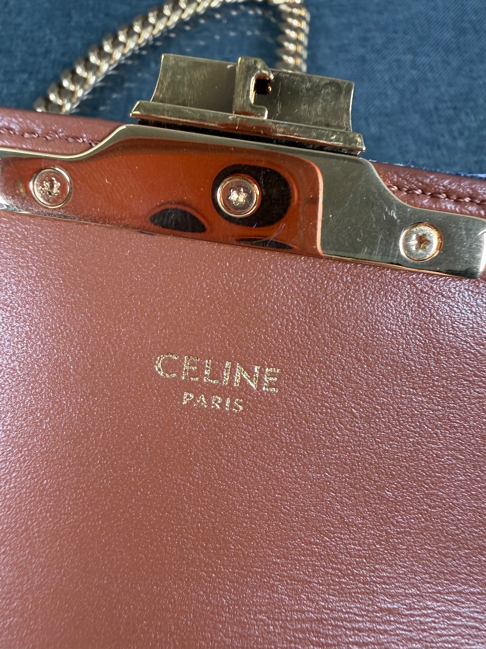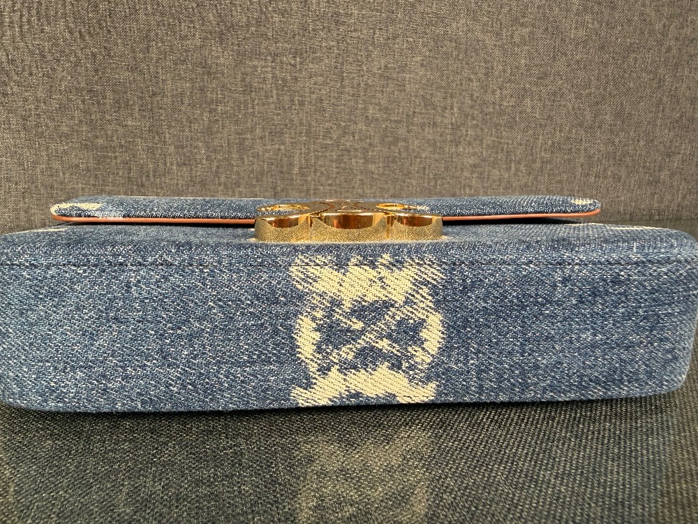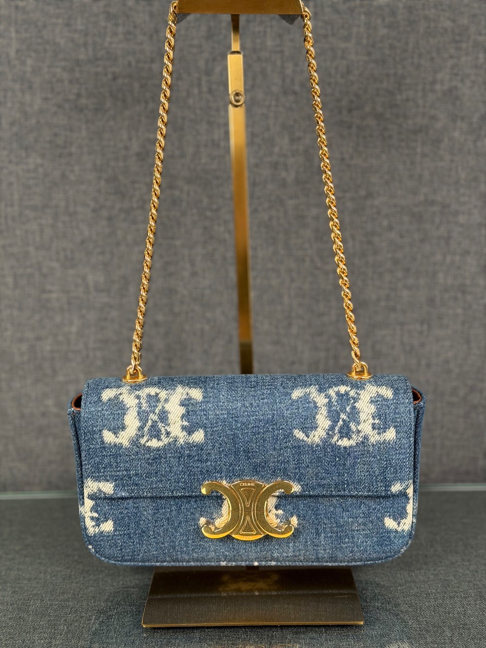 This is an authentic CELINE Denim Triomphe Chain Shoulder Bag in Navy and Tan. This chic bag is crafted of blue denim with the Celine triomphe motif. The bag features gold hardware including a chain shoulder strap and triomphe front closure. The front flap opens to a light brown leather interior with a patch pocket.