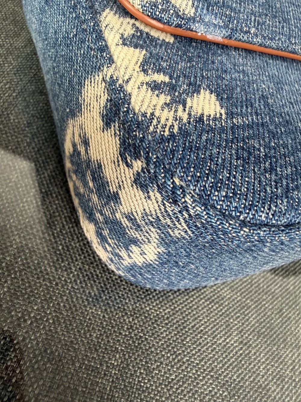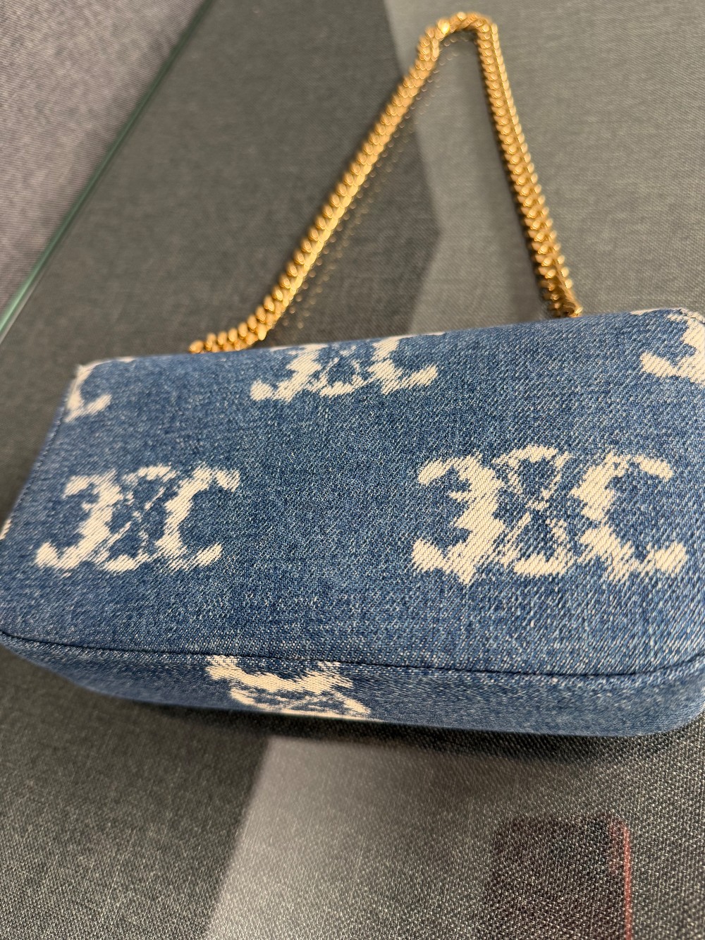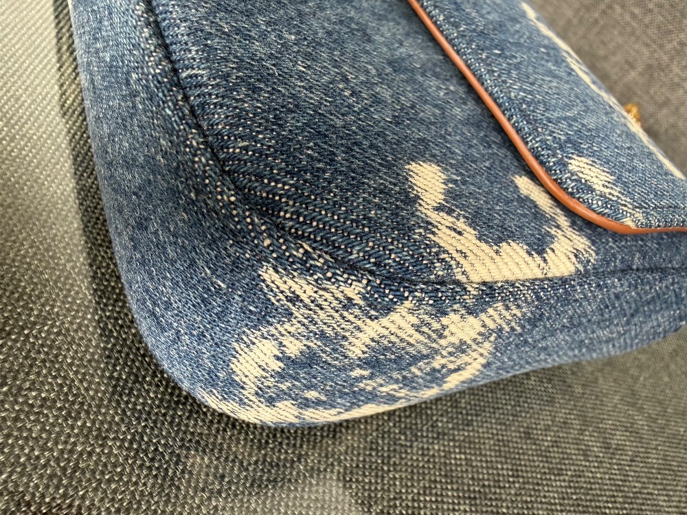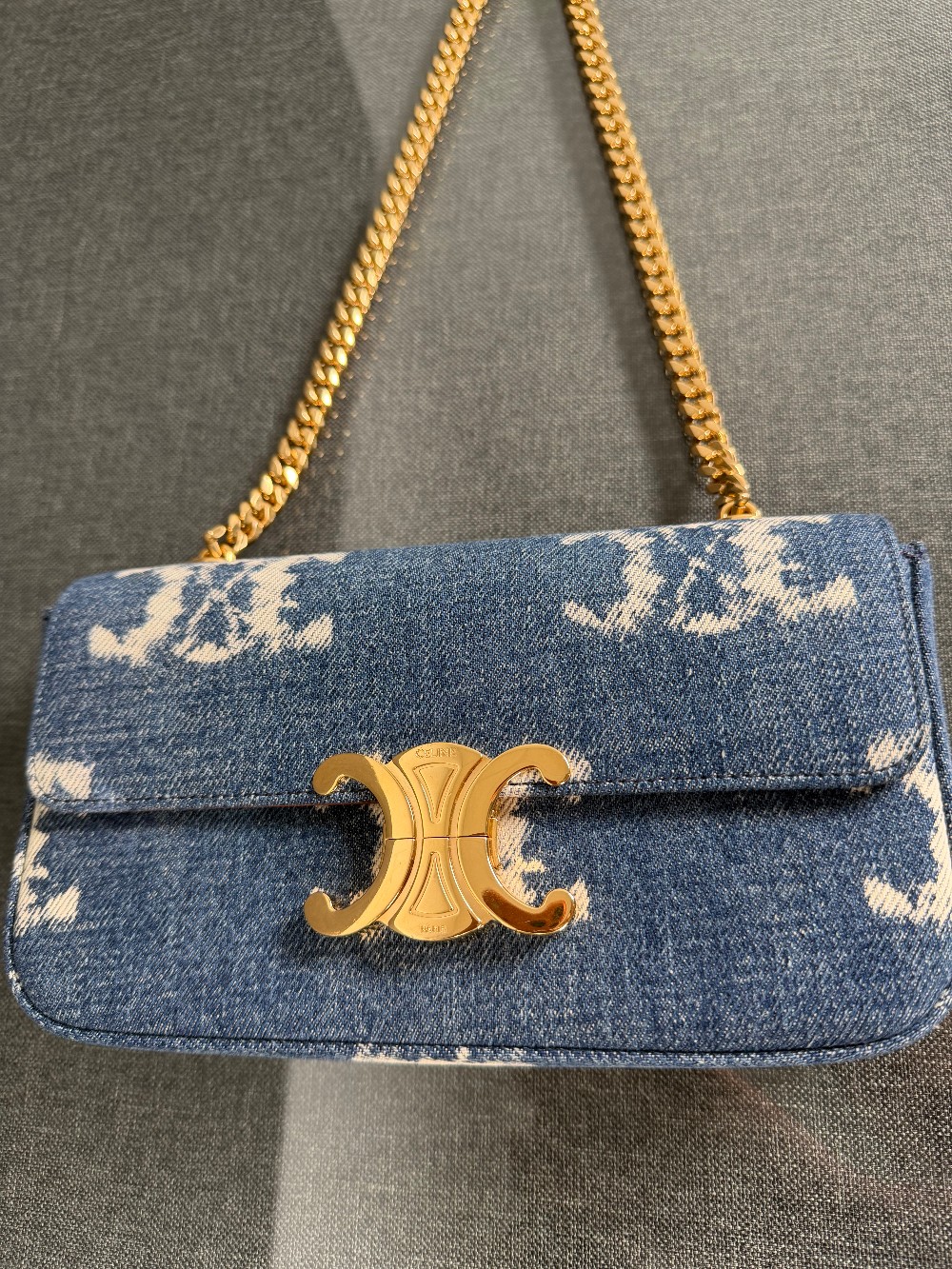 This is an authentic CELINE Denim Triomphe Chain Shoulder Bag in Navy and Tan. This chic bag is crafted of blue denim with the Celine triomphe motif. The bag features gold hardware including a chain shoulder strap and triomphe front closure. The front flap opens to a light brown leather interior with a patch pocket.