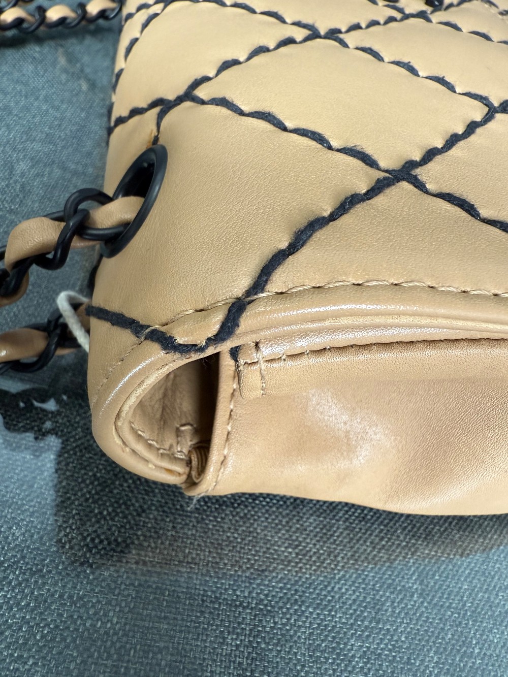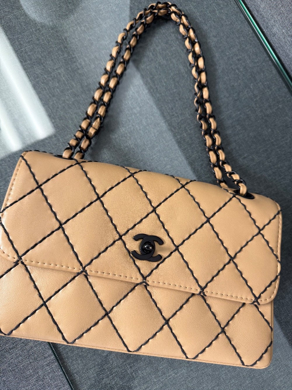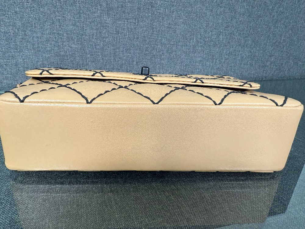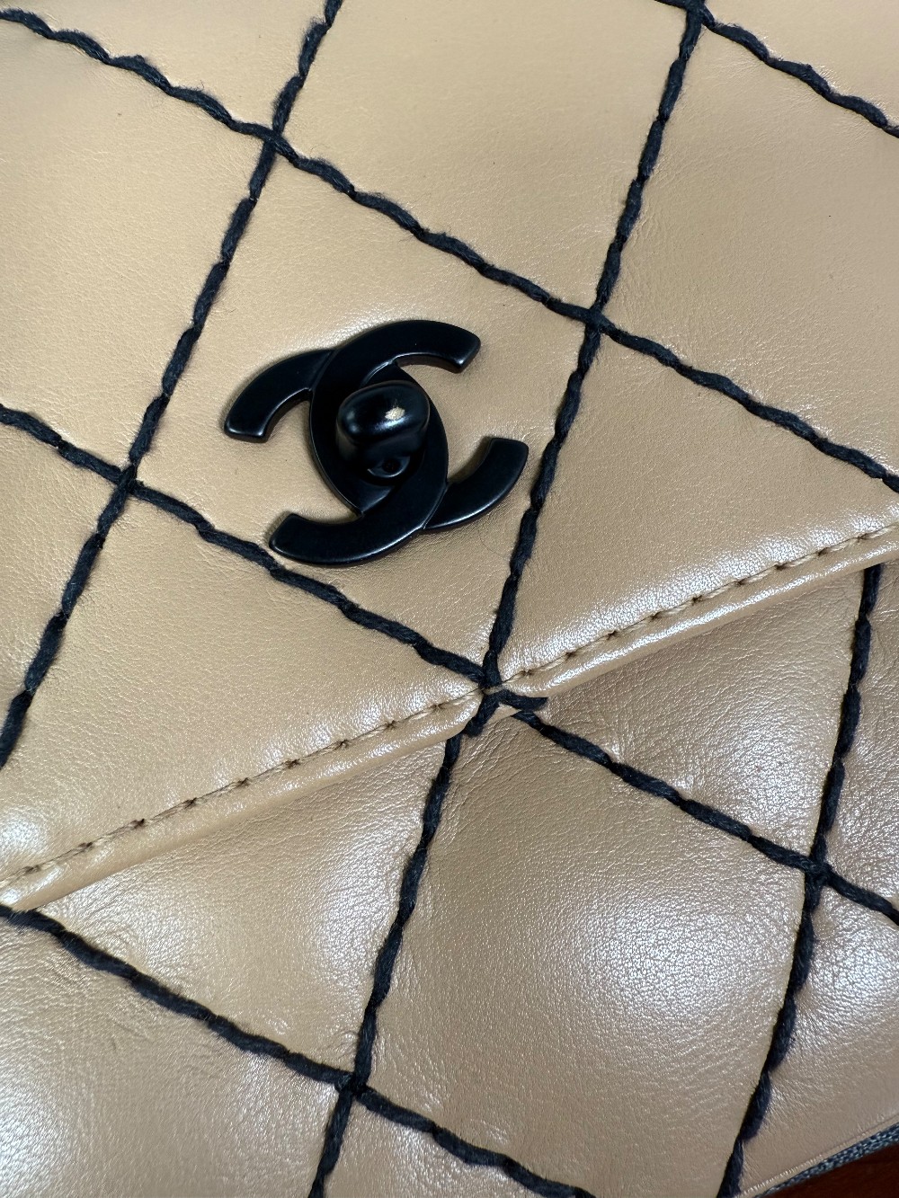 It is crafted from beige or caramel-colored leather, likely lambskin or calfskin, with a soft and luxurious feel.The bag features a distinctive diamond quilting pattern highlighted by contrasting black "wild stitching".