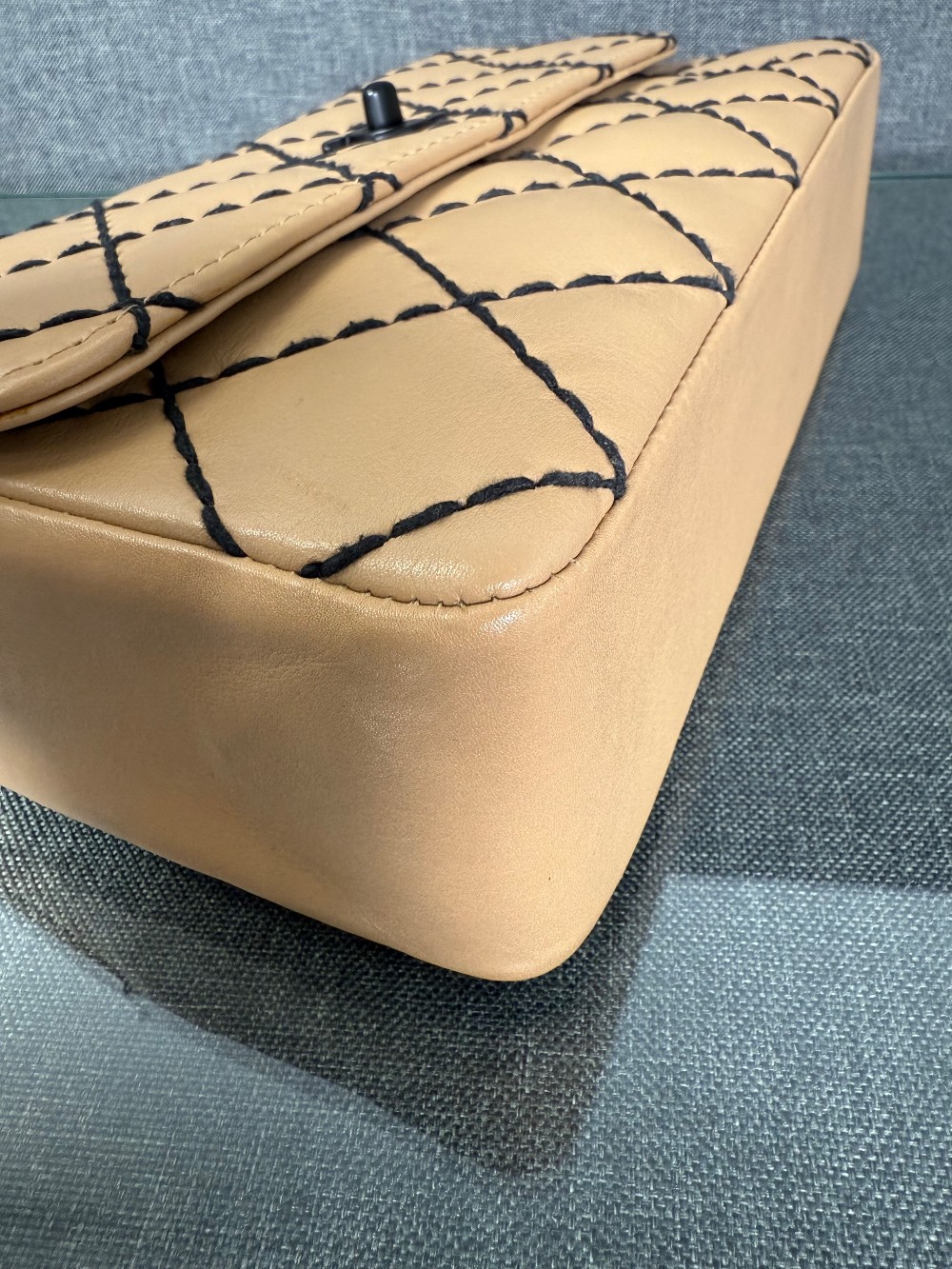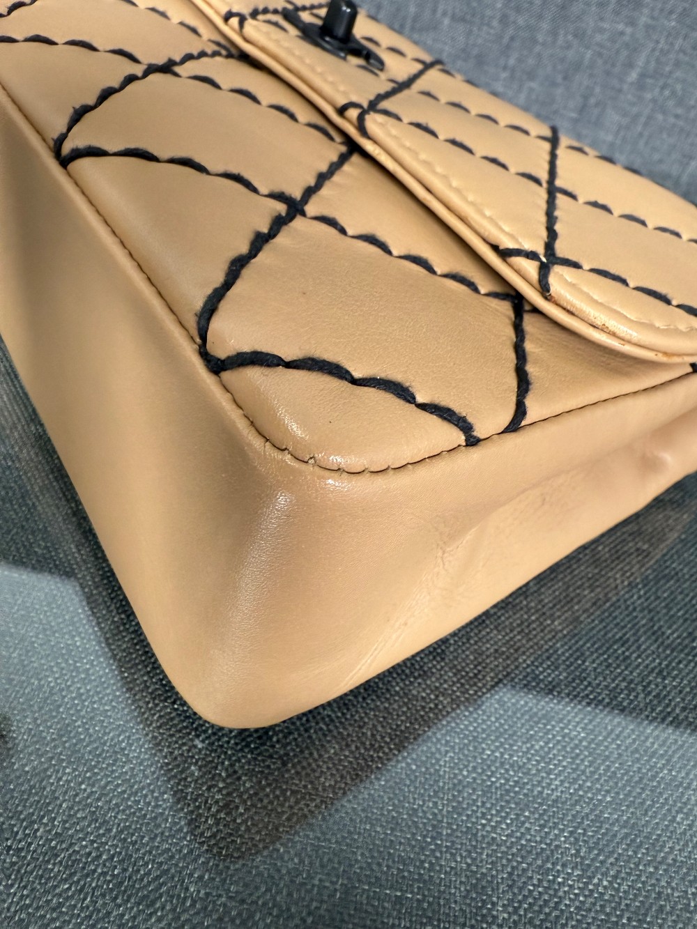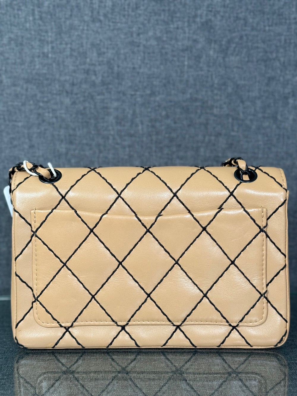 It is crafted from beige or caramel-colored leather, likely lambskin or calfskin, with a soft and luxurious feel.The bag features a distinctive diamond quilting pattern highlighted by contrasting black "wild stitching".