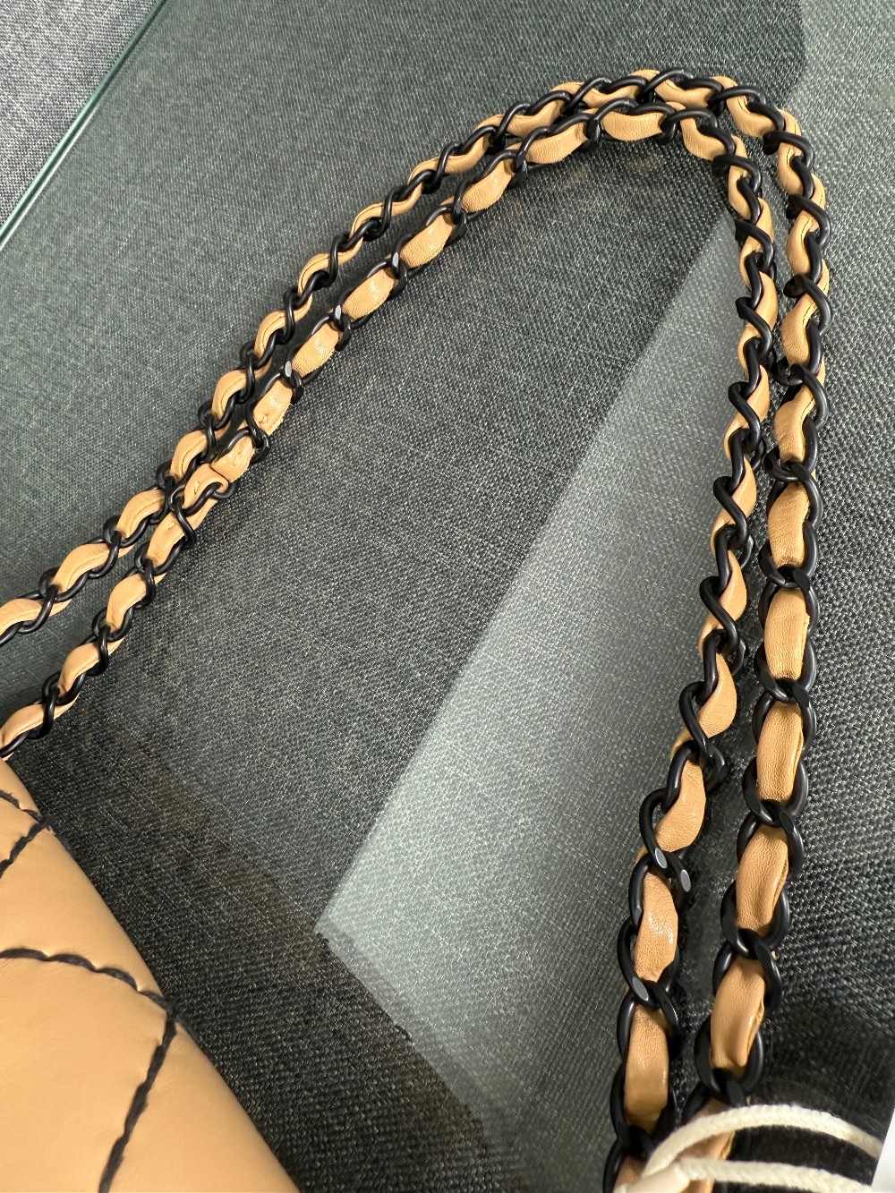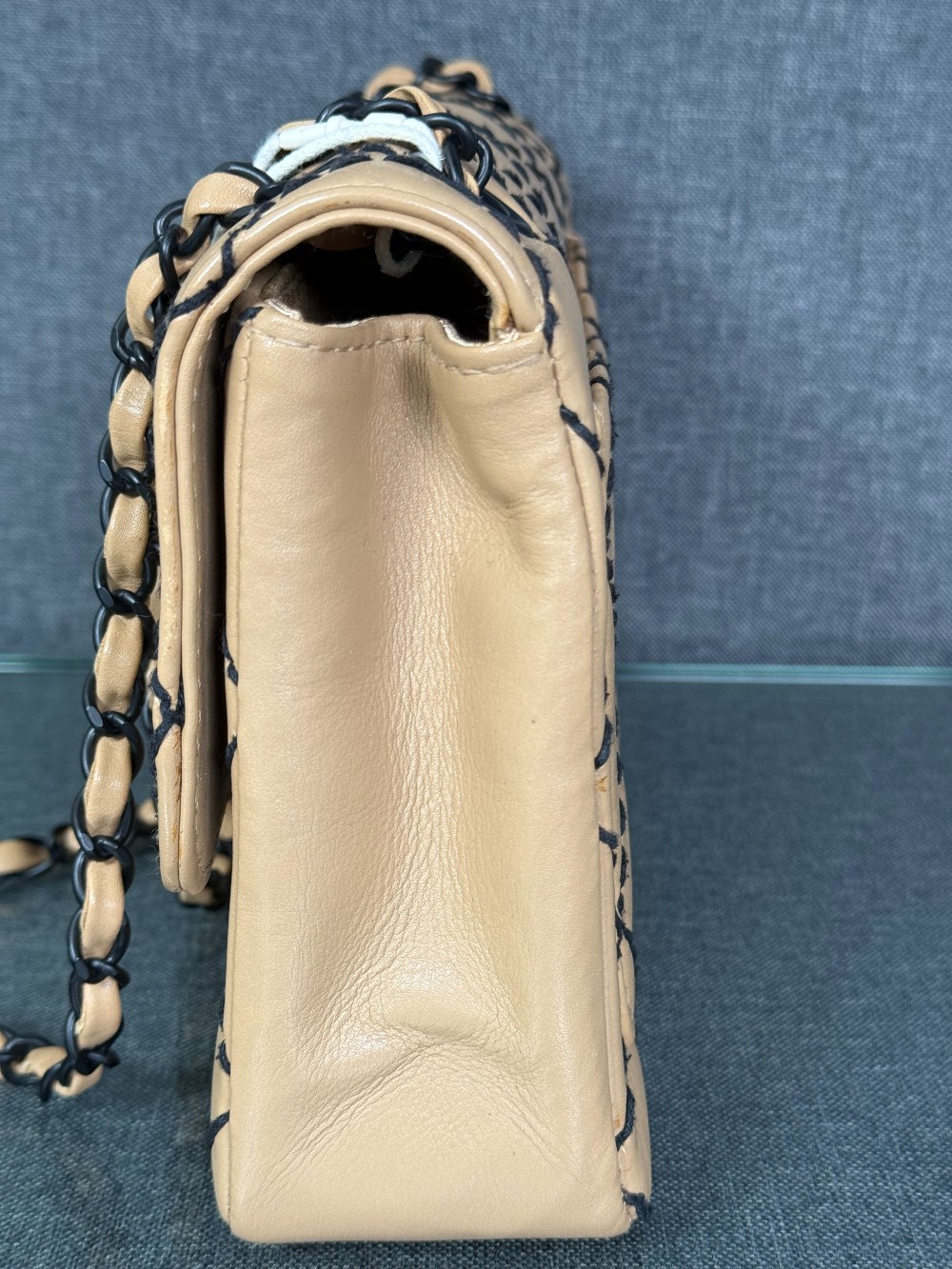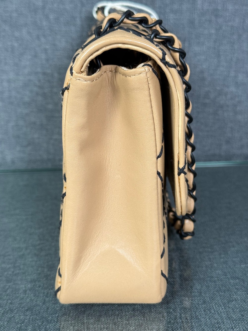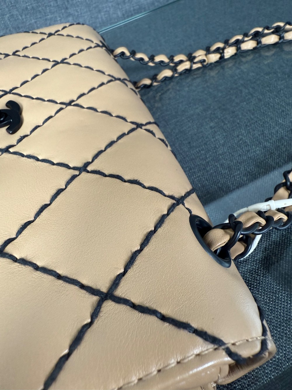 It is crafted from beige or caramel-colored leather, likely lambskin or calfskin, with a soft and luxurious feel.The bag features a distinctive diamond quilting pattern highlighted by contrasting black "wild stitching".
