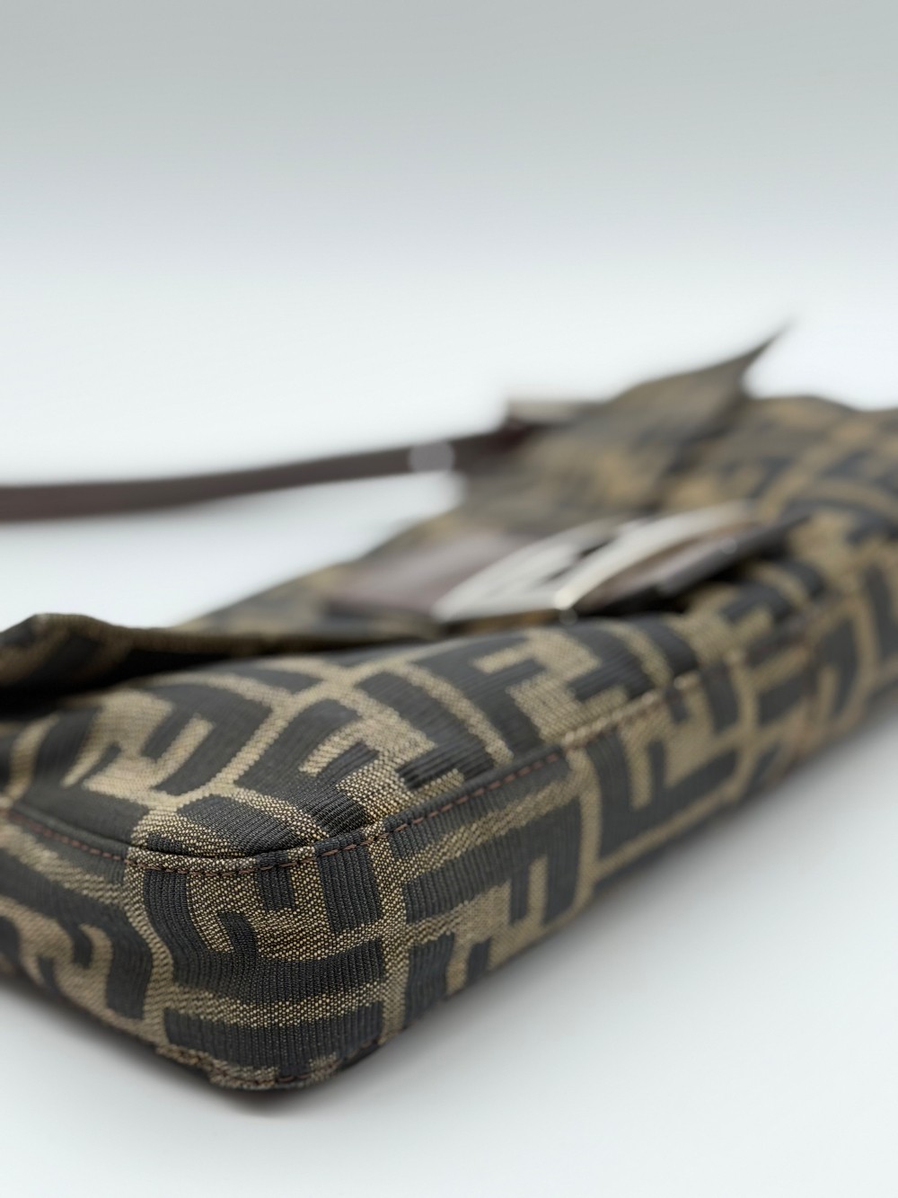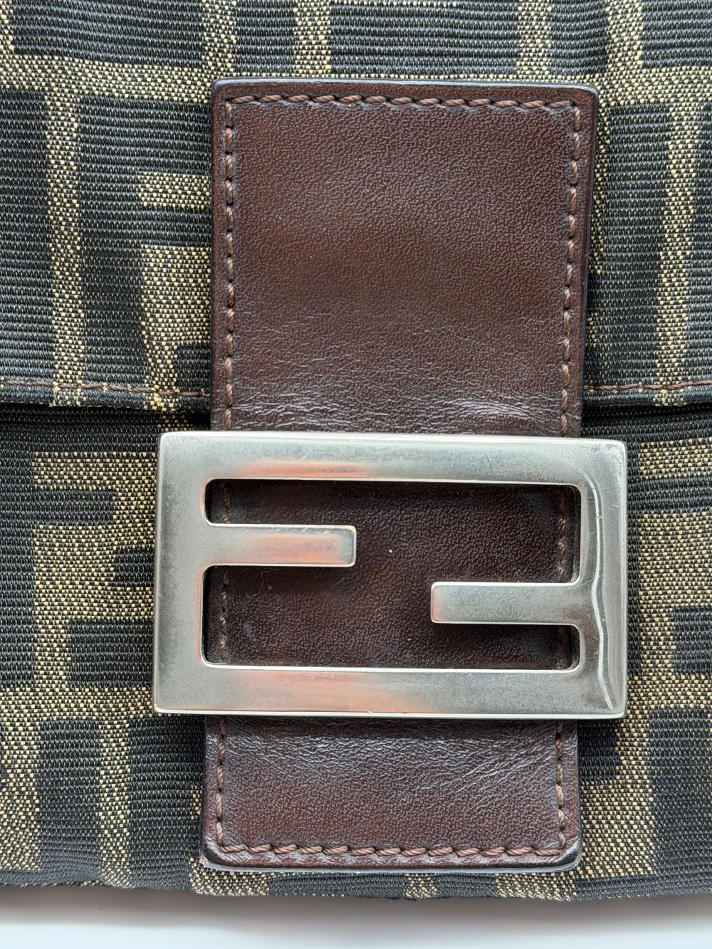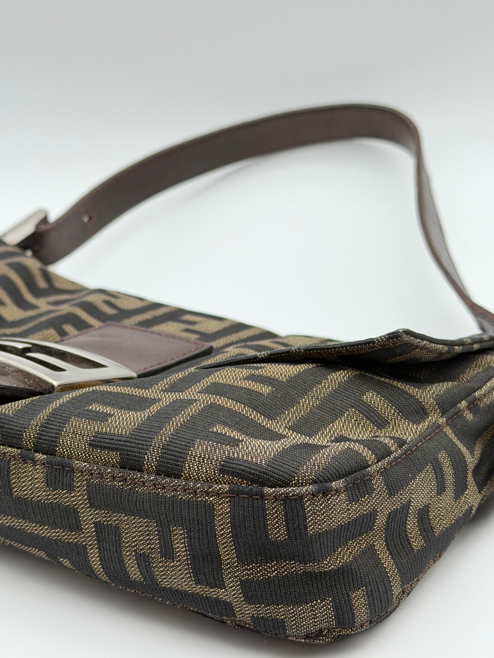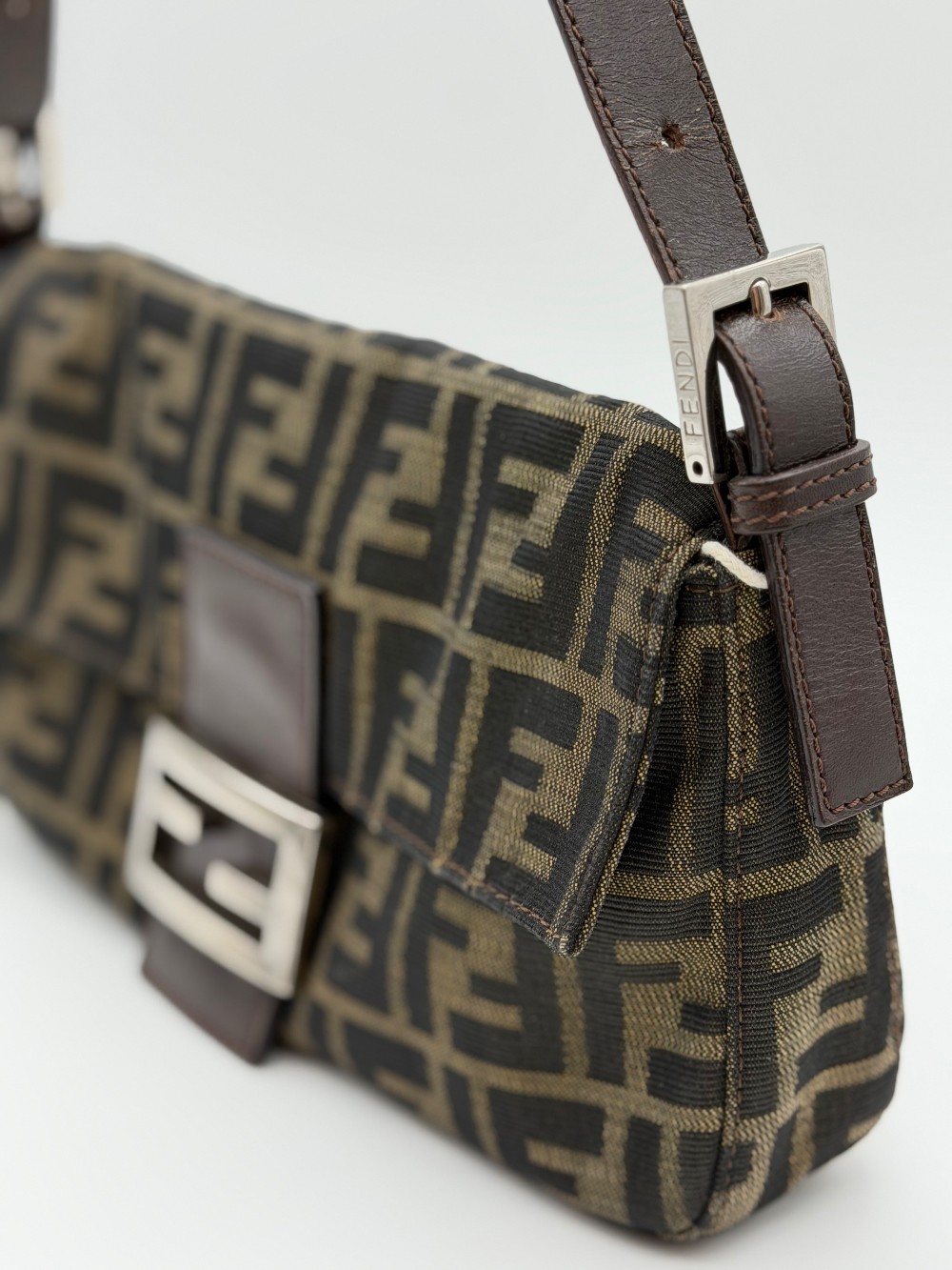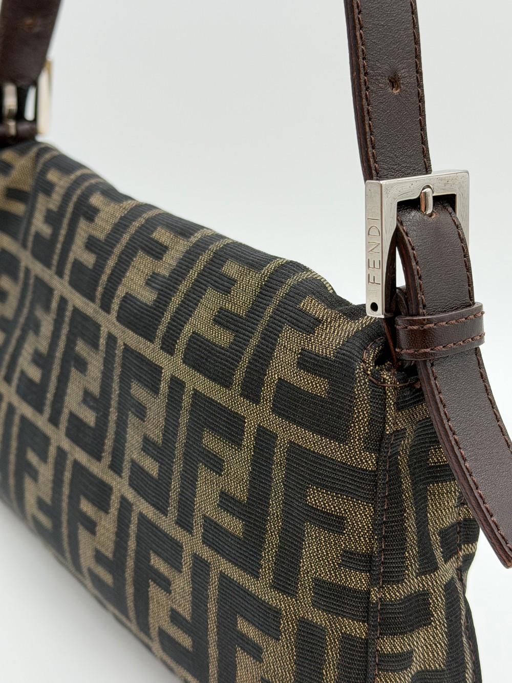 This is an authentic FENDI Zucca Baguette in Tobacco. This shoulder bag is crafted of Fendi monogram canvas in brown. It features an adjustable brown leather shoulder strap and crossover flap with silver-plated FF emblem on the front. This opens with a magnetic snap to a brown fabric interior with a zippered pocket.