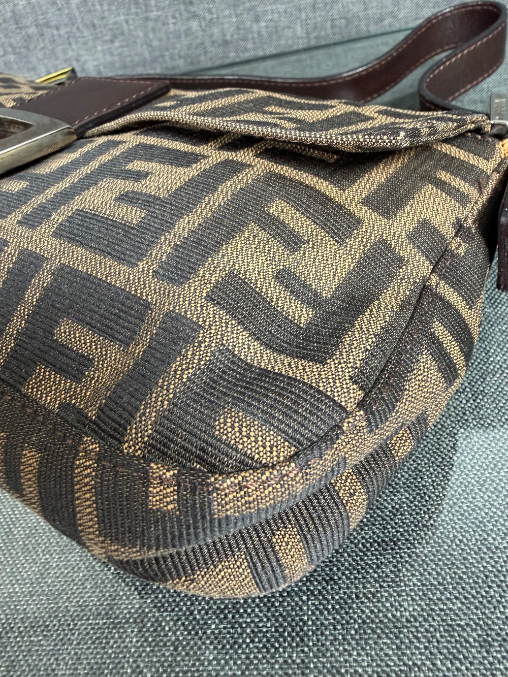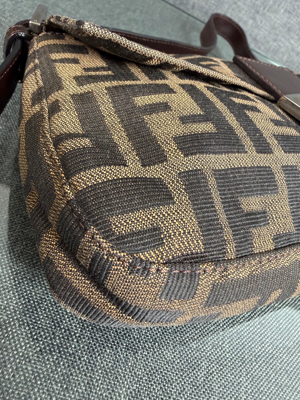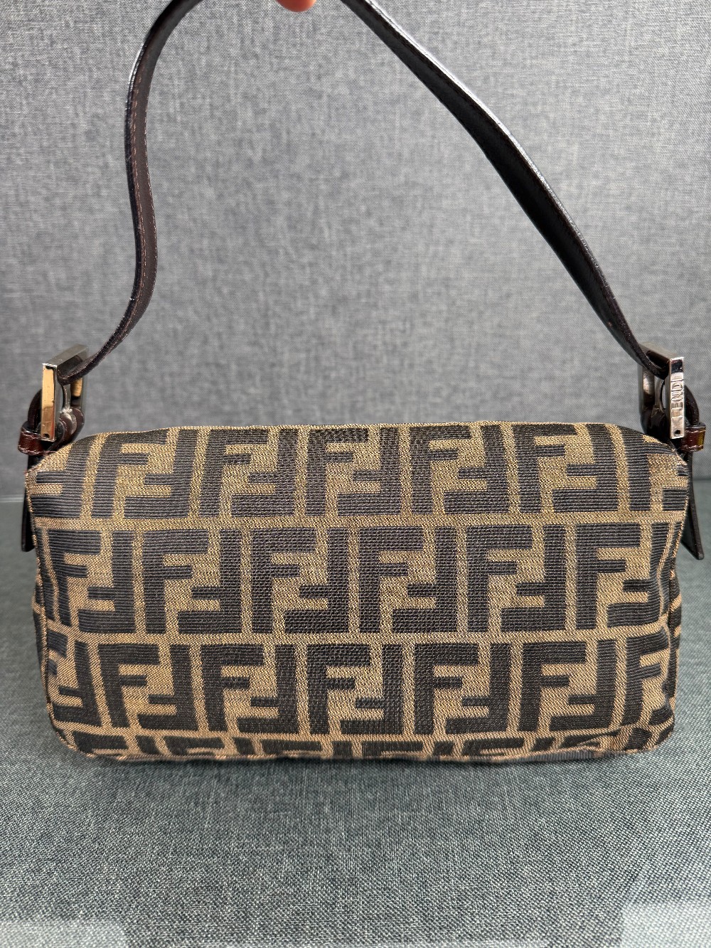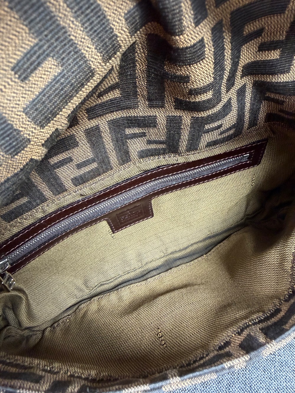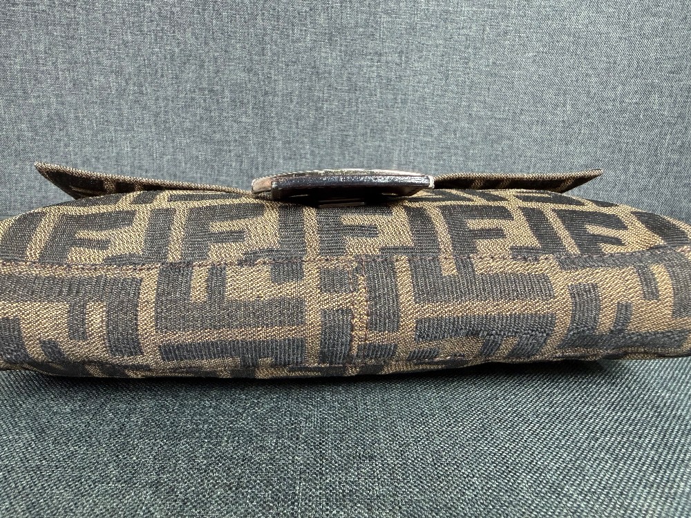 This is an authentic FENDI Zucca Baguette in Tobacco. This stylish baguette is crafted of Fendi Zucca canvas in brown. The bag features a dark chocolate brown looping leather shoulder strap and trim with a facing flap and silver hardware with a matching FF logo. This opens to a brown fabric interior with a zipper pocket.