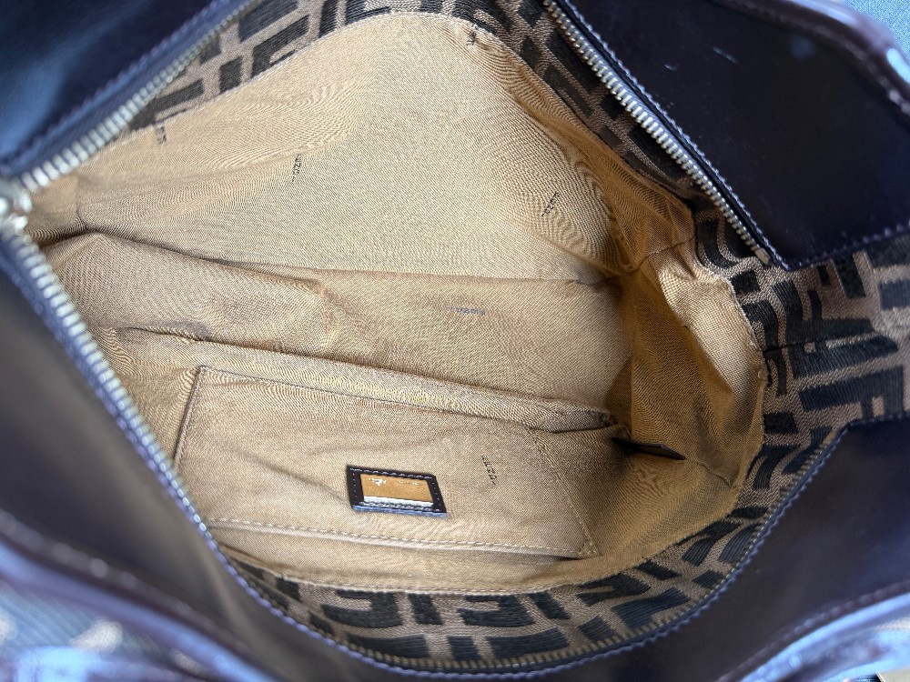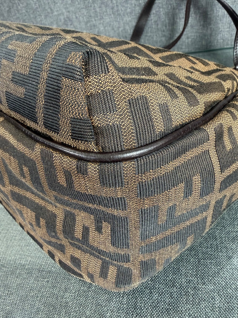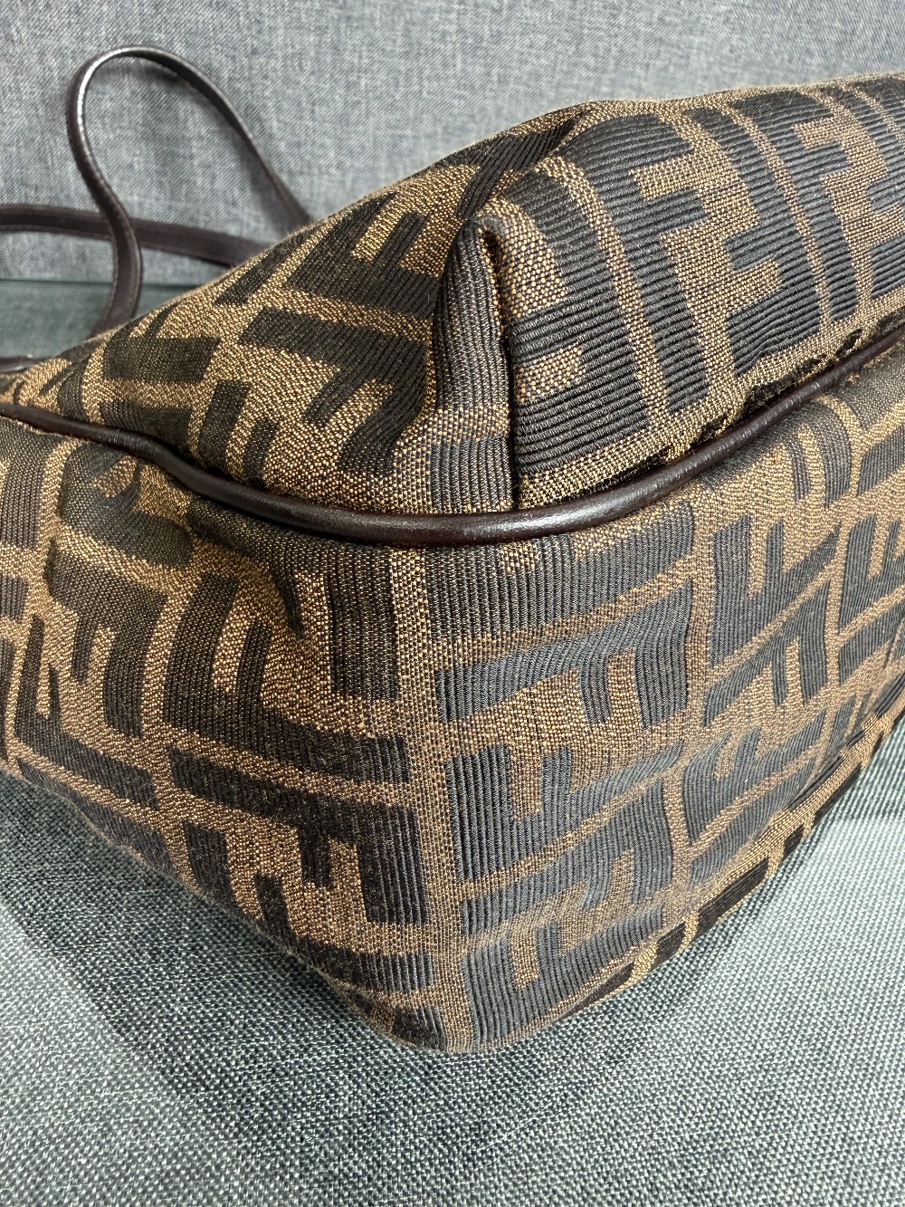 This piece blends iconic FF canvas with leather accents, delivering a stylish and functional carry for everyday use.