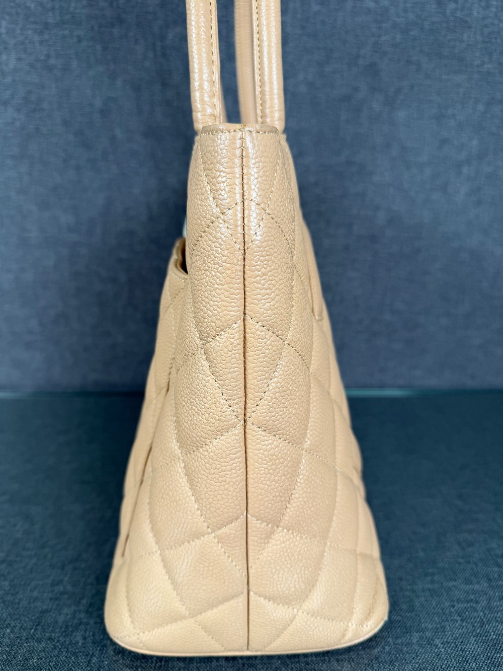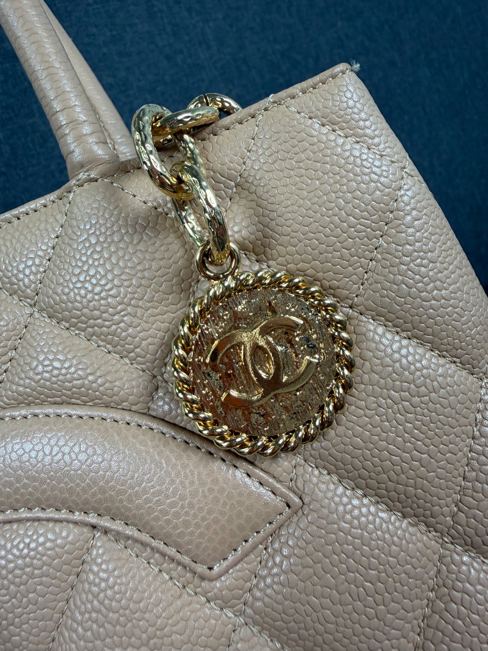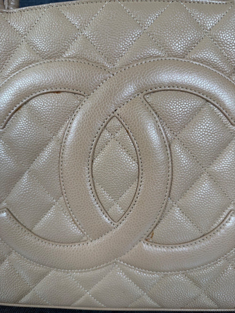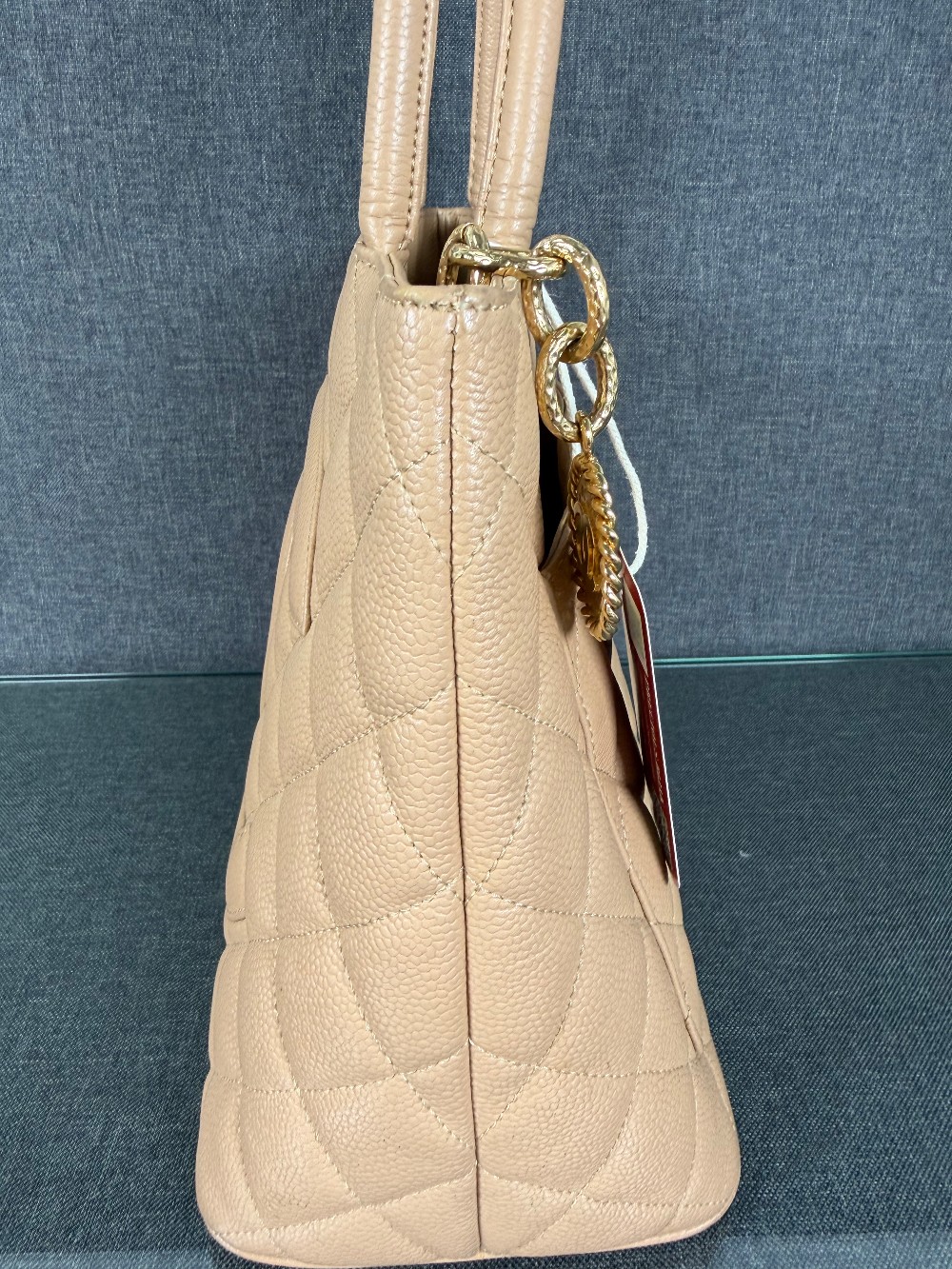 This is an authentic CHANEL Caviar Quilted Medallion Tote in Beige. This classic tote is crafted of diamond-quilted textured caviar leather in beige. The handbag features a rear patch pocket, tall rolled leather top handles, and a gold CC logo patch. The top zipper opens to a smooth matching leather interior with zipper and patch pockets.