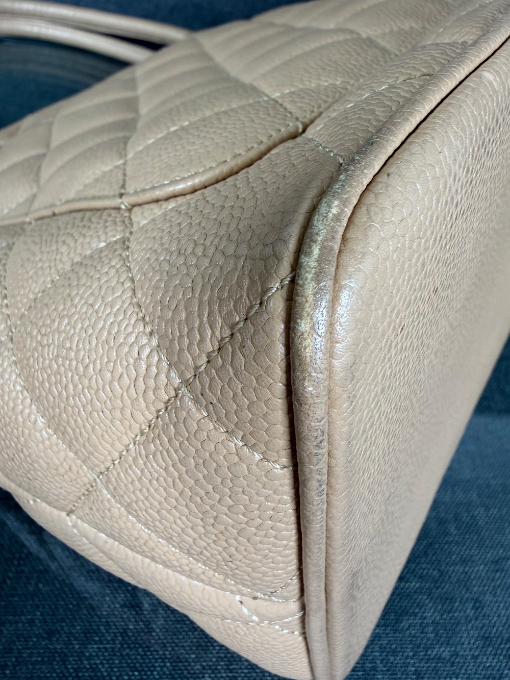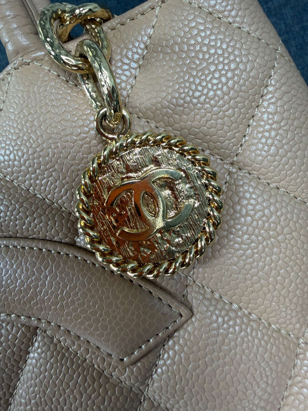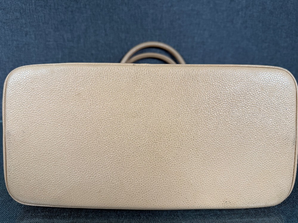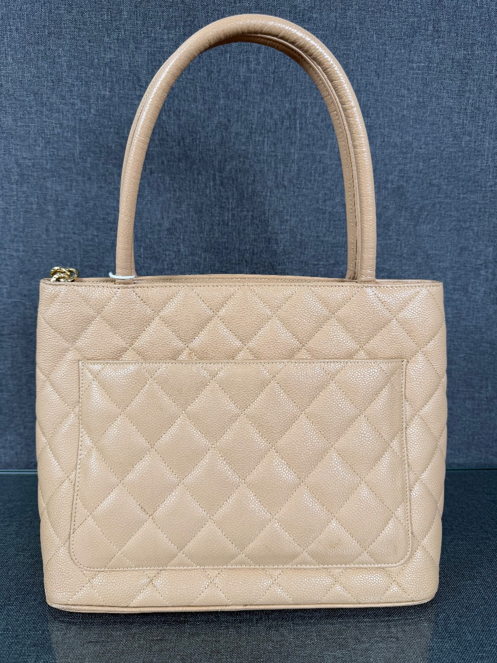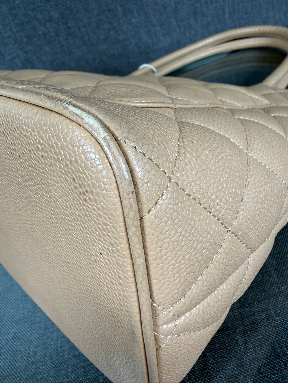 This is an authentic CHANEL Caviar Quilted Medallion Tote in Beige. This classic tote is crafted of diamond-quilted textured caviar leather in beige. The handbag features a rear patch pocket, tall rolled leather top handles, and a gold CC logo patch. The top zipper opens to a smooth matching leather interior with zipper and patch pockets.