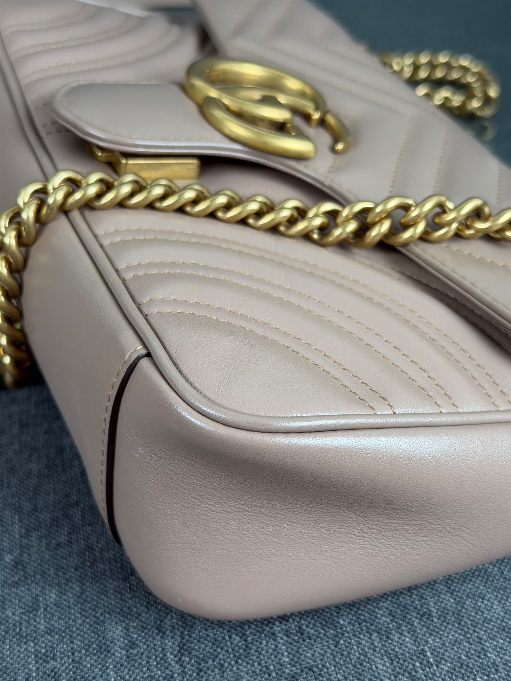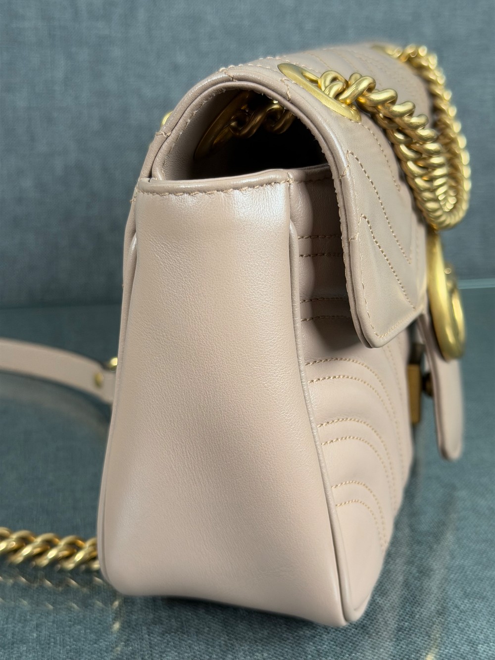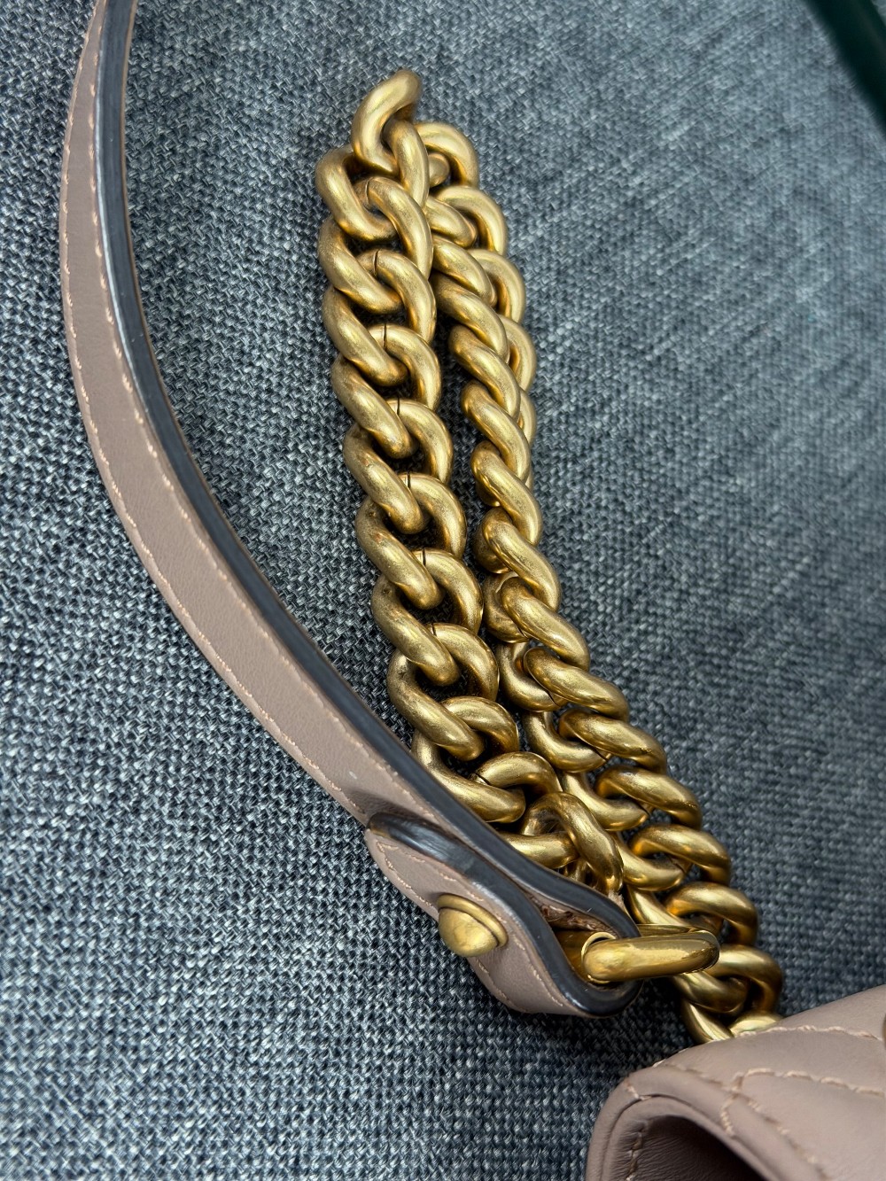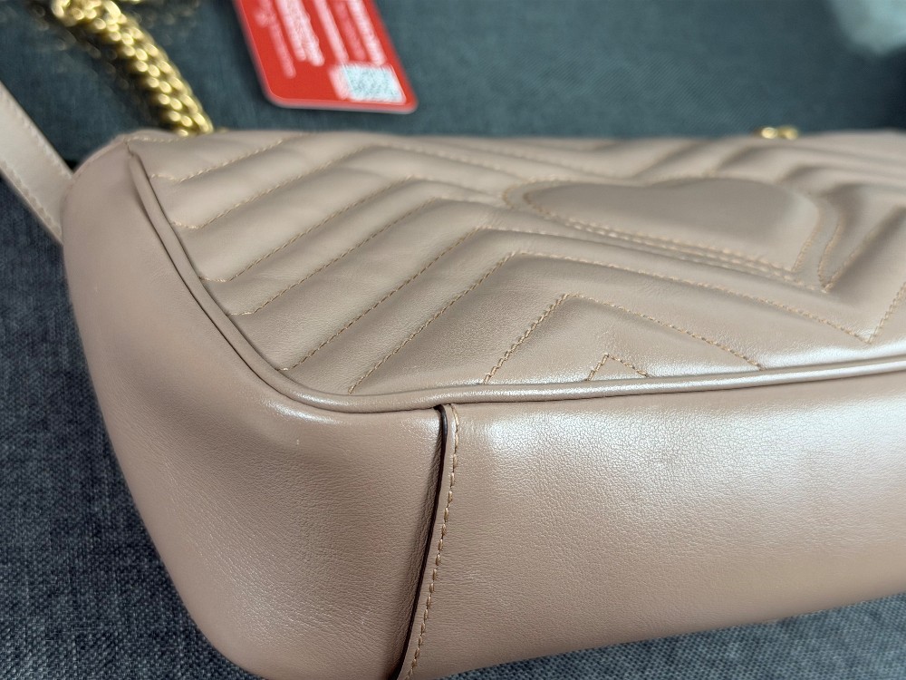 This is an authentic GUCCI Calfskin Matelasse Small GG Marmont Shoulder Bag in Porcelain Rose. This shoulder bag is crafted of calfskin leather in a beige pink with aged gold hardware. The crossover flap opens to a beige microfiber interior with a zipper pocket.