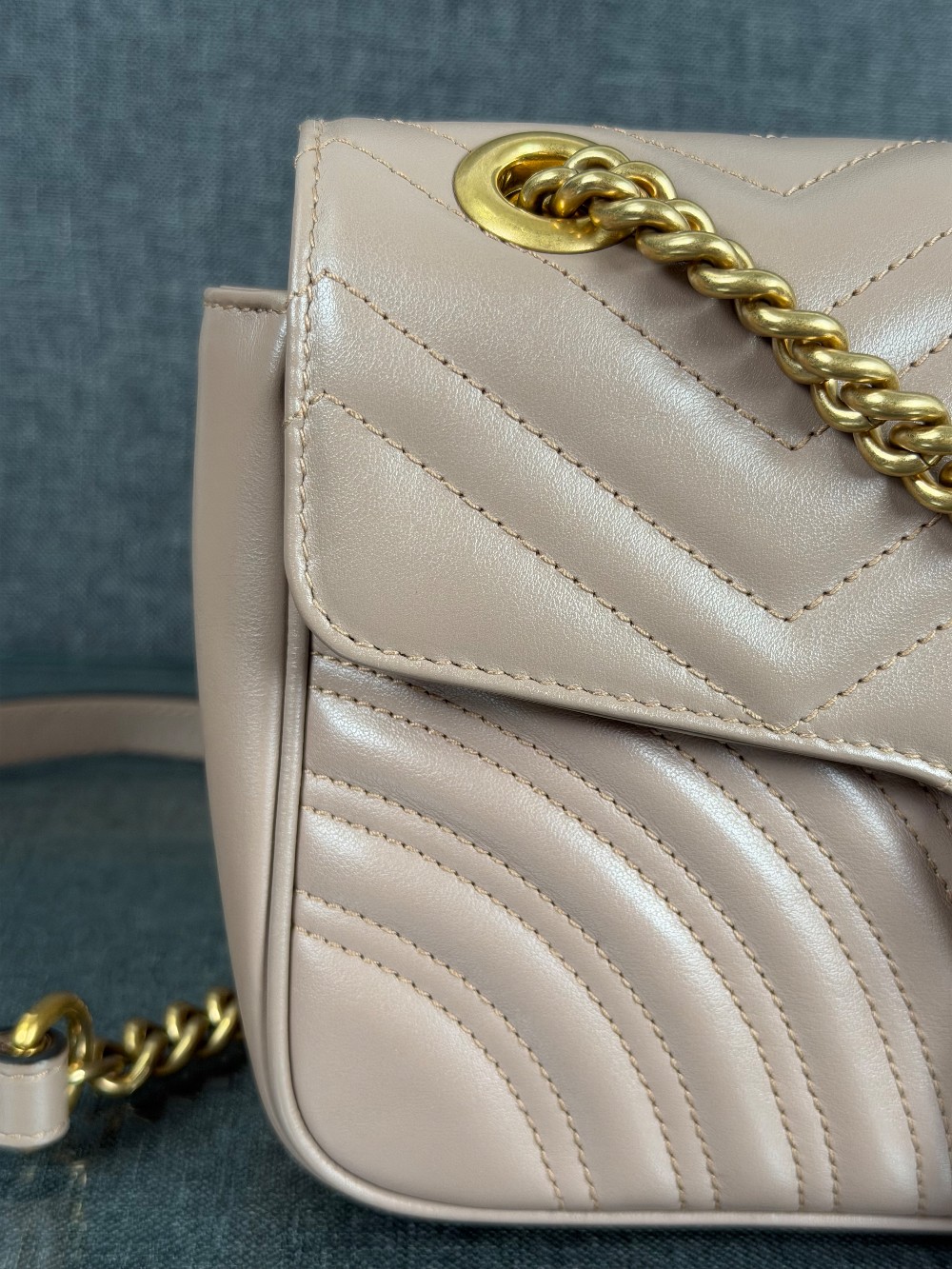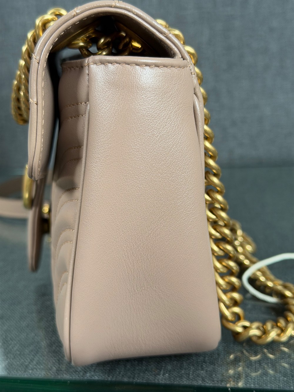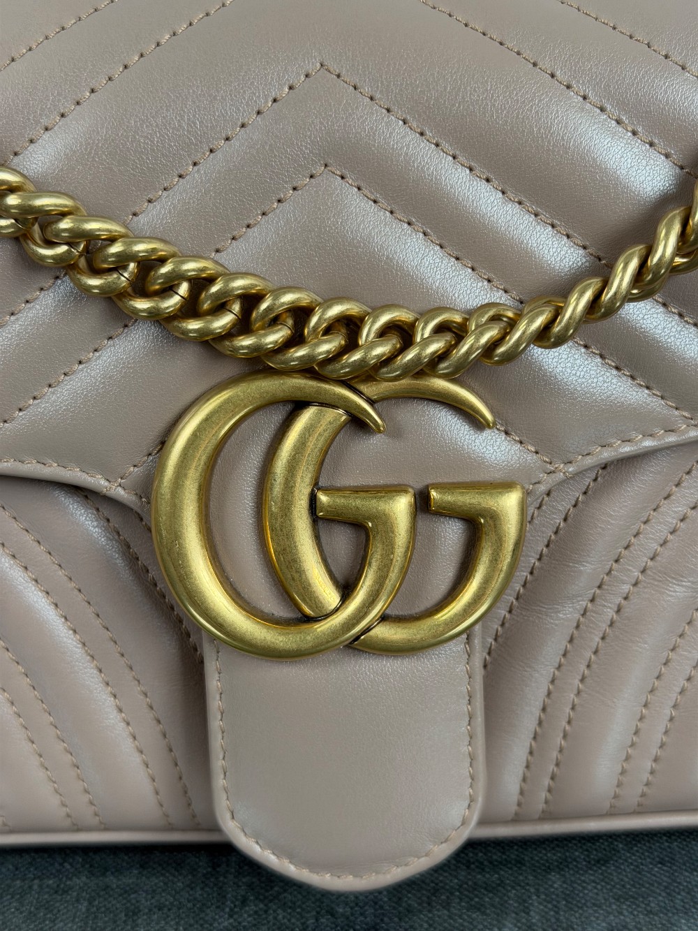 This is an authentic GUCCI Calfskin Matelasse Small GG Marmont Shoulder Bag in Porcelain Rose. This shoulder bag is crafted of calfskin leather in a beige pink with aged gold hardware. The crossover flap opens to a beige microfiber interior with a zipper pocket.