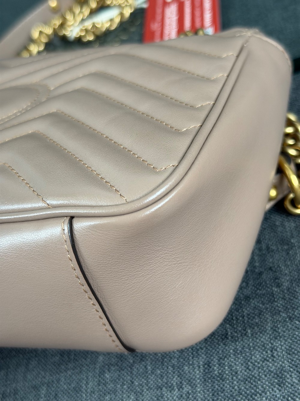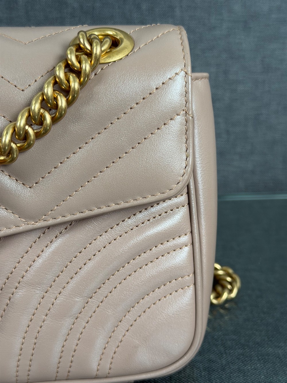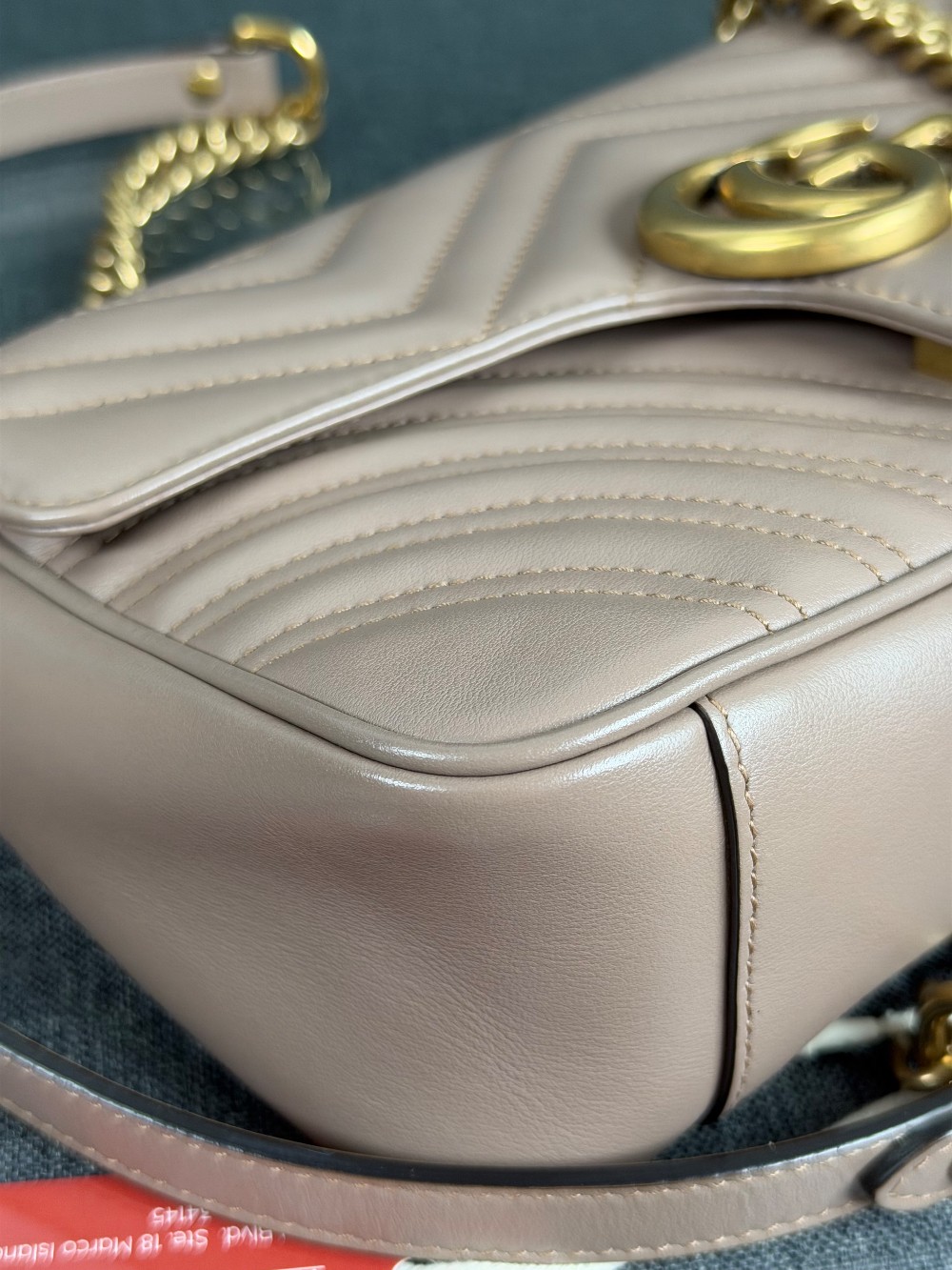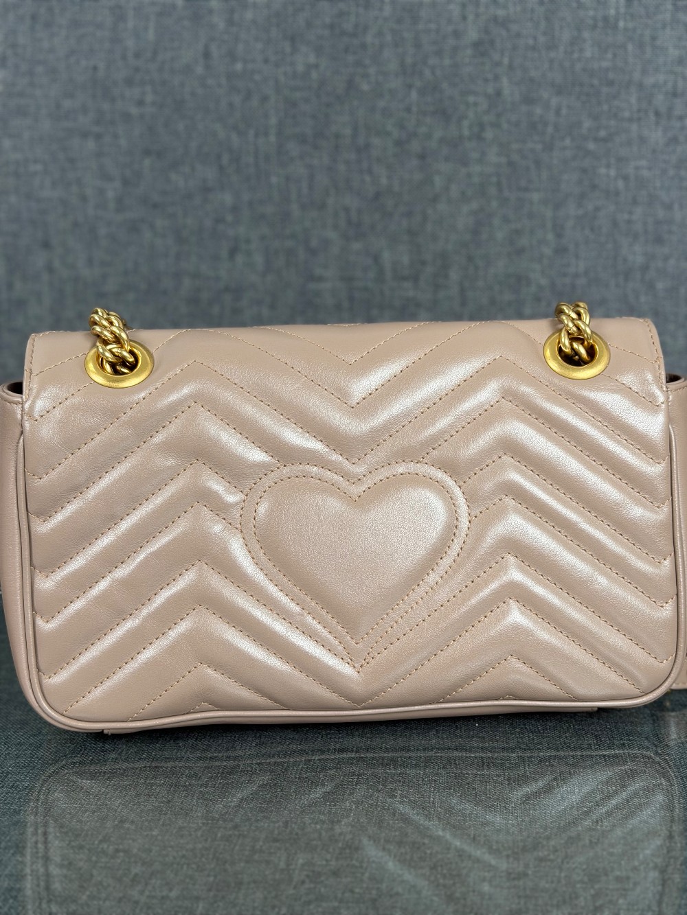 This is an authentic GUCCI Calfskin Matelasse Small GG Marmont Shoulder Bag in Porcelain Rose. This shoulder bag is crafted of calfskin leather in a beige pink with aged gold hardware. The crossover flap opens to a beige microfiber interior with a zipper pocket.