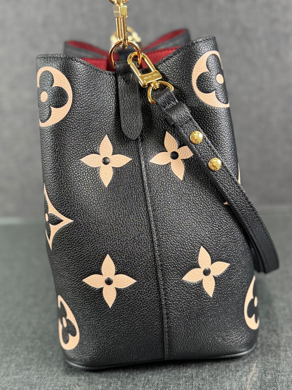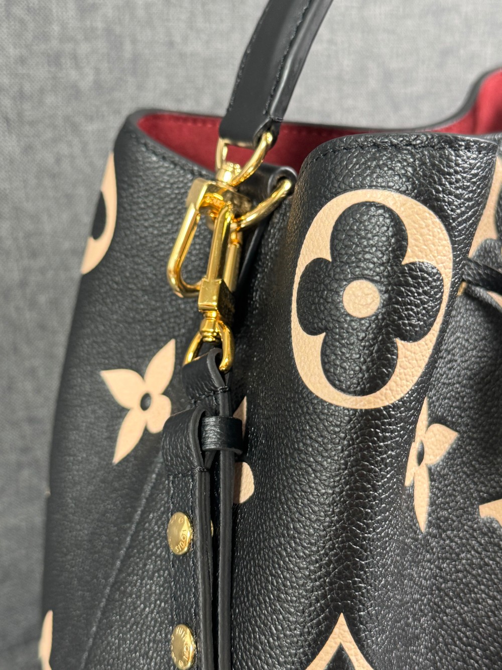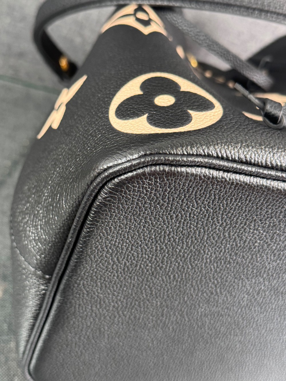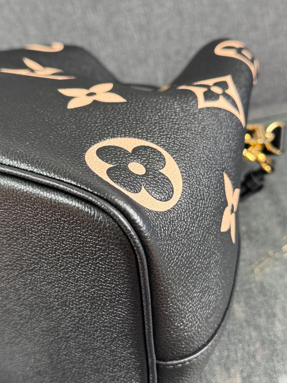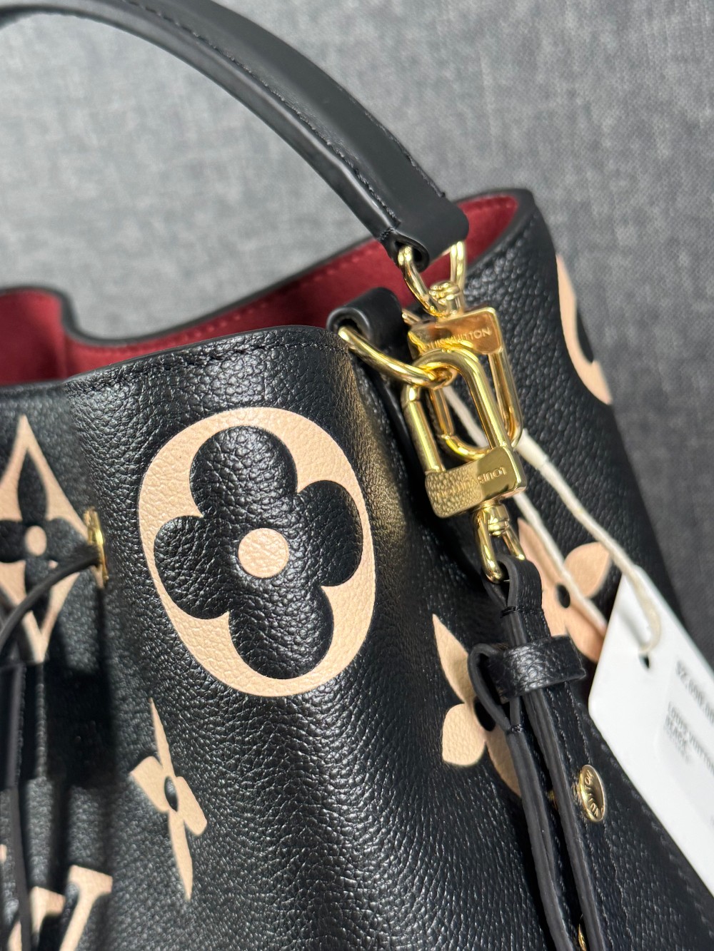 This is an authentic LOUIS VUITTON Empreinte Monogram Giant Neonoe MM in Black and Beige. This classic bucket-style shoulder bag features oversized classic Louis Vuitton monogram print on calfskin leather in beige on black. The bag features a top handle, an adjustable black leather shoulder strap with polished gold tone hardware, and a matching top cinch-cord. This opens the bag to a burgundy microfiber interior with a matching removable pochette.