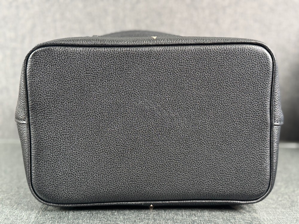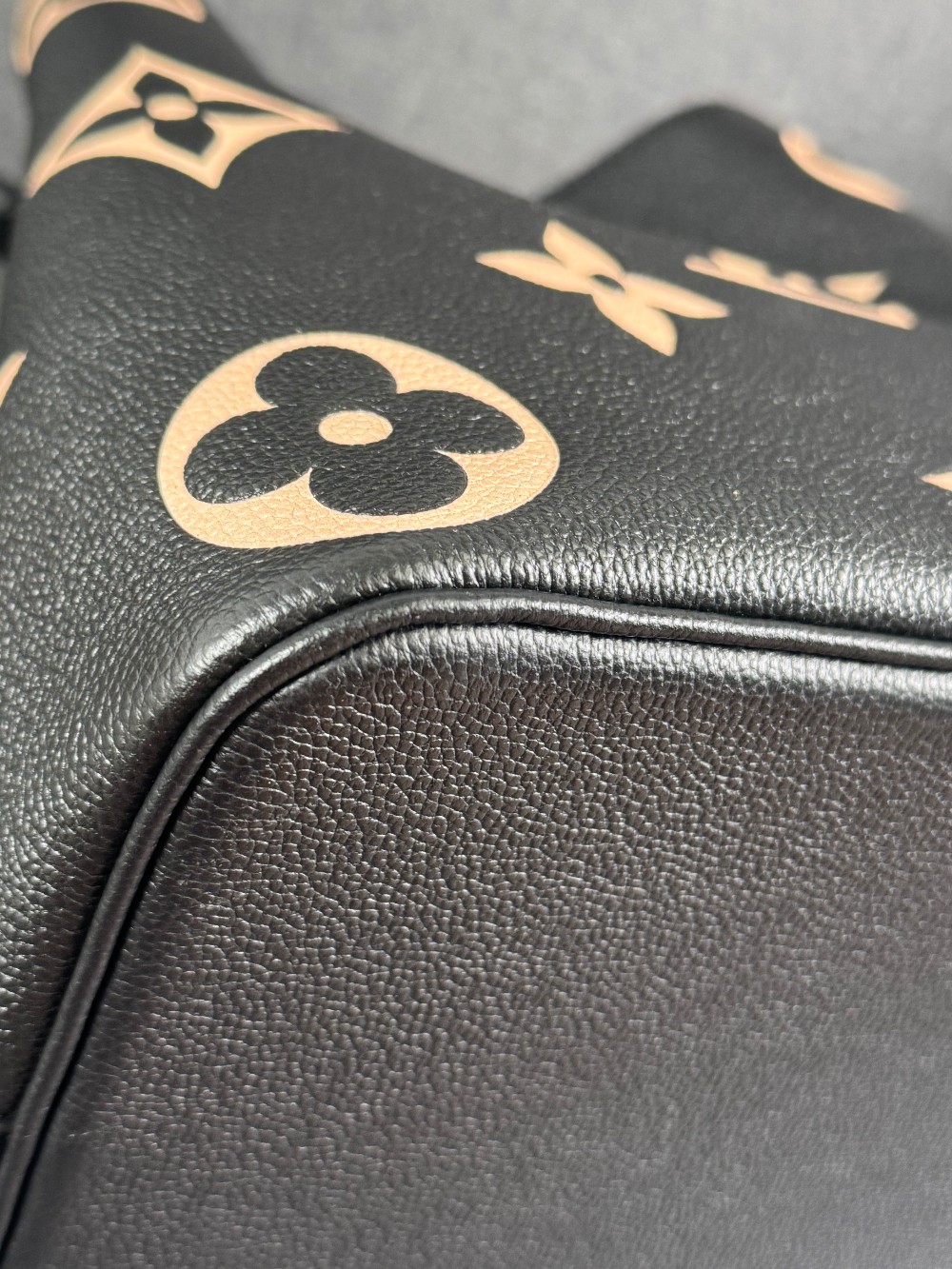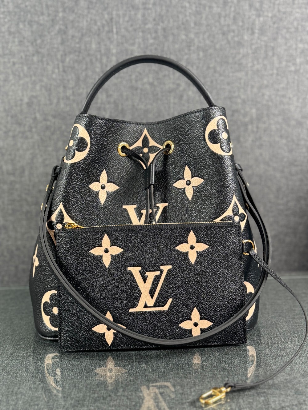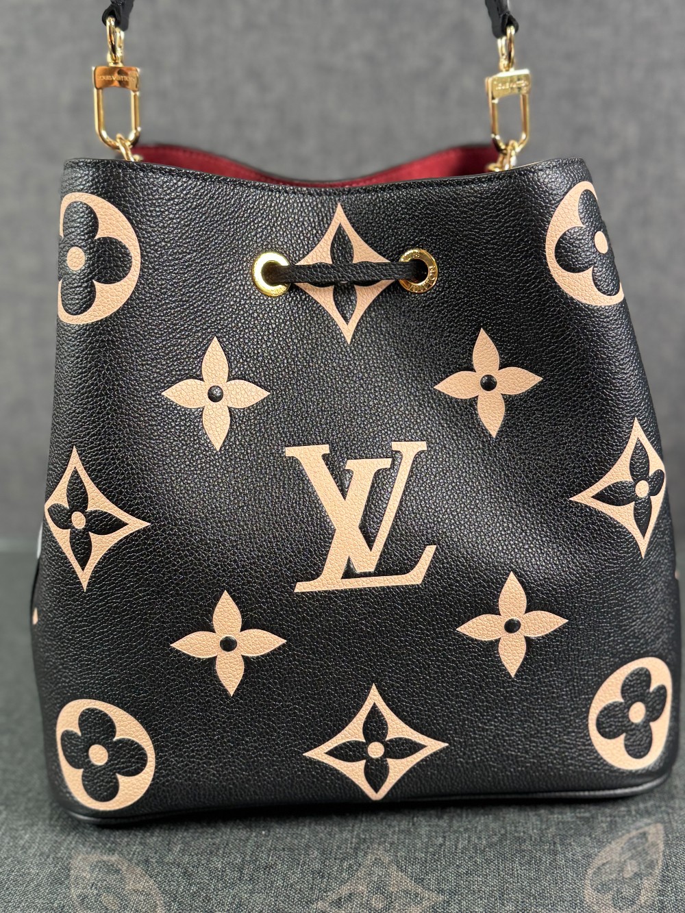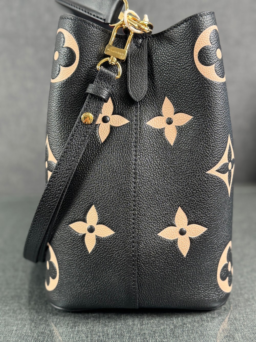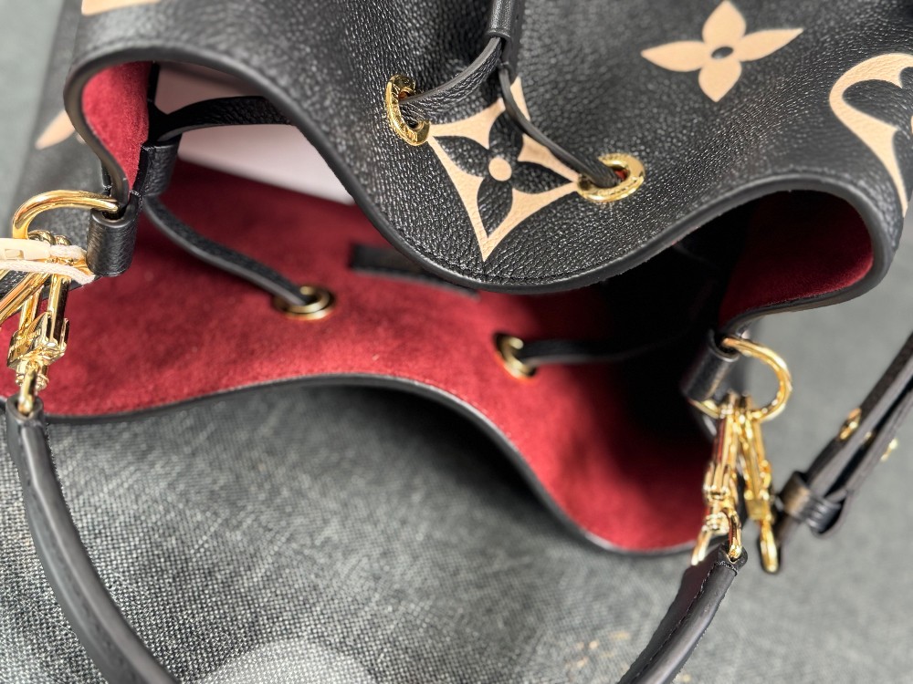 This is an authentic LOUIS VUITTON Empreinte Monogram Giant Neonoe MM in Black and Beige. This classic bucket-style shoulder bag features oversized classic Louis Vuitton monogram print on calfskin leather in beige on black. The bag features a top handle, an adjustable black leather shoulder strap with polished gold tone hardware, and a matching top cinch-cord. This opens the bag to a burgundy microfiber interior with a matching removable pochette.