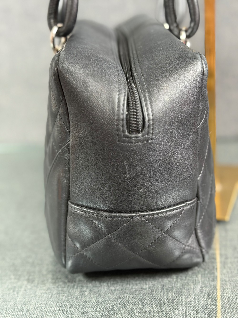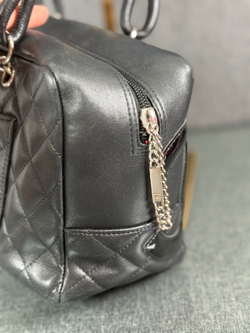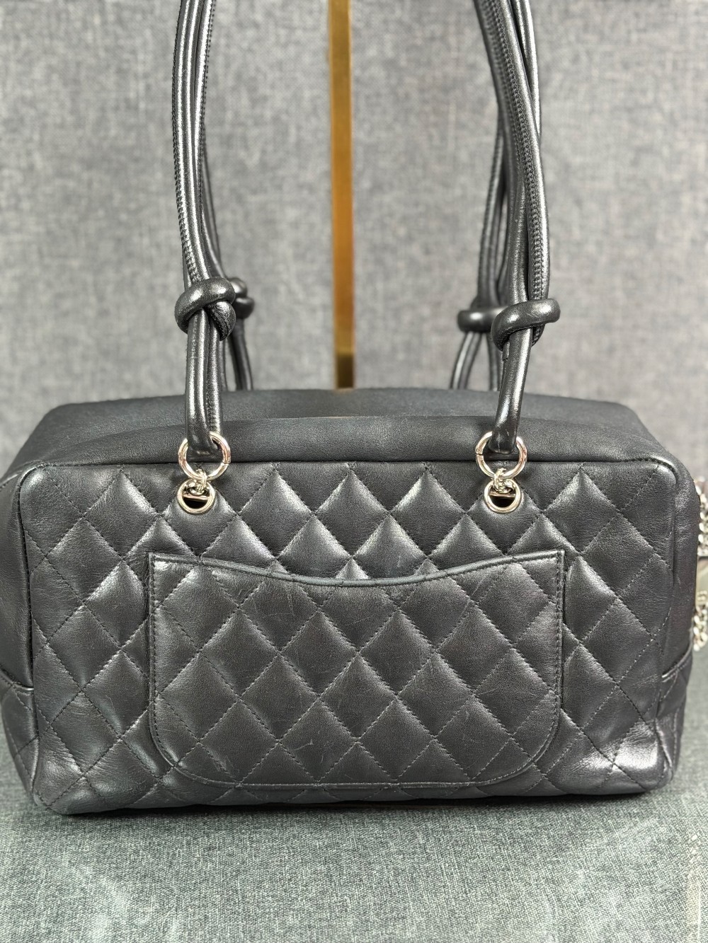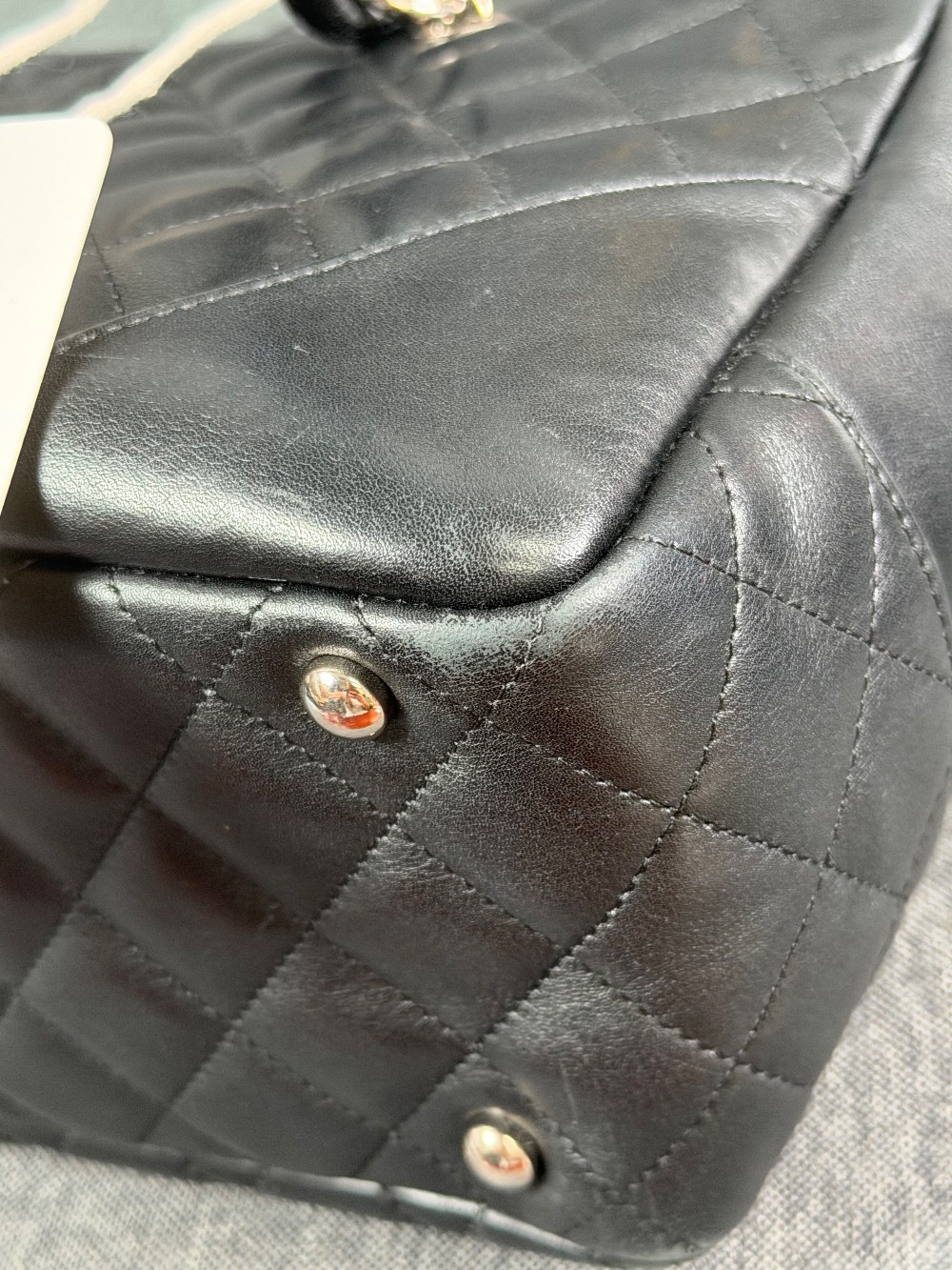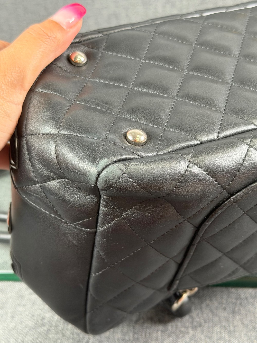 This is an authentic CHANEL Calfskin Quilted Large Cambon Bowler in Black. This distinctive shoulder is crafted of calfskin diamond-quilted leather in black. This bag features a signature of Chanel CC patch, a rear patch pocket, and thin rolled leather straps. The top zipper opens to a bright pink Chanel logo fabric interior with zipper and patch pockets.