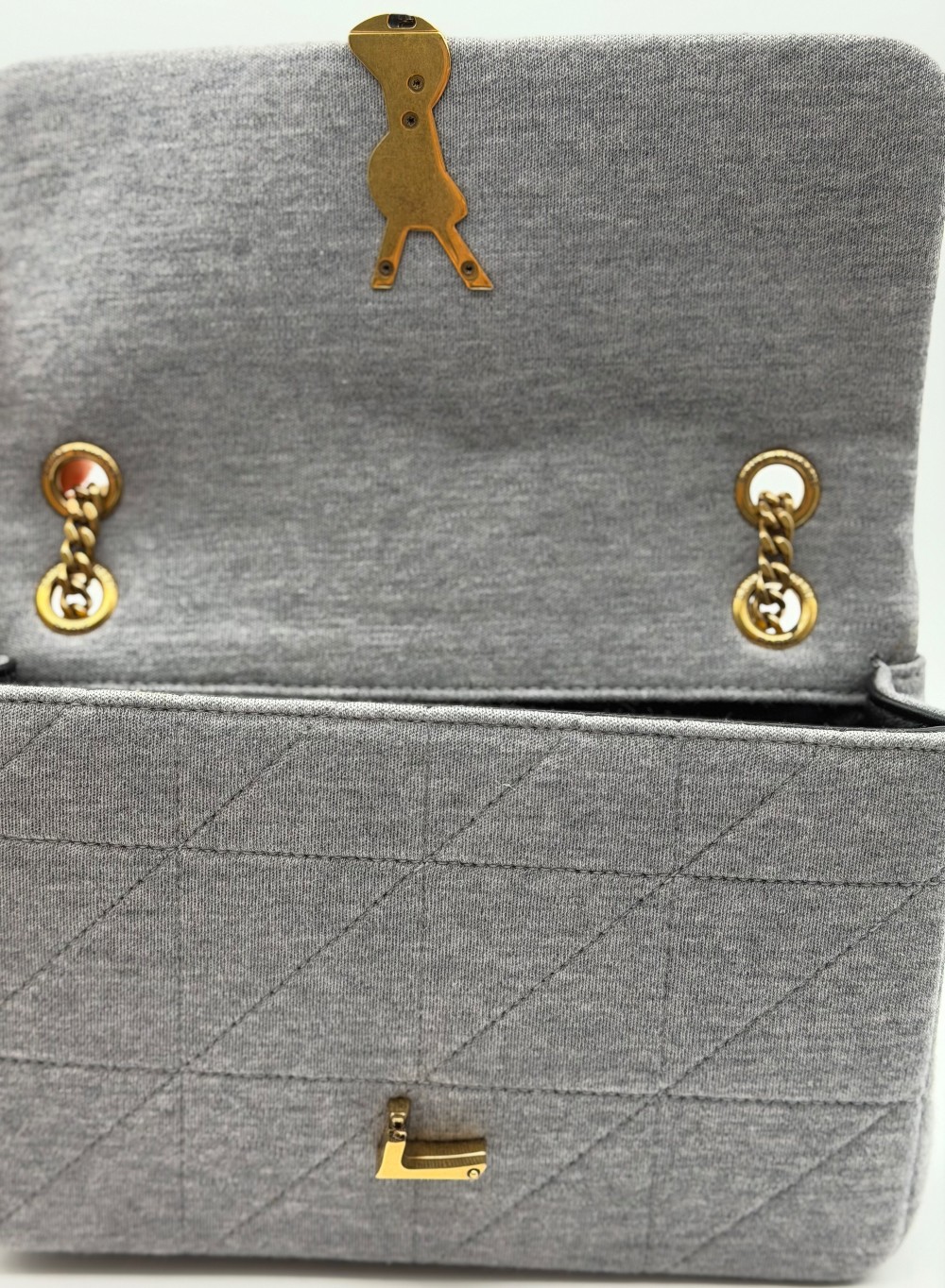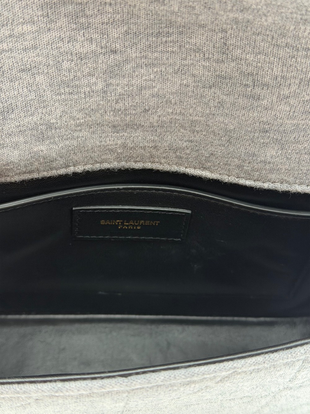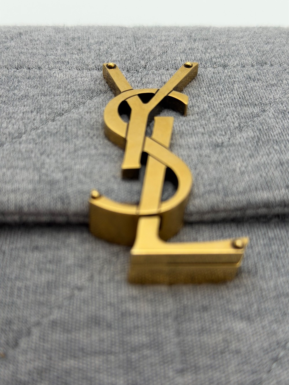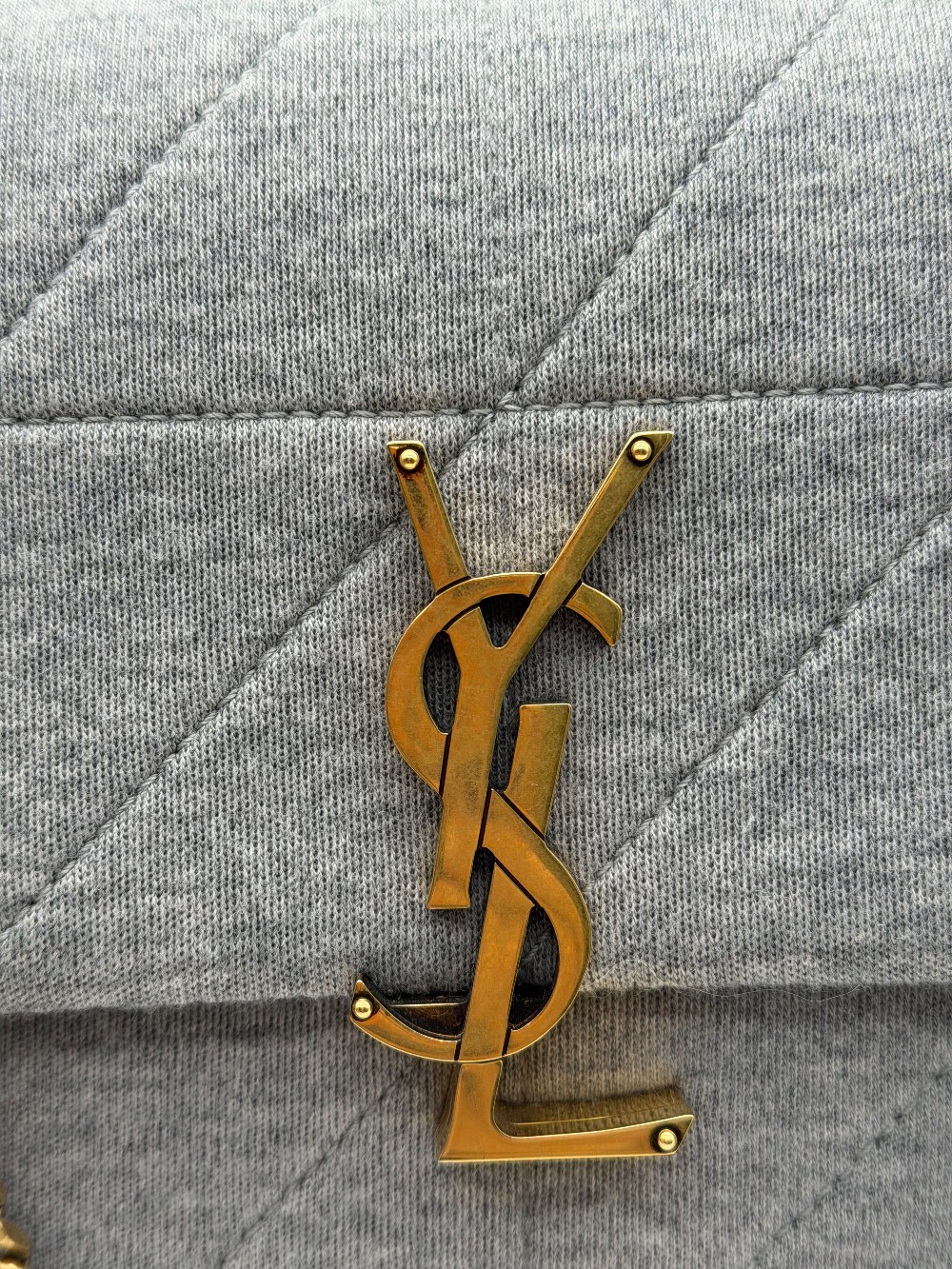 This is an authentic SAINT LAURENT Jersey Wool Patchwork Monogram Medium Jamie in Off grey. This stunning small shoulder bag is crafted of wool. The bag features an aged gold chain link cross body shoulder strap and a facing flap with an aged gold YSL logo. The flap opens to a black leather interior with a patch pocket
