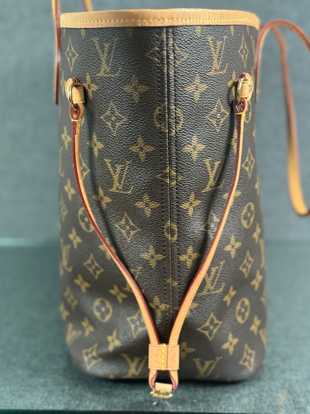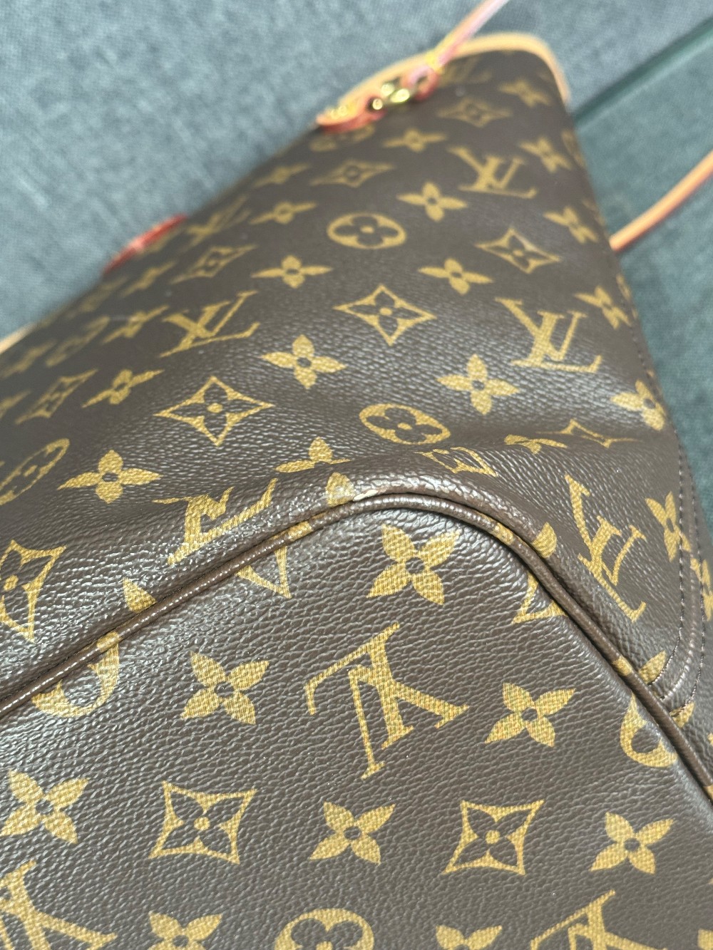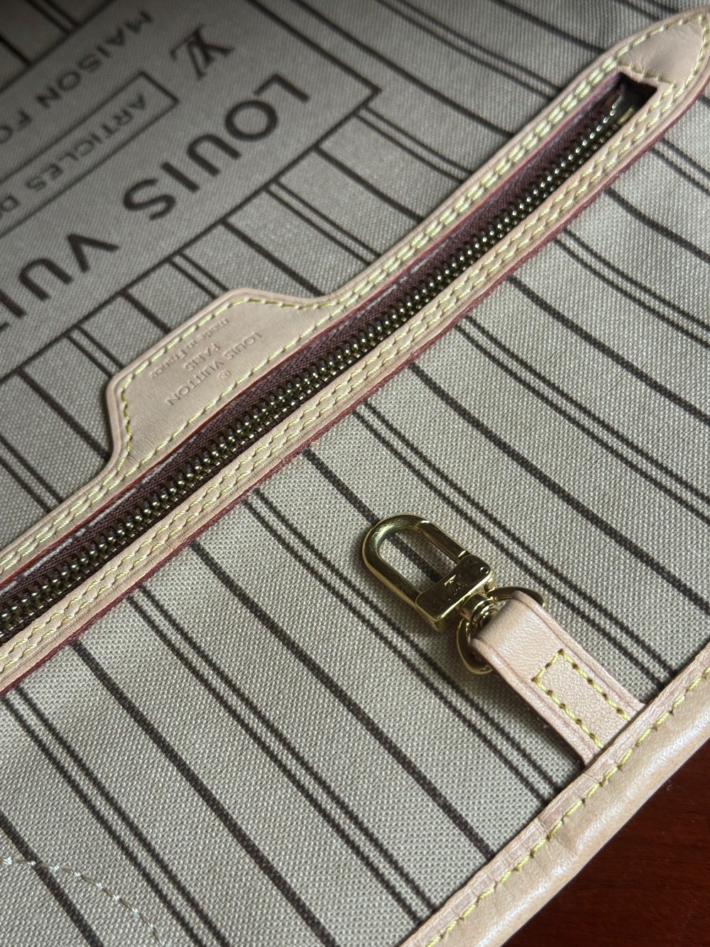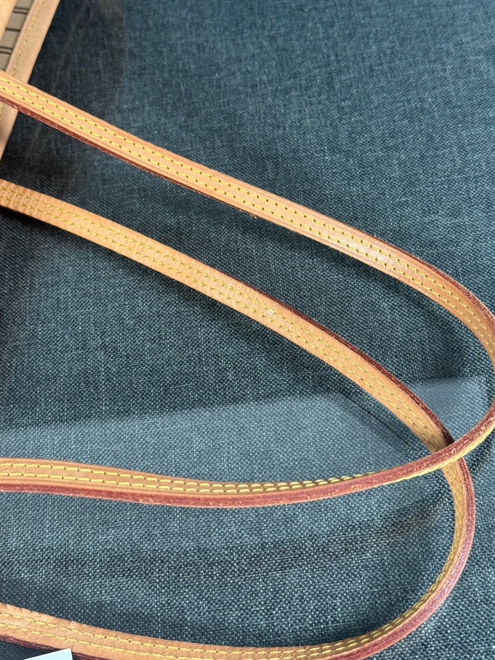 Handle: Wear at resin glazing, darkening, patina of vachetta, liquid marks