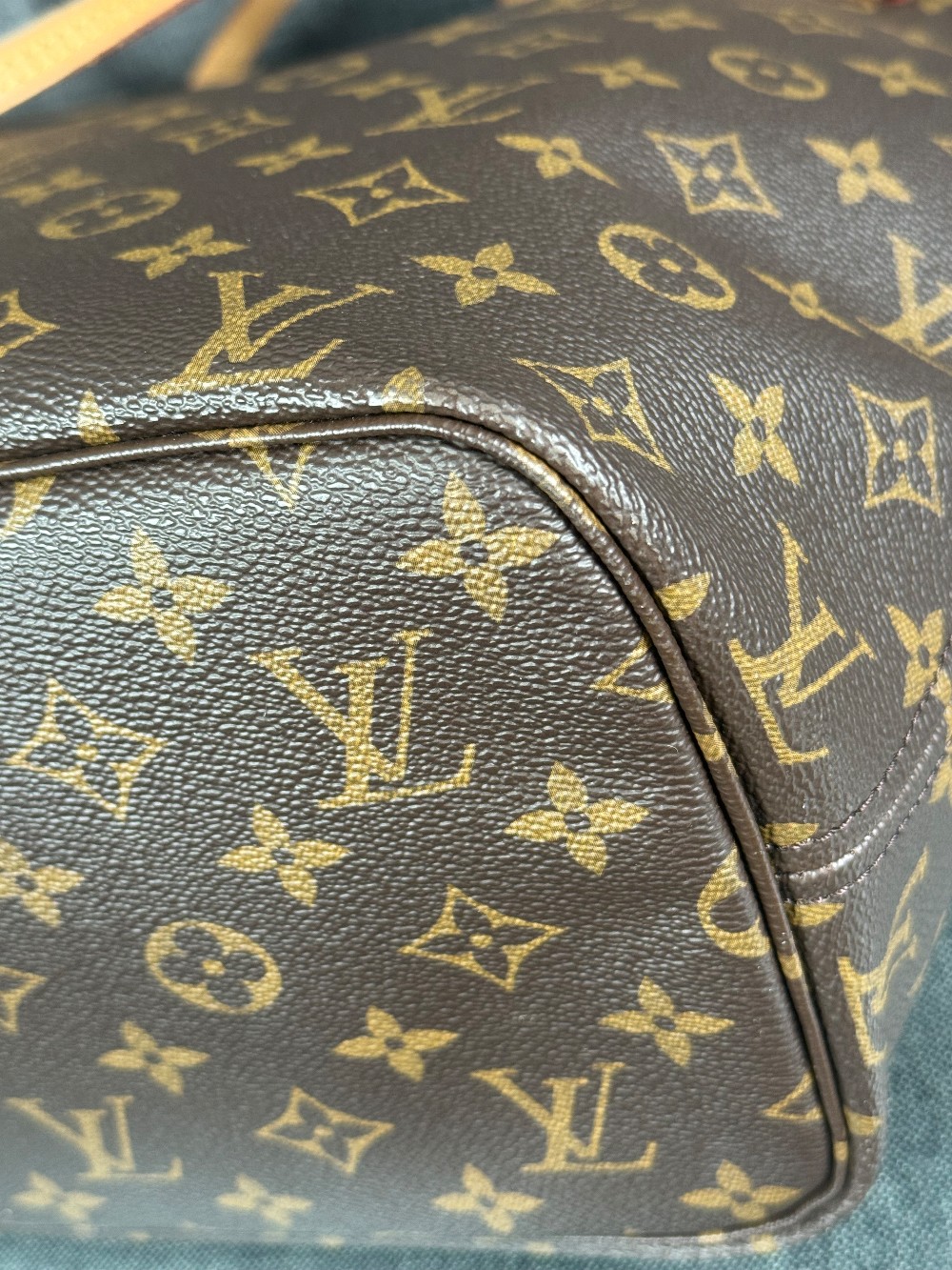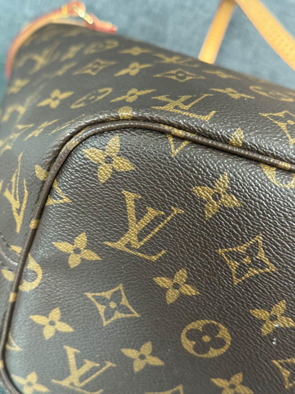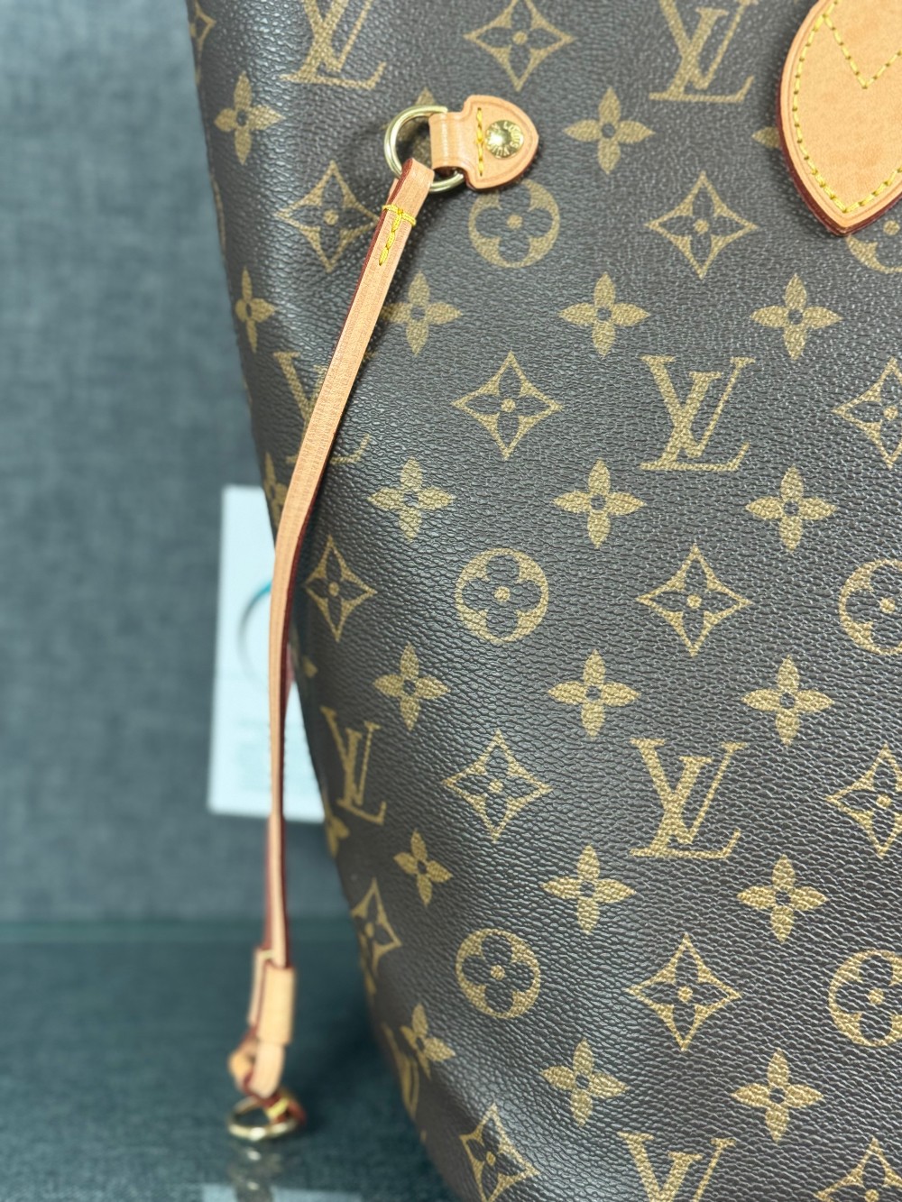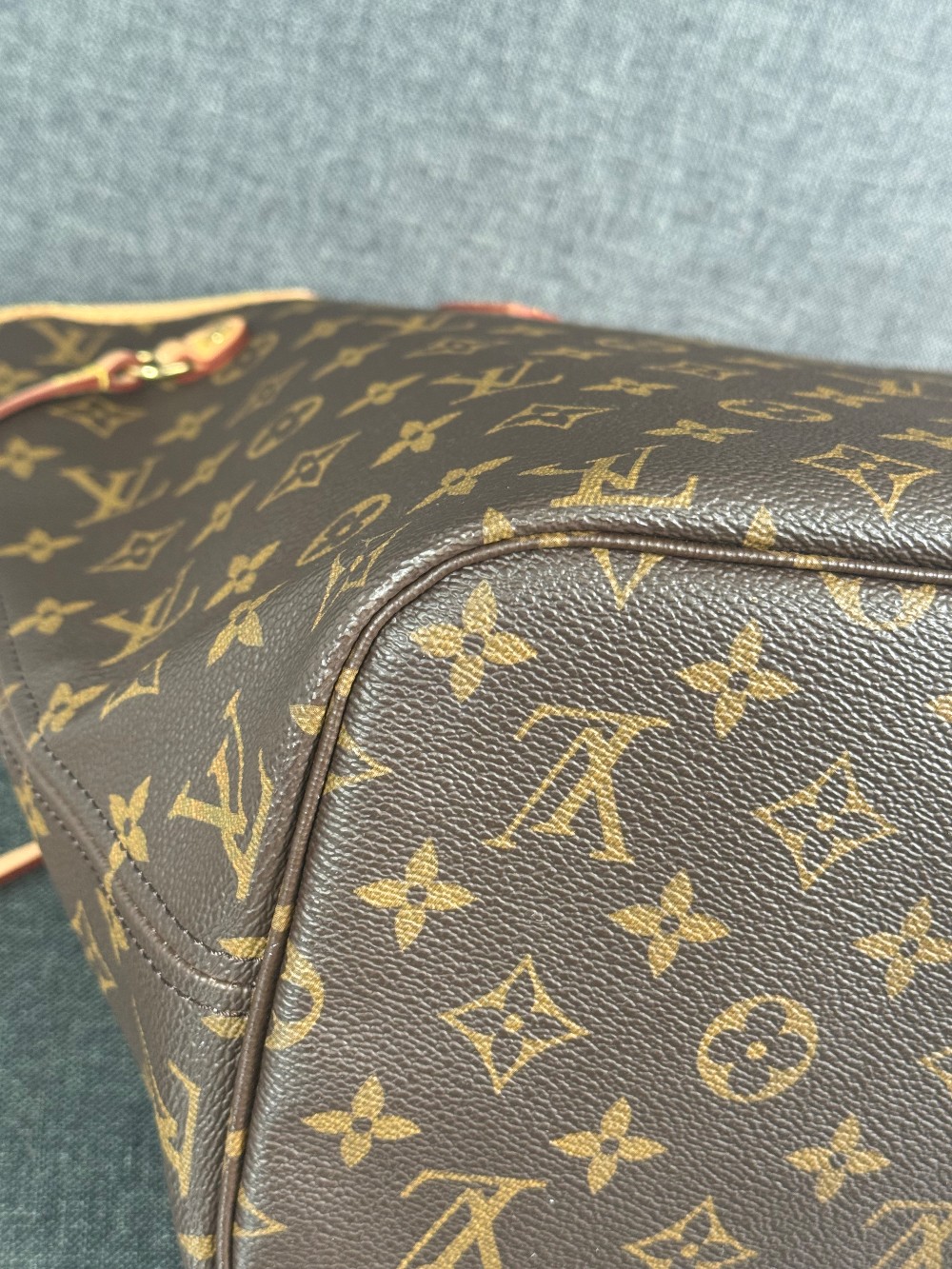 Handle: Wear at resin glazing, darkening, patina of vachetta, liquid marks