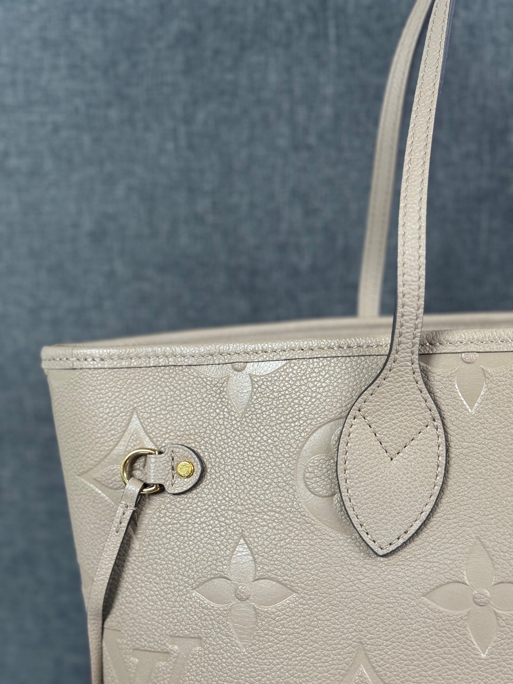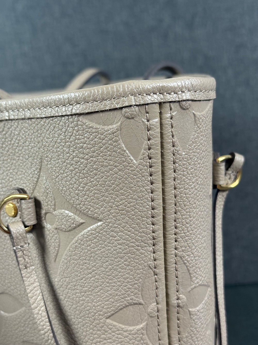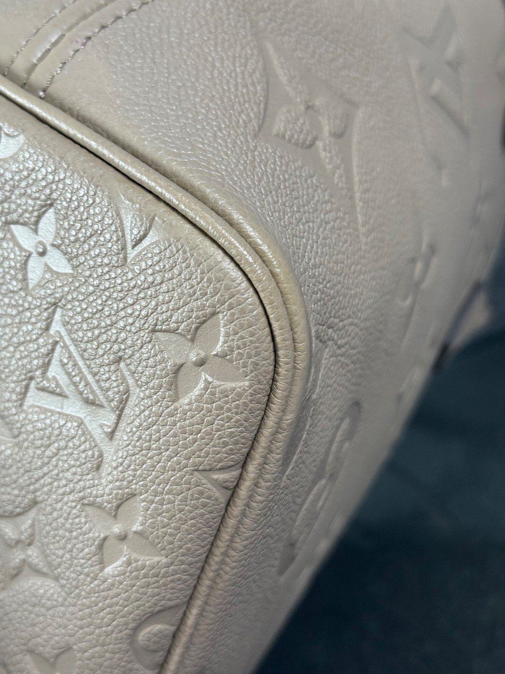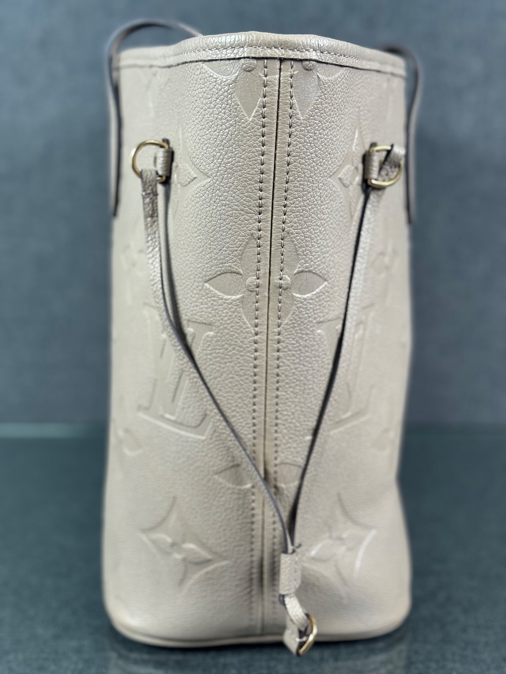 This is an authentic LOUIS VUITTON Empreinte Monogram Giant Neverfull MM in Tourterelle. This beige calfskin tote is crafted of taupe embossed leather with the oversized Louis Vuitton monogram. The bag features matching leather handles, trim, and side cinch cords, with polished gold-toned hardware. The top is open to a dark red microfiber interior with a hanging zipper pocket