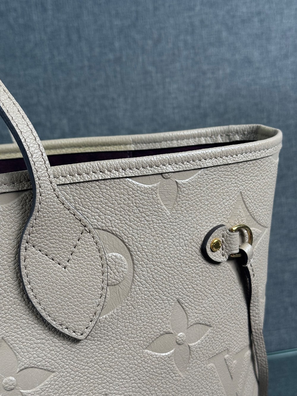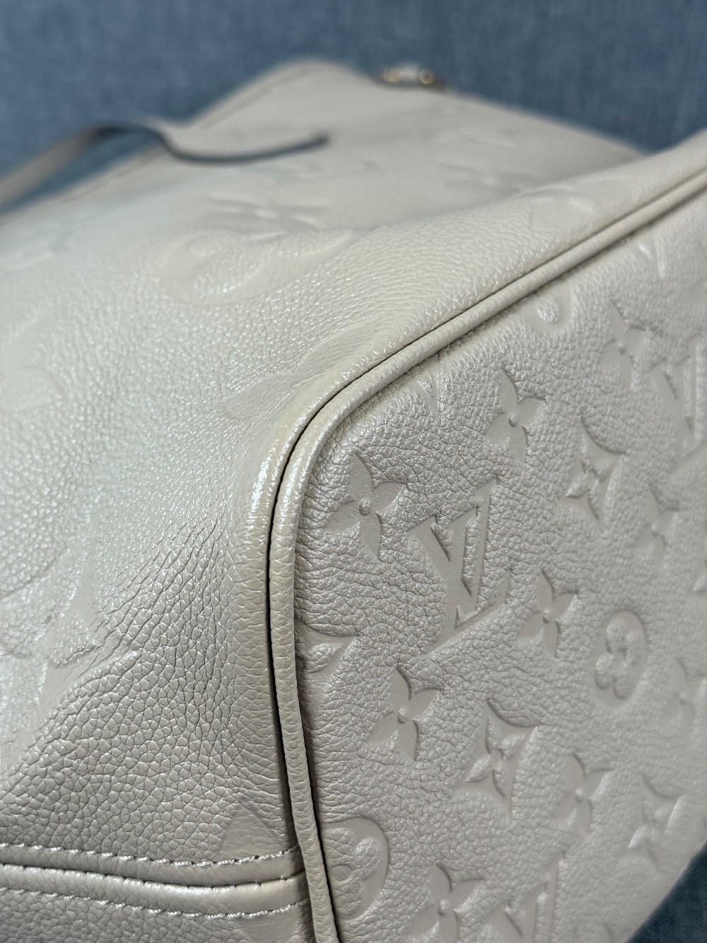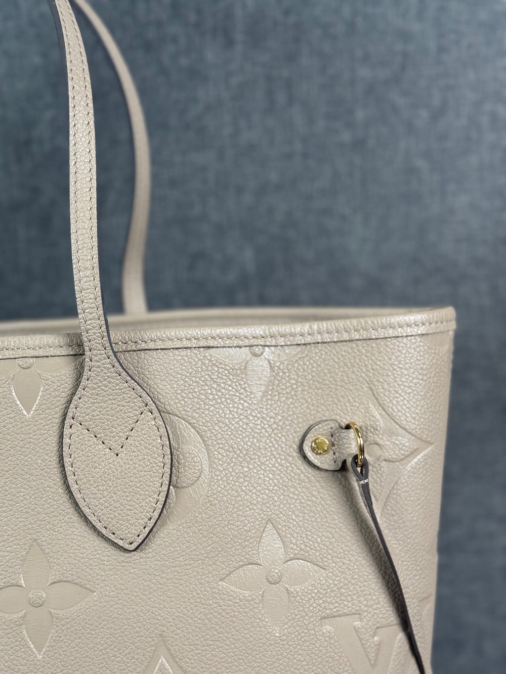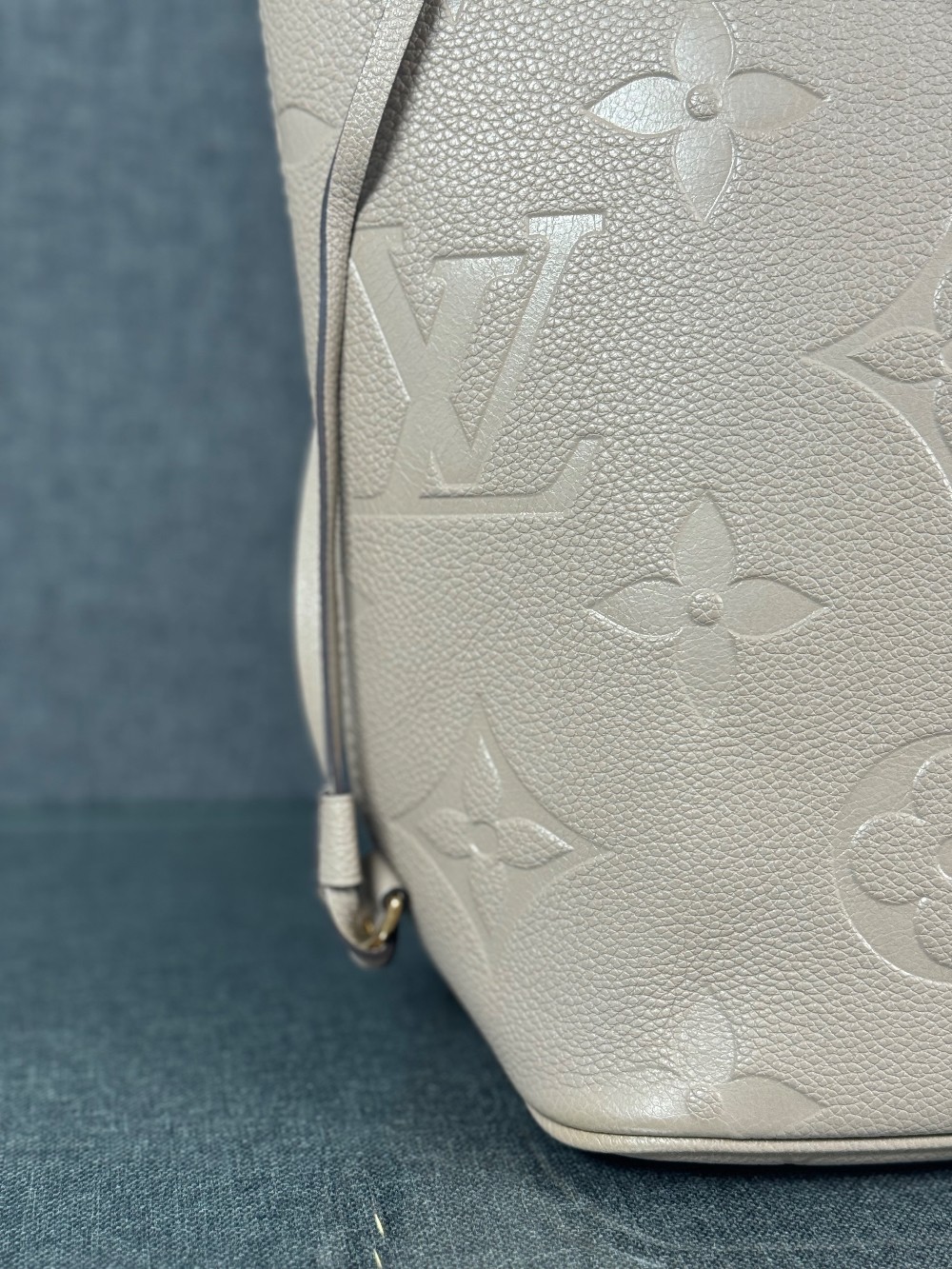 This is an authentic LOUIS VUITTON Empreinte Monogram Giant Neverfull MM in Tourterelle. This beige calfskin tote is crafted of taupe embossed leather with the oversized Louis Vuitton monogram. The bag features matching leather handles, trim, and side cinch cords, with polished gold-toned hardware. The top is open to a dark red microfiber interior with a hanging zipper pocket