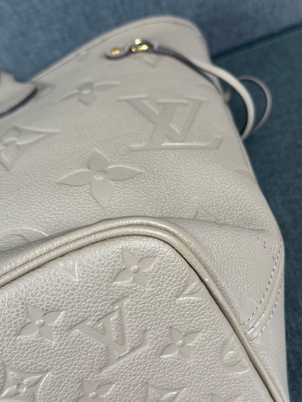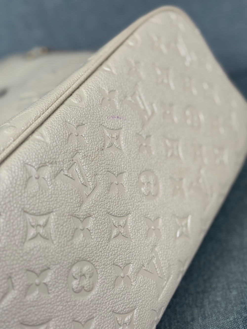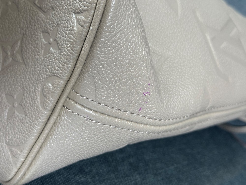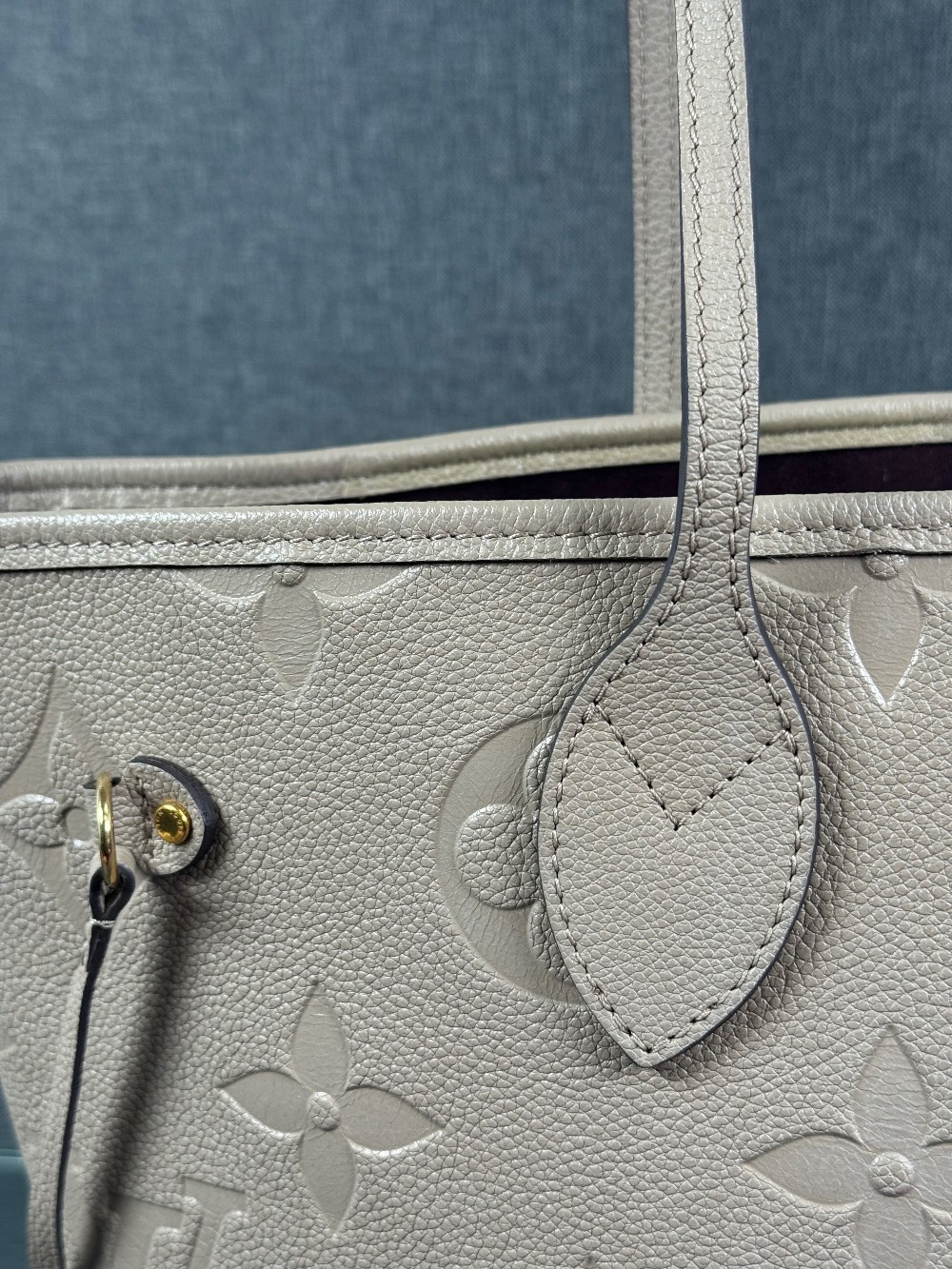 This is an authentic LOUIS VUITTON Empreinte Monogram Giant Neverfull MM in Tourterelle. This beige calfskin tote is crafted of taupe embossed leather with the oversized Louis Vuitton monogram. The bag features matching leather handles, trim, and side cinch cords, with polished gold-toned hardware. The top is open to a dark red microfiber interior with a hanging zipper pocket