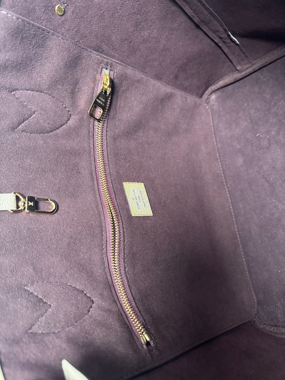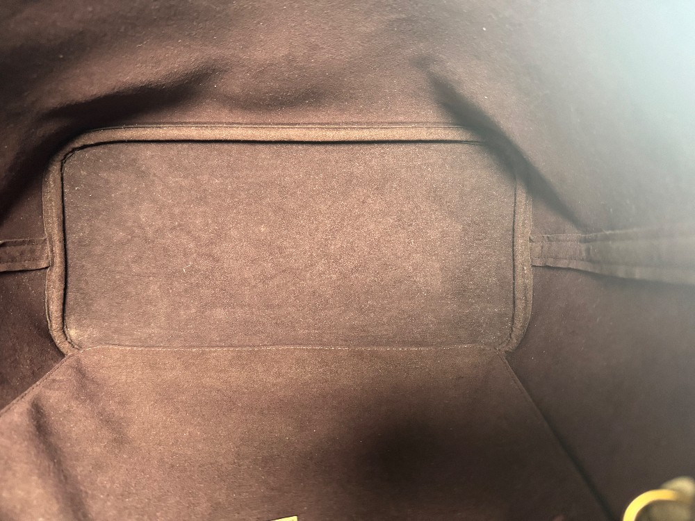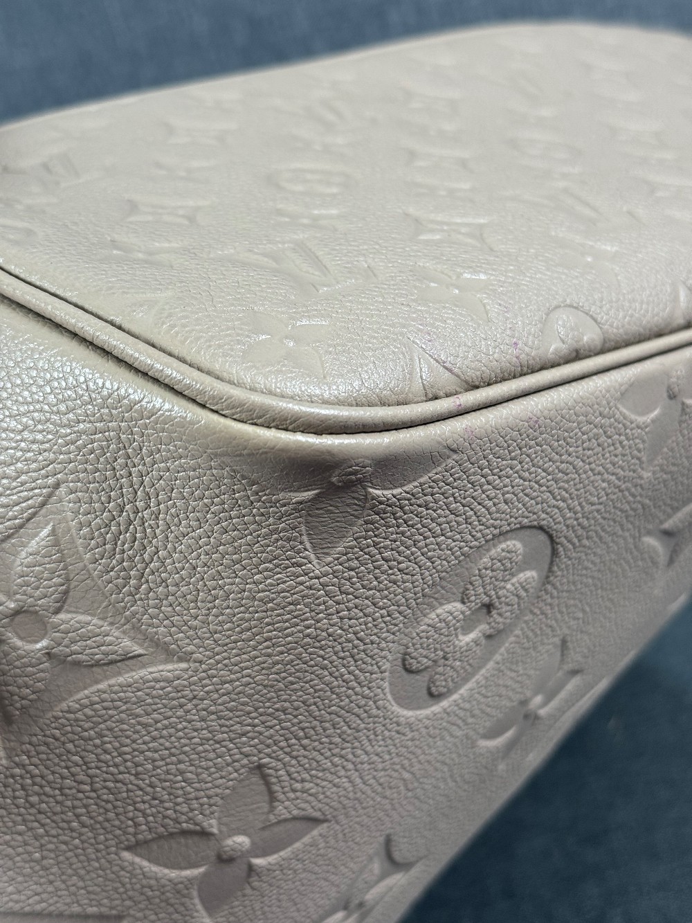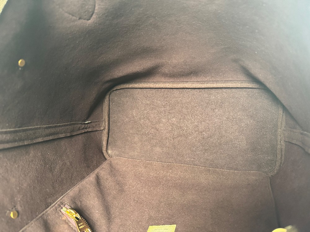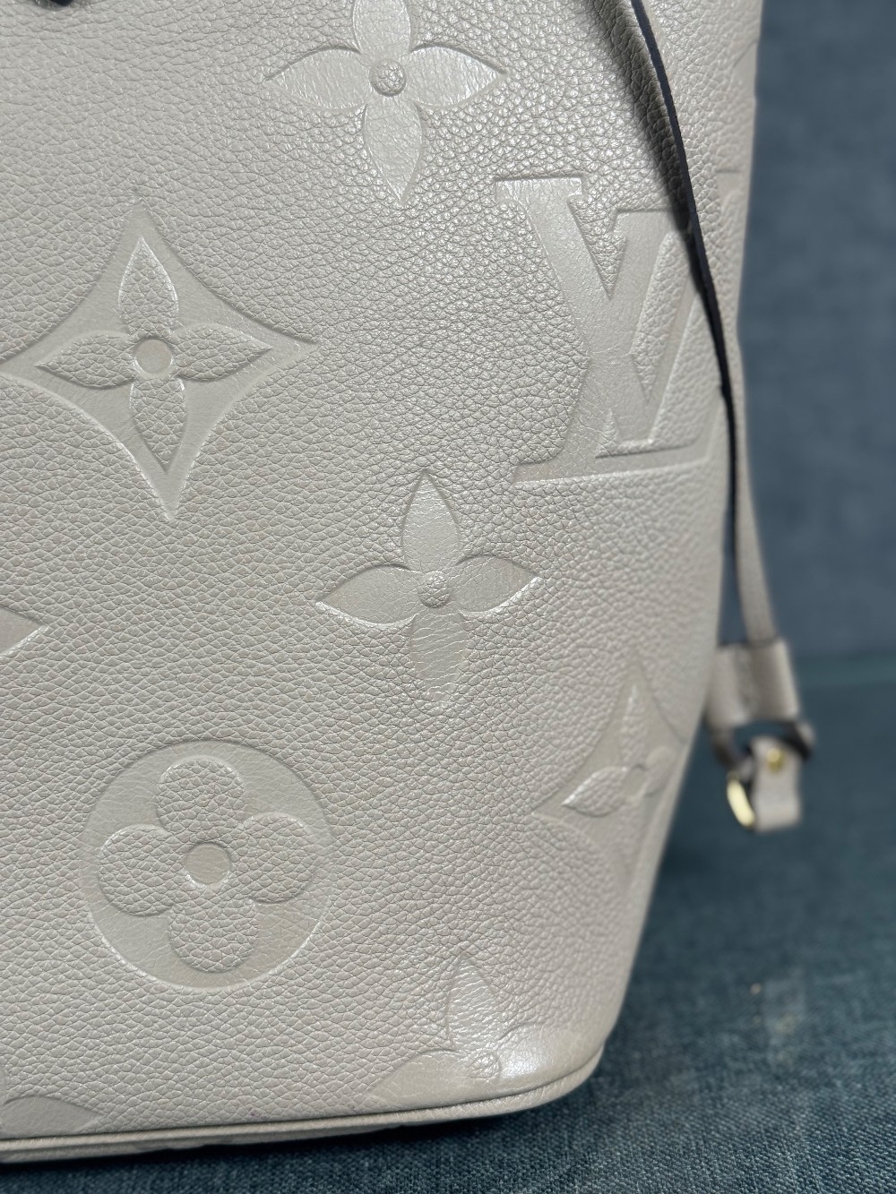 This is an authentic LOUIS VUITTON Empreinte Monogram Giant Neverfull MM in Tourterelle. This beige calfskin tote is crafted of taupe embossed leather with the oversized Louis Vuitton monogram. The bag features matching leather handles, trim, and side cinch cords, with polished gold-toned hardware. The top is open to a dark red microfiber interior with a hanging zipper pocket