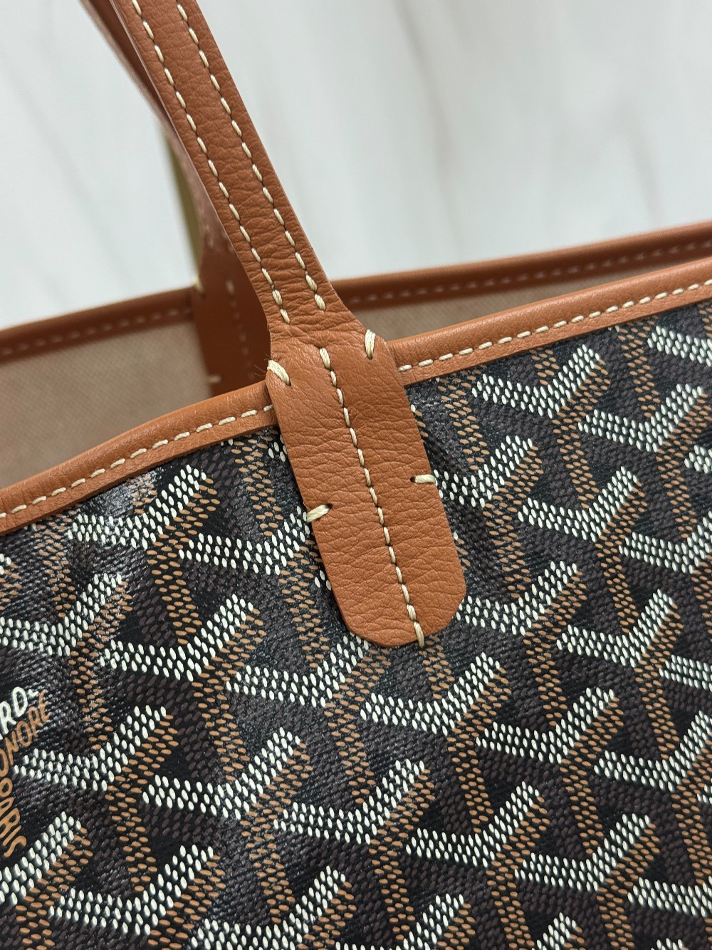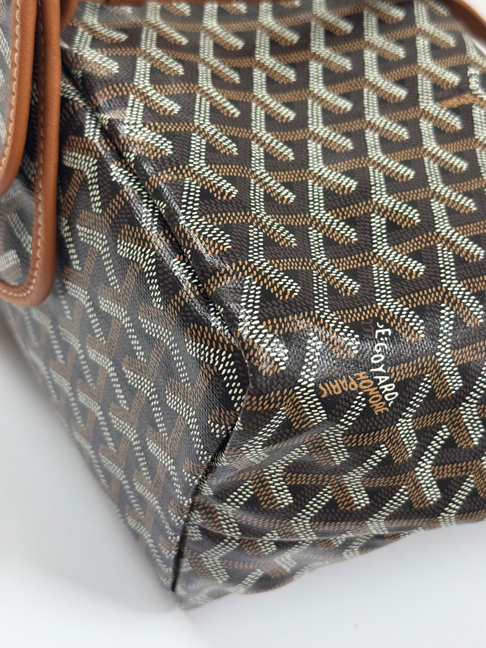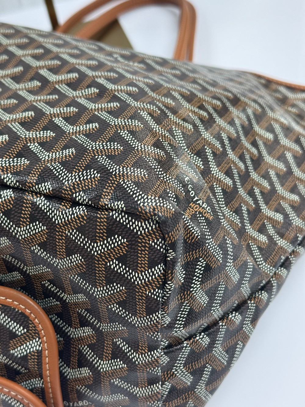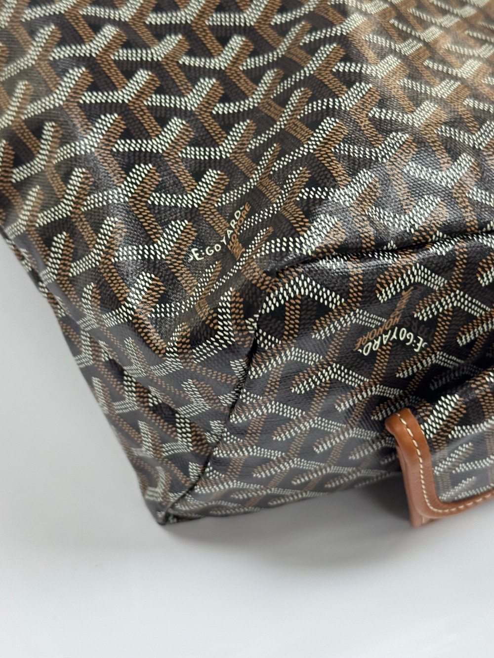 This is an authentic GOYARD Goyardine Isabelle PM in Black and Gold. This stylish tote is crafted of traditional Goyard goyardine chevron on black canvas. The bag has a brown leather trim along the top with matching leather handles. The top is open to a beige canvas interior with a matching removable pouch.