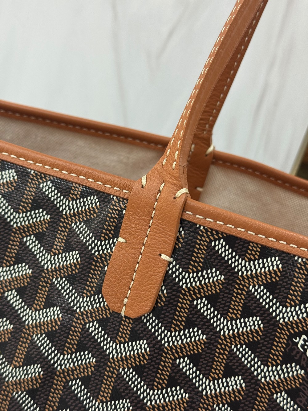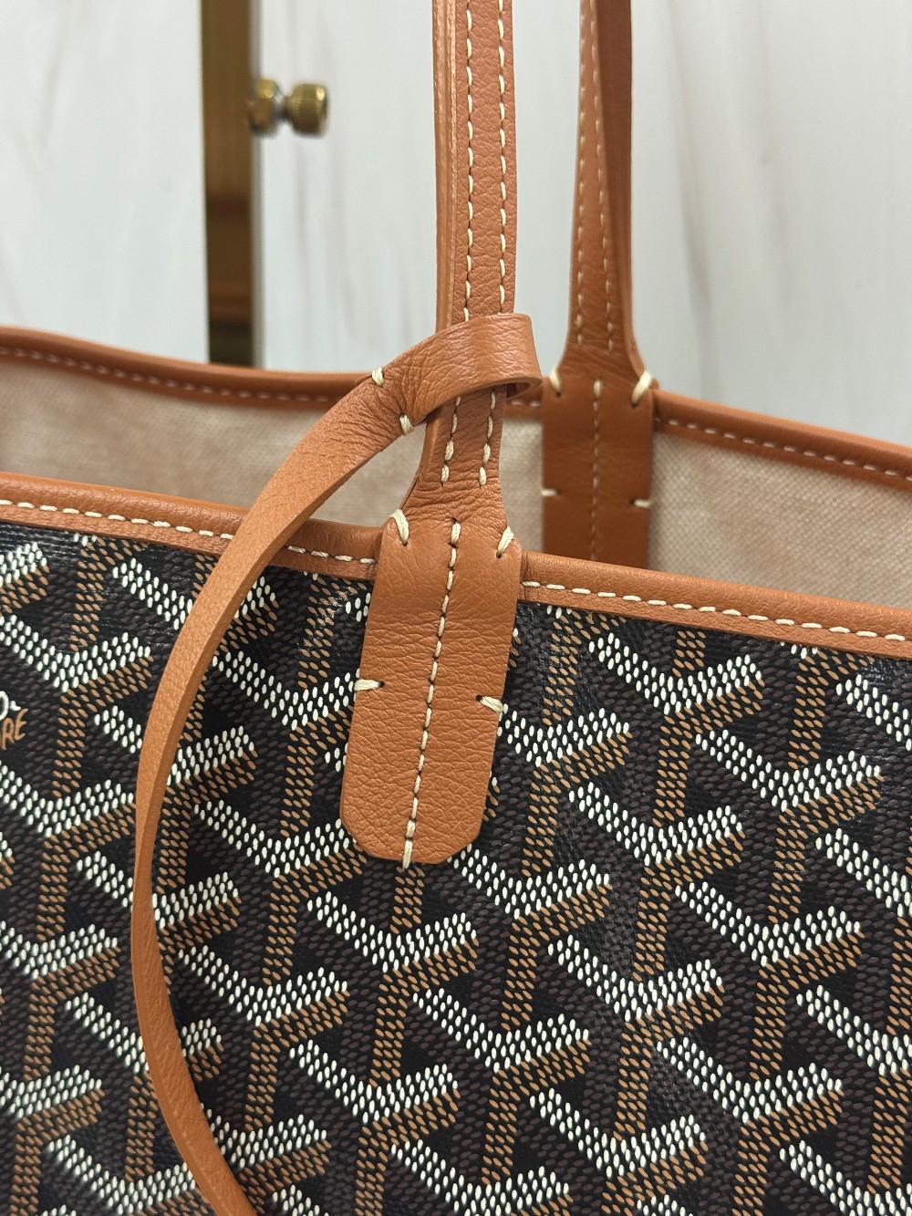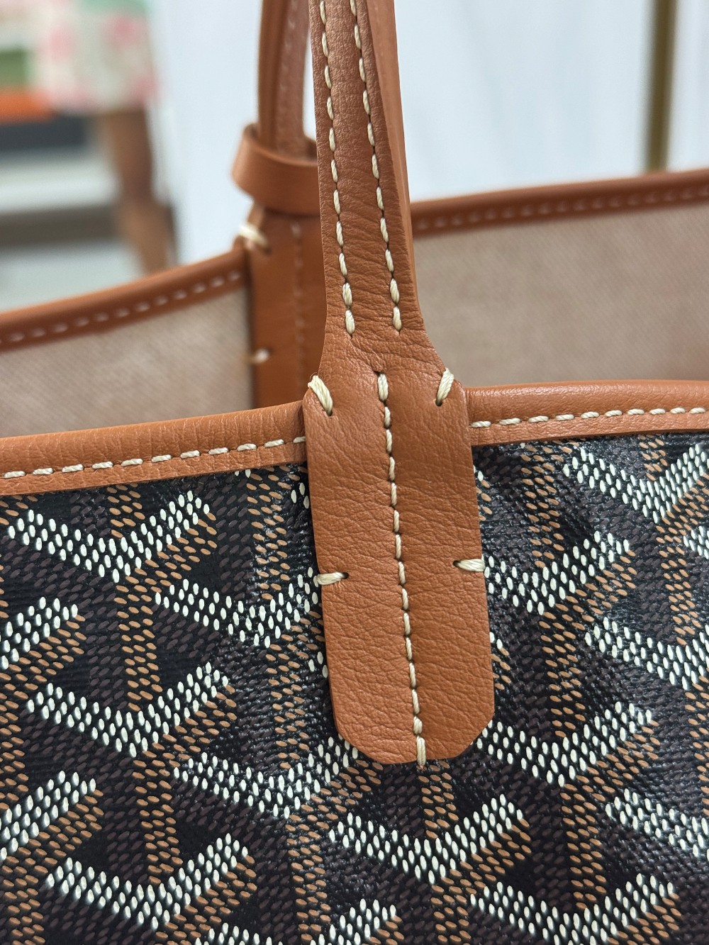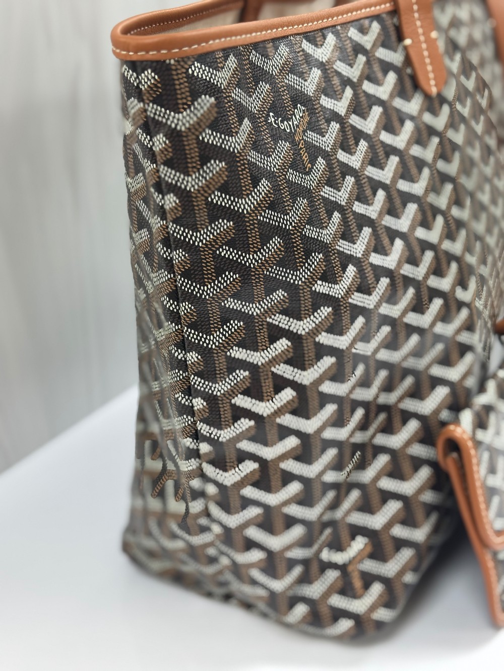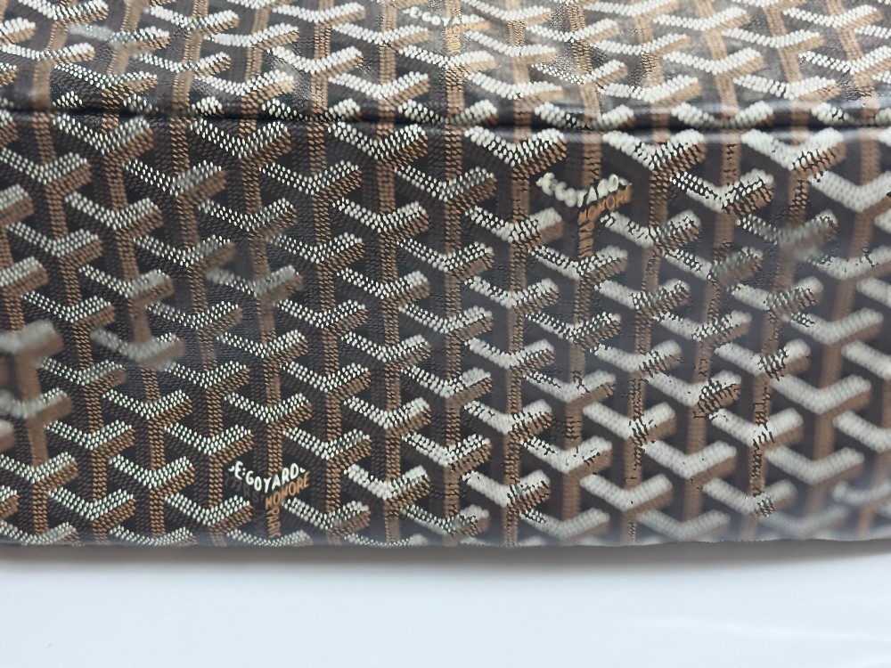 This is an authentic GOYARD Goyardine Isabelle PM in Black and Gold. This stylish tote is crafted of traditional Goyard goyardine chevron on black canvas. The bag has a brown leather trim along the top with matching leather handles. The top is open to a beige canvas interior with a matching removable pouch.