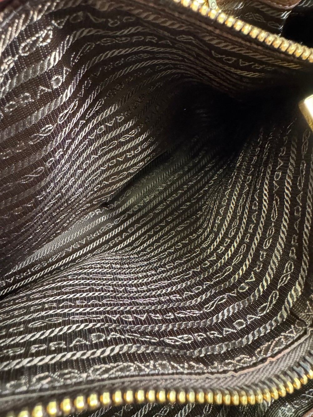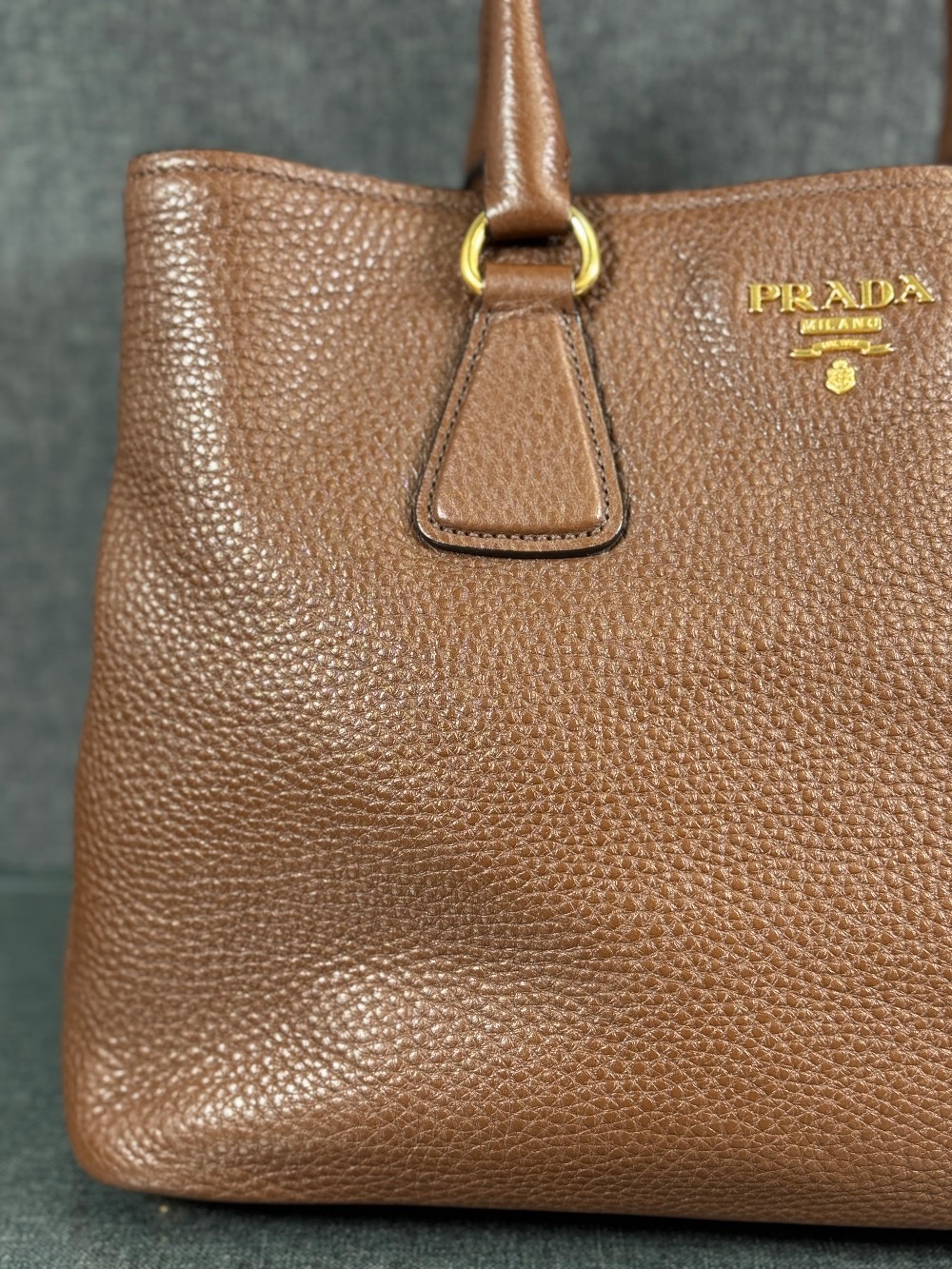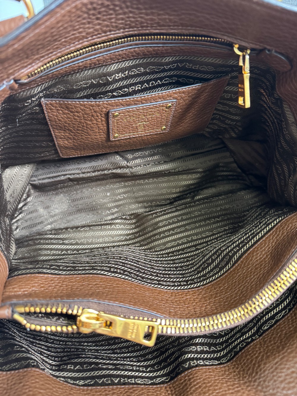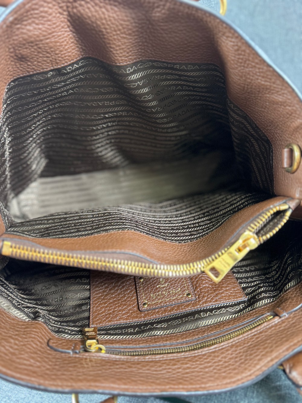 This is an authentic PRADA Vitello Daino Zip Tote in Cannella. This is a luxuriously textured calfskin leather tote in brown. This shoulder bag features rolled leather handles with polished gold links and includes an optional adjustable leather shoulder strap. The top opens to a partitioned brown Prada monogram jacquard fabric interior with a central zipper compartment, zipper and patch pockets.
