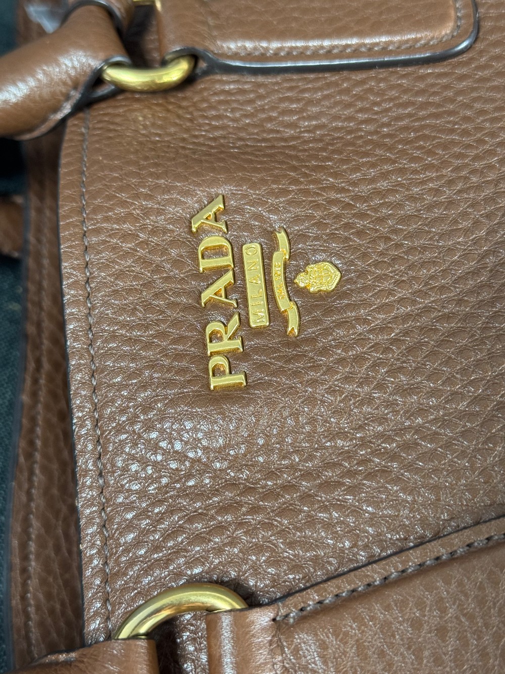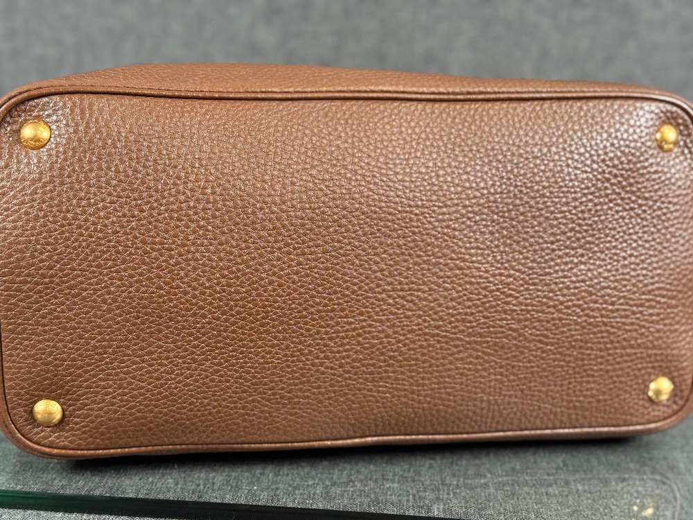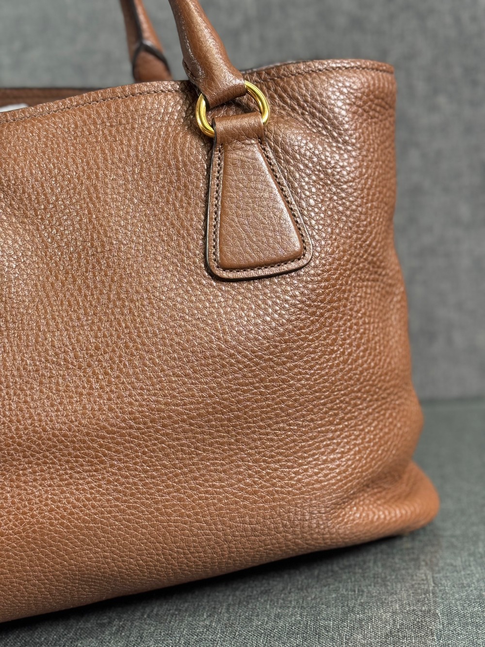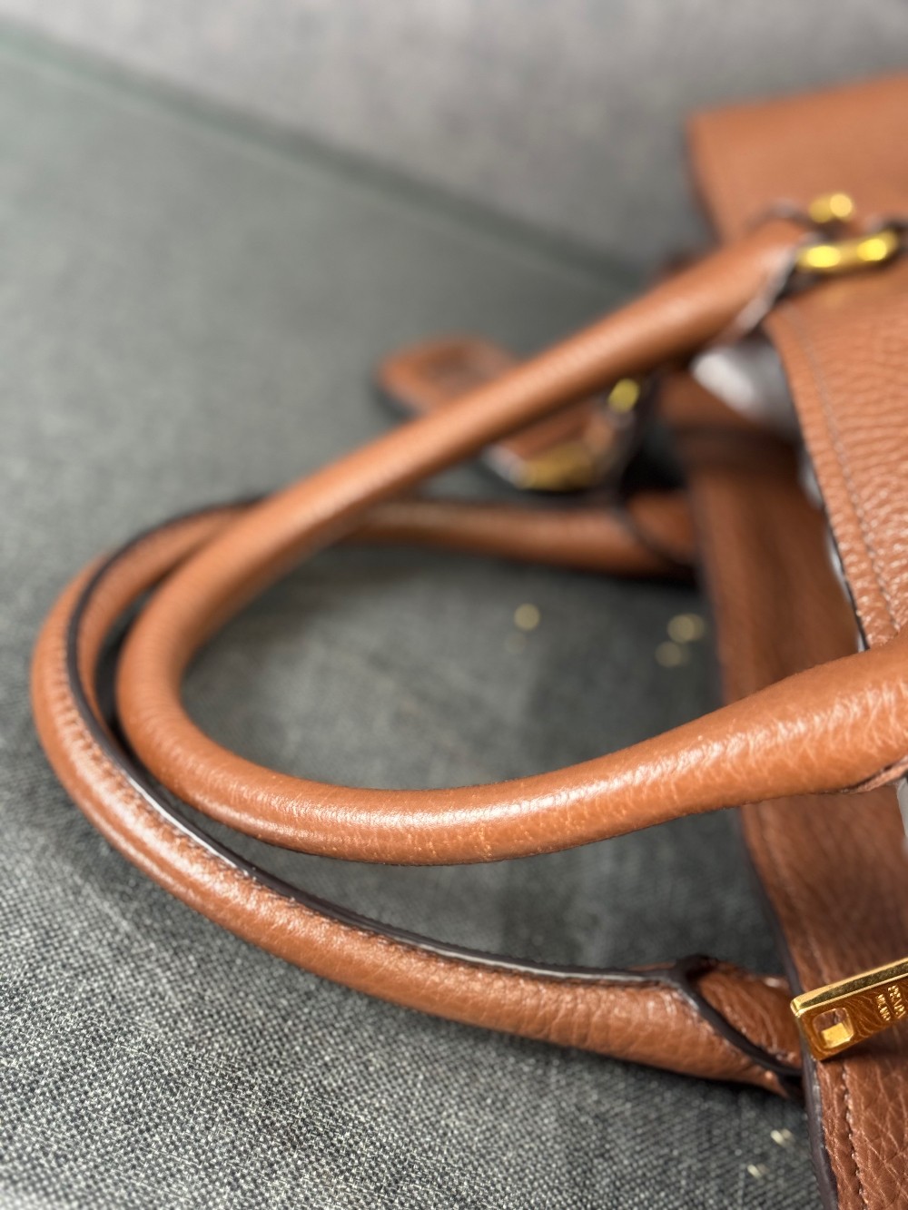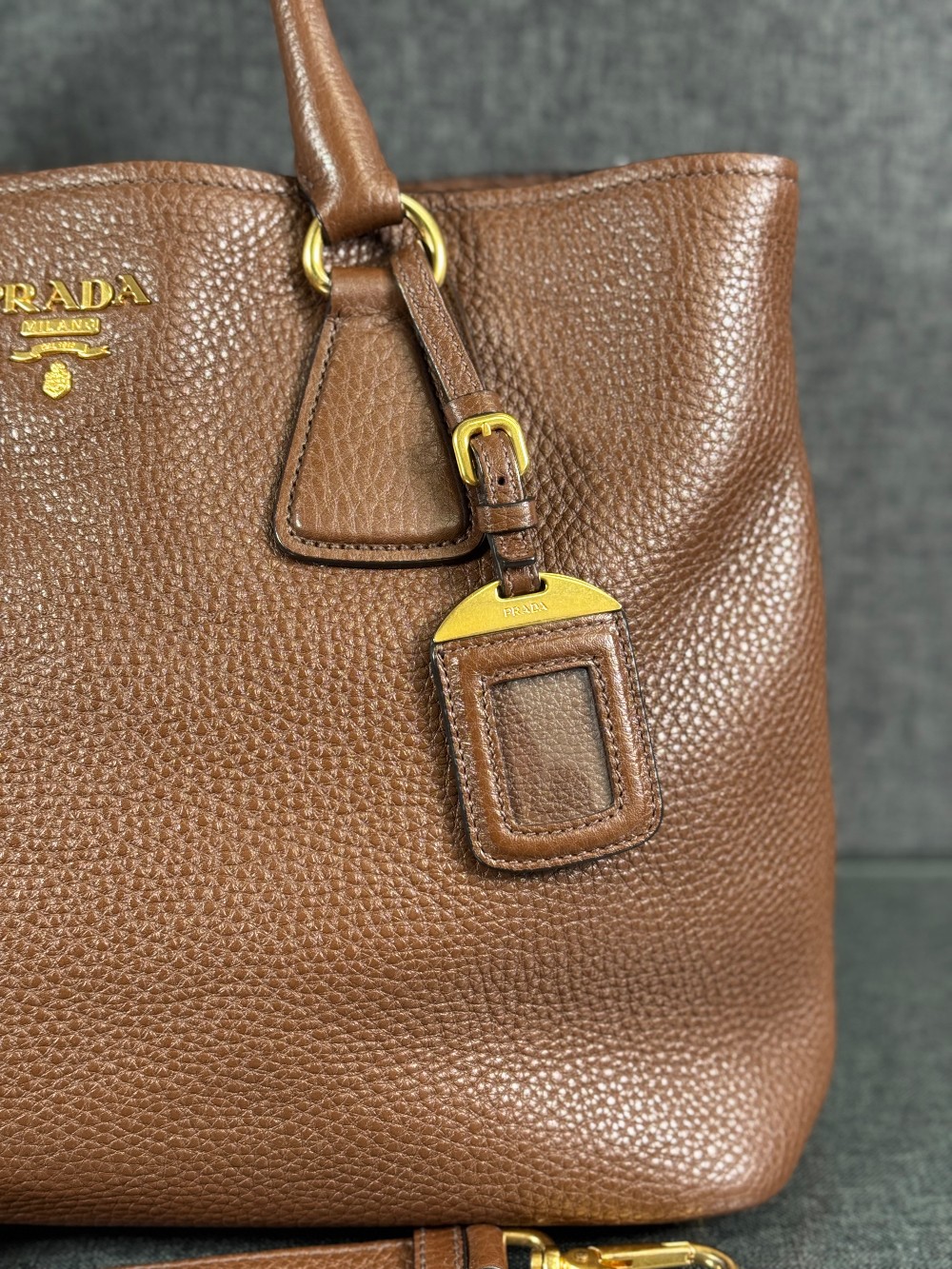 This is an authentic PRADA Vitello Daino Zip Tote in Cannella. This is a luxuriously textured calfskin leather tote in brown. This shoulder bag features rolled leather handles with polished gold links and includes an optional adjustable leather shoulder strap. The top opens to a partitioned brown Prada monogram jacquard fabric interior with a central zipper compartment, zipper and patch pockets.