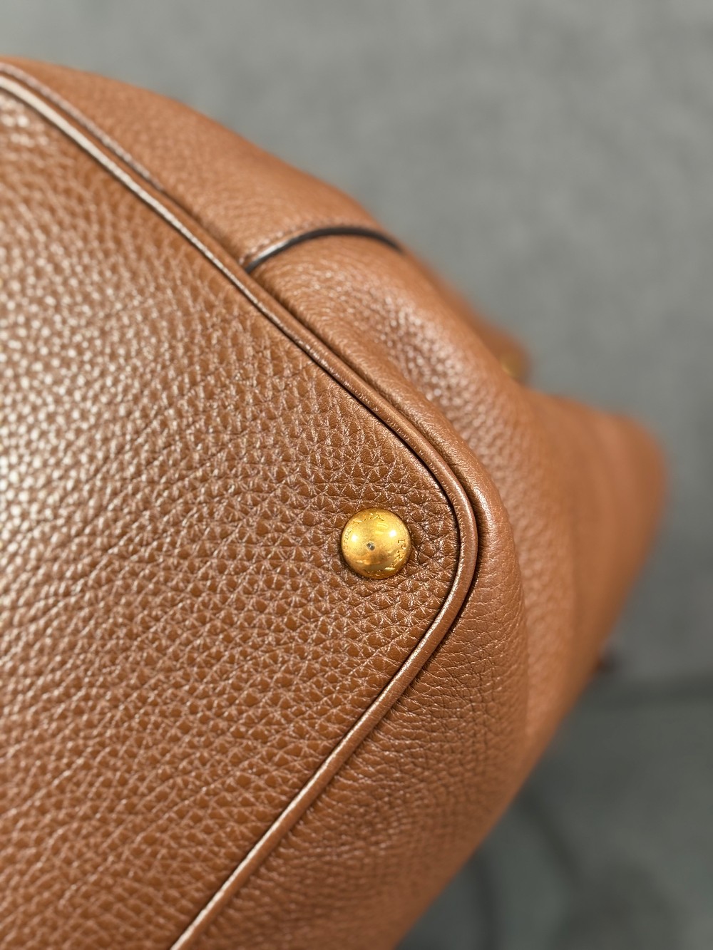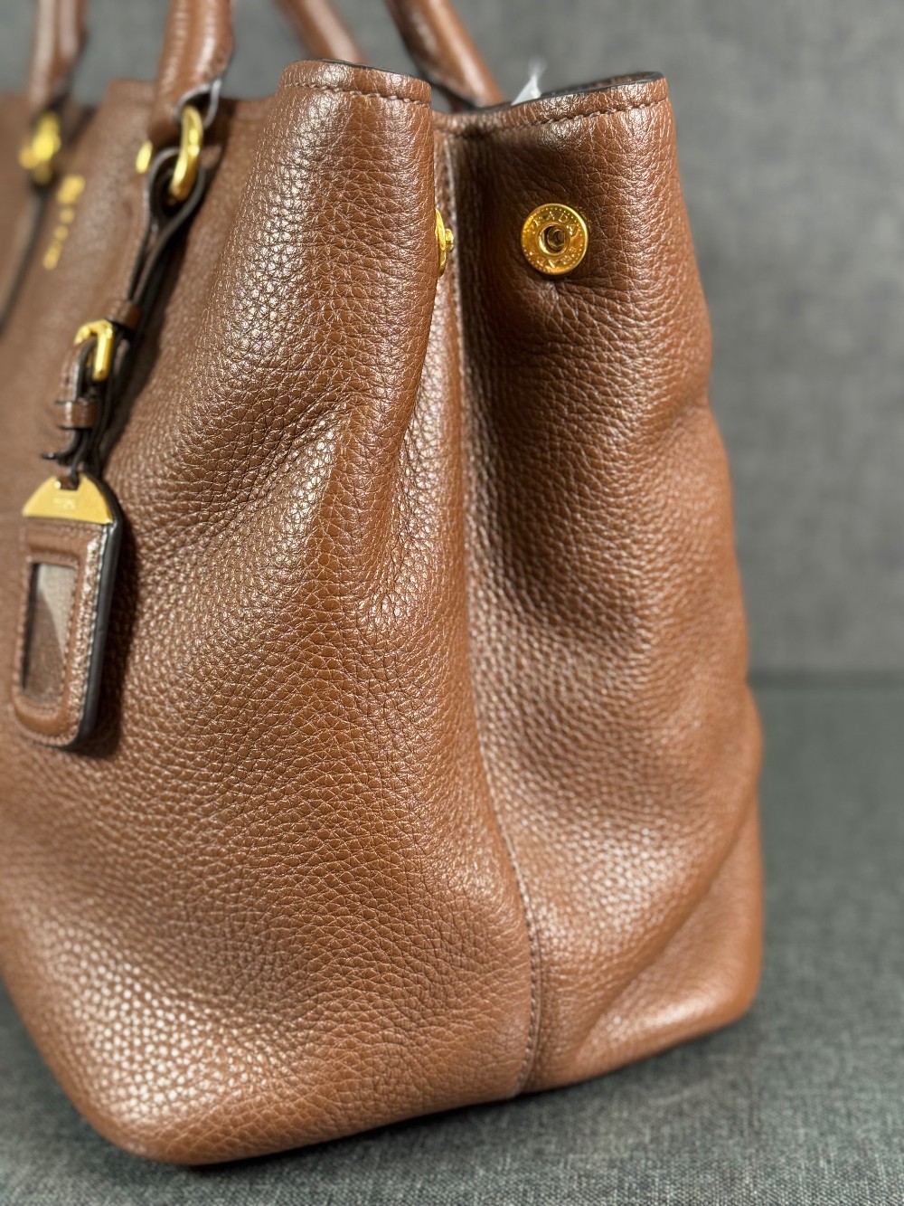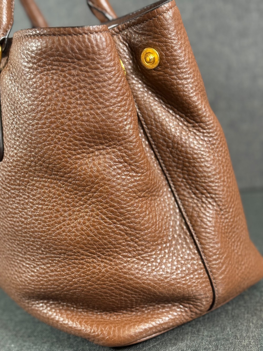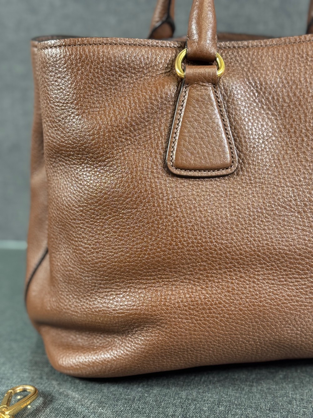 This is an authentic PRADA Vitello Daino Zip Tote in Cannella. This is a luxuriously textured calfskin leather tote in brown. This shoulder bag features rolled leather handles with polished gold links and includes an optional adjustable leather shoulder strap. The top opens to a partitioned brown Prada monogram jacquard fabric interior with a central zipper compartment, zipper and patch pockets.