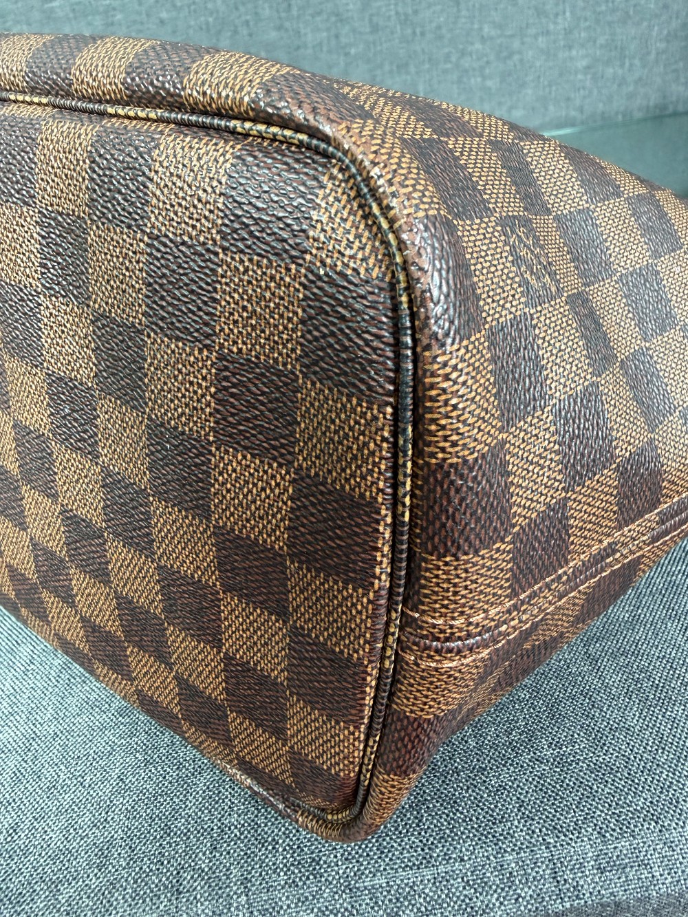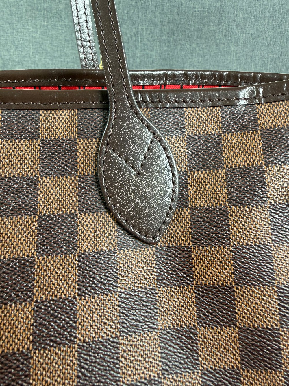This is an authentic LOUIS VUITTON Damier Ebene Neo Neverfull MM. This chic tote bag is crafted of classic Louis Vuitton Damier checkerboard canvas. The bag features dark brown cowhide leather shoulder straps, trim, and gold hardware. The top is open to an interior of rouge red striped fabric with a hanging zipper pocket.