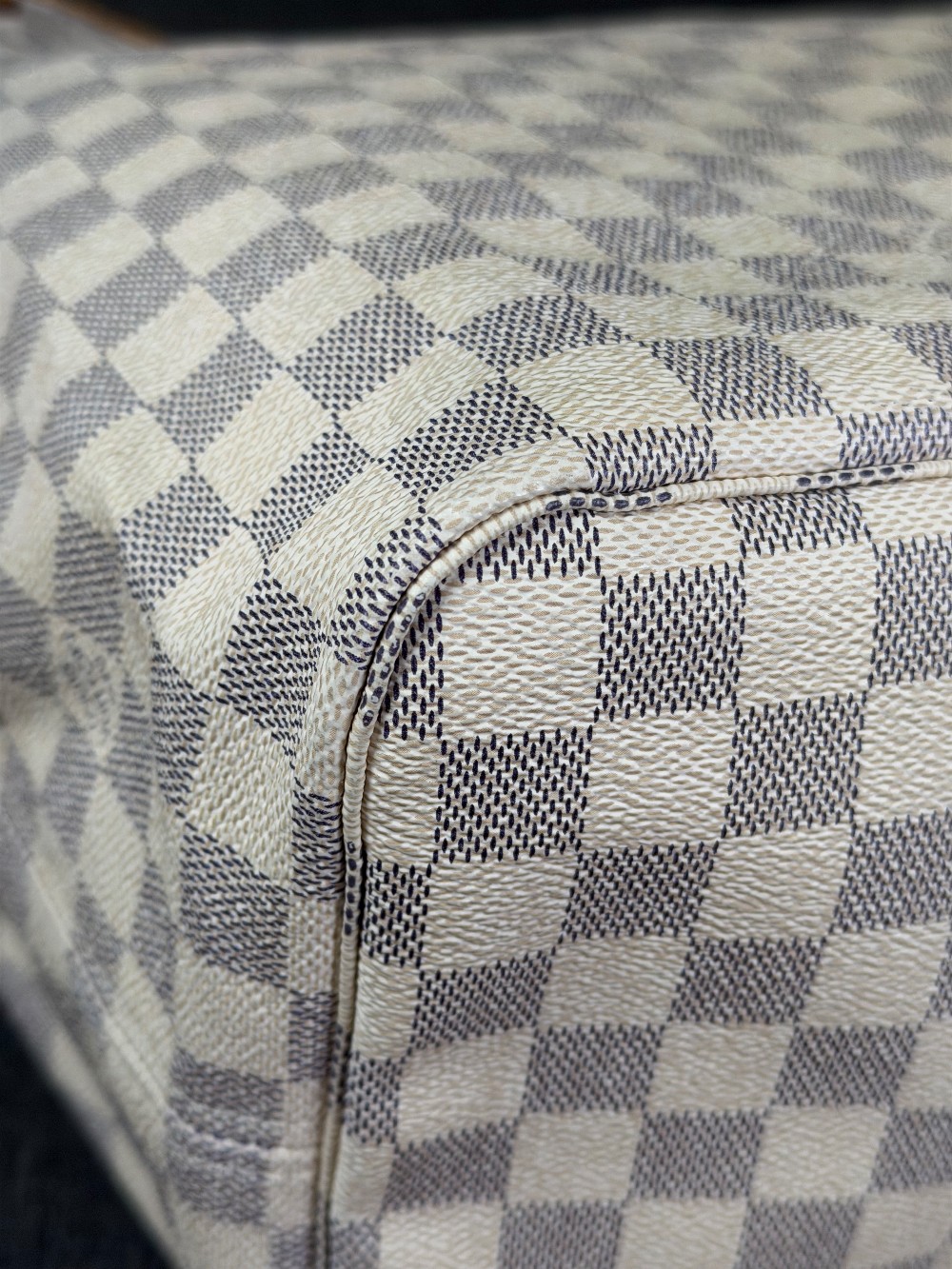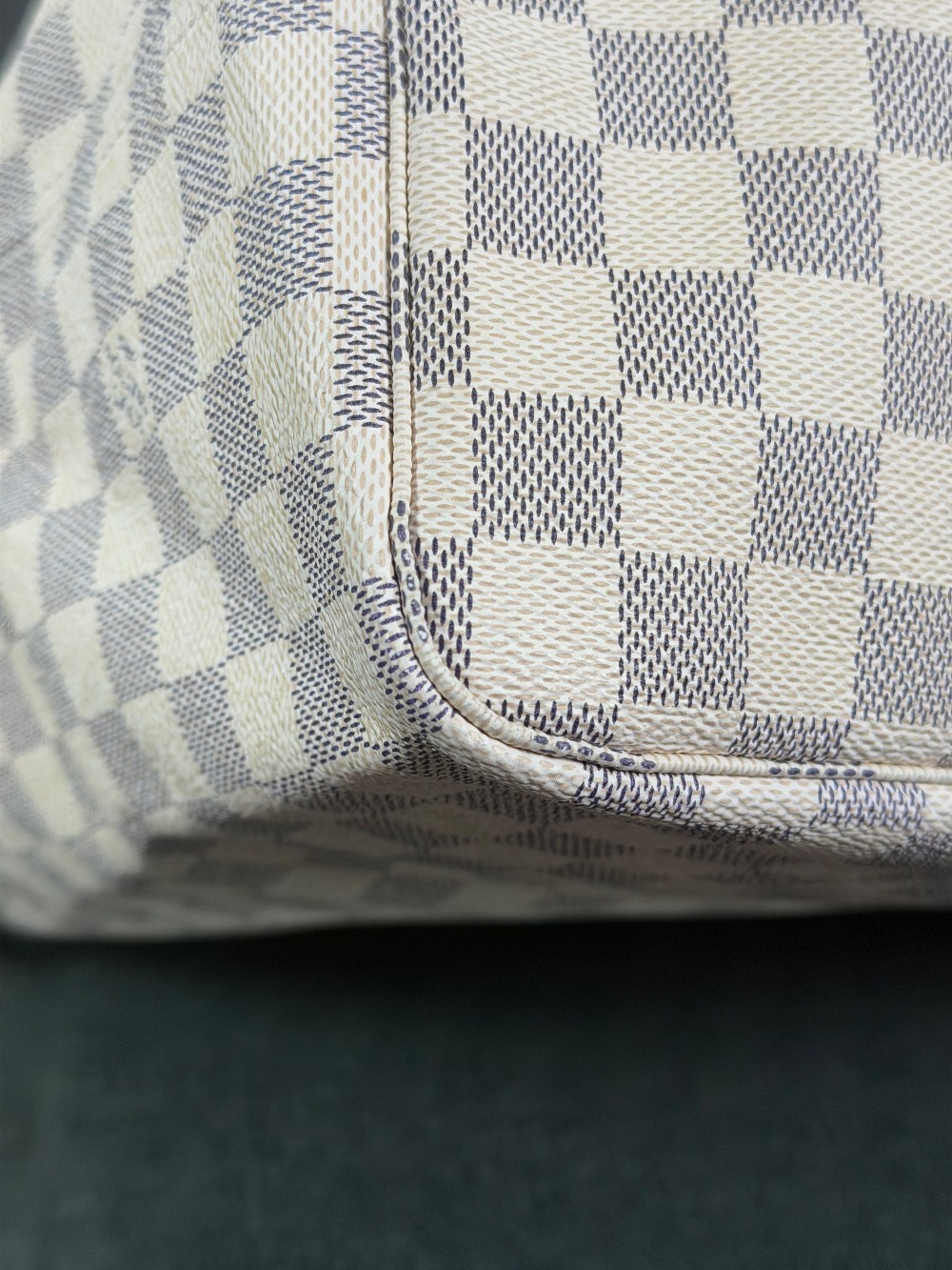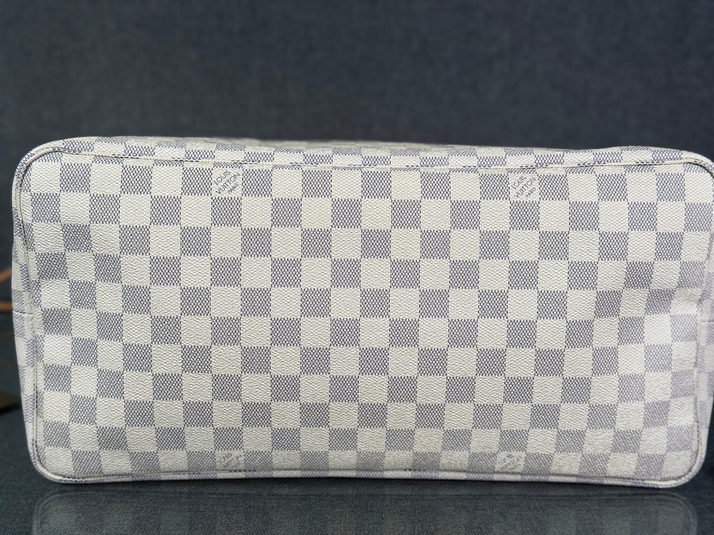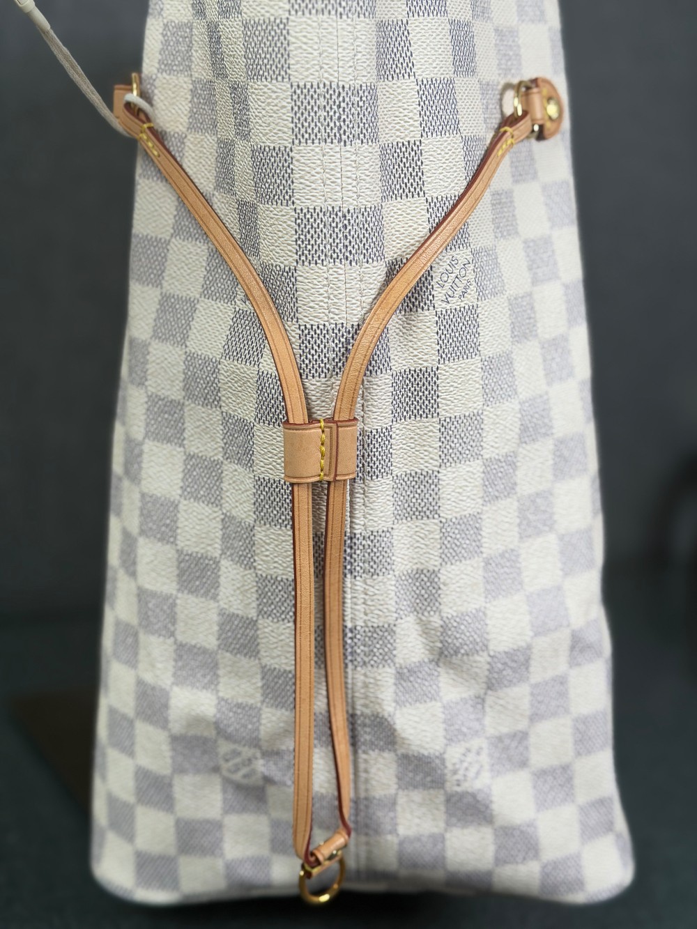 This is an authentic LOUIS VUITTON Damier Azur Neverfull GM in Rose Beige . This chic tote is crafted of Louis Vuitton's signature checkerboard coated canvas in blue and white. It features vachetta cowhide leather trim, shoulder straps, and side cinch cords with polished brass hardware. The top is open to a Beige striped fabric interior with a hanging zipper pocket, d-ring,
