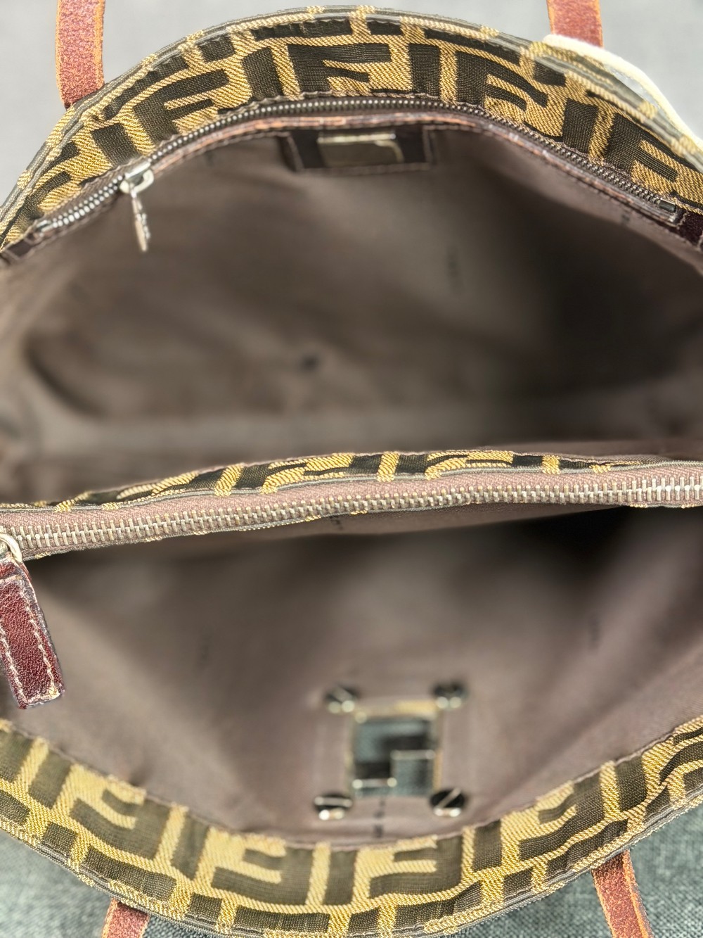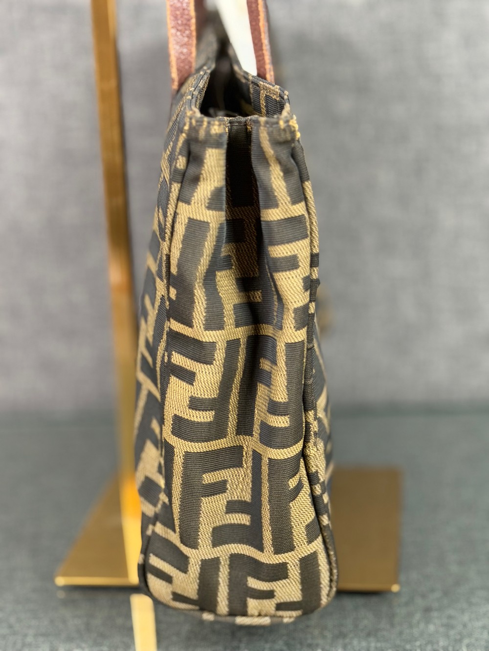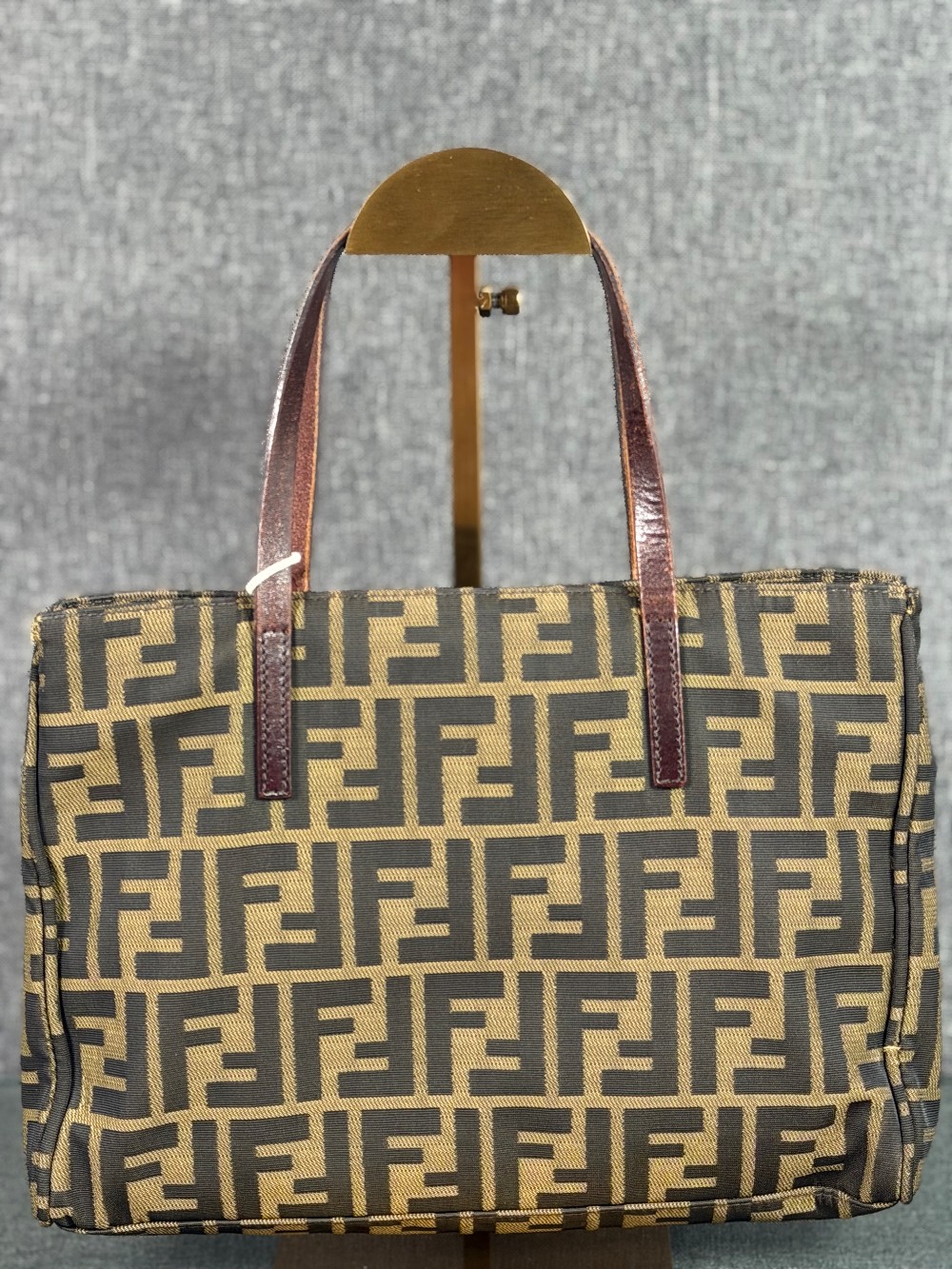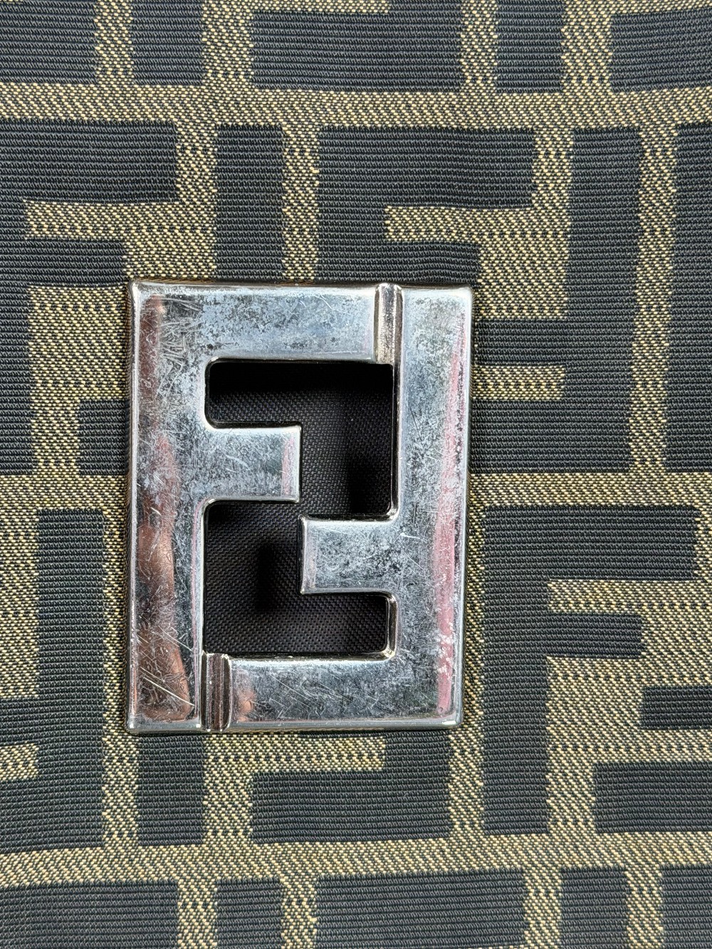 The material features the all-over brown and tan FF logo print (Zucca pattern) on canvas.